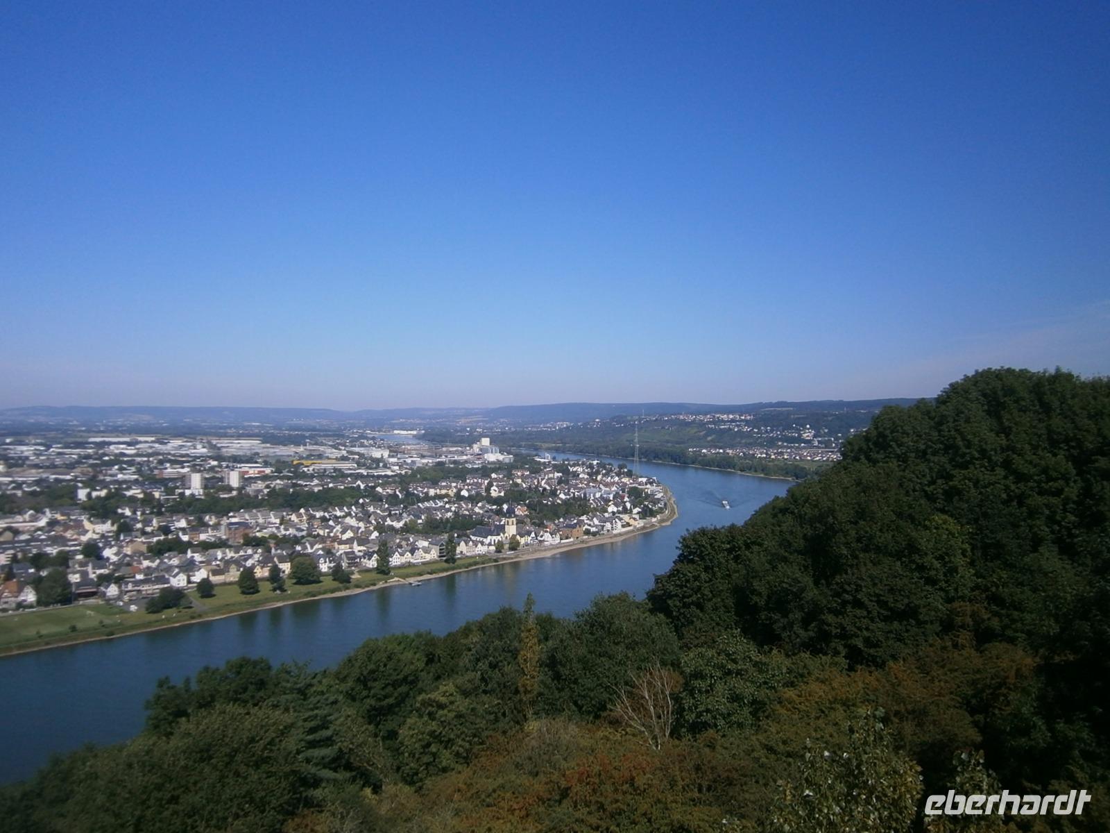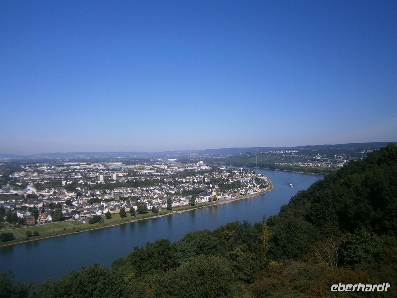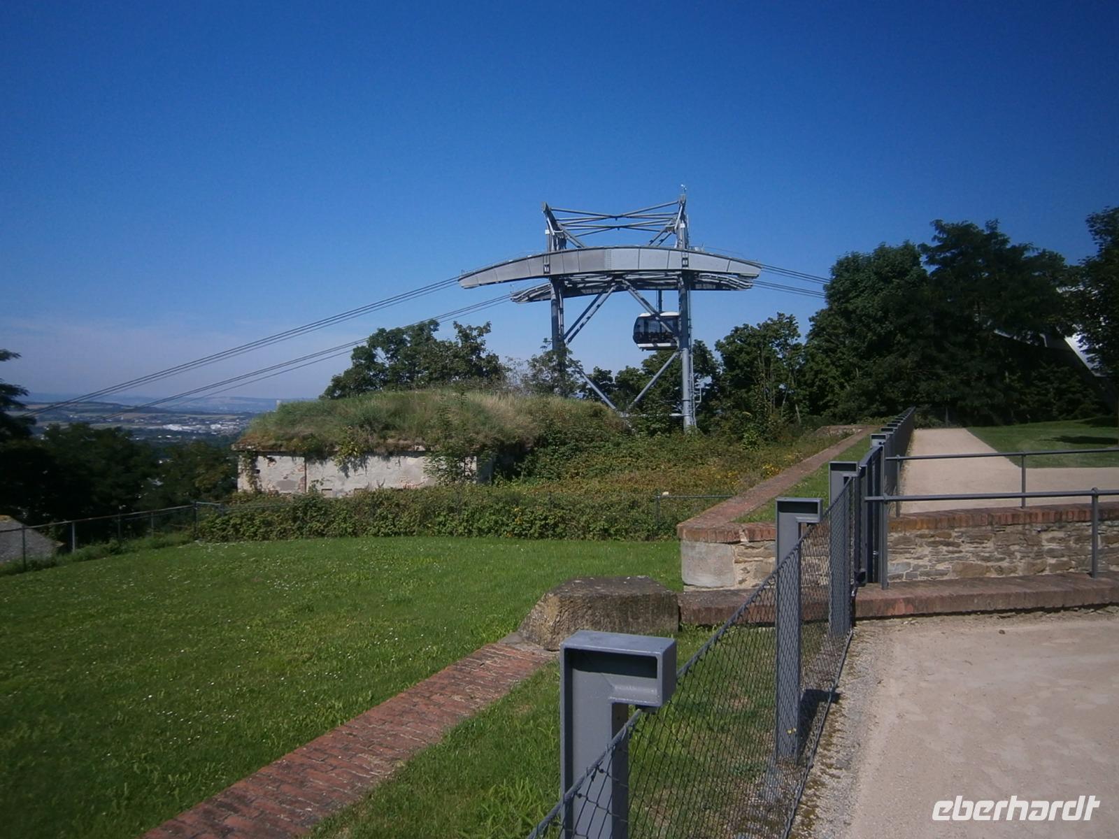 Mit der zur „Buga" eingeweihten Kabinenseilbahn schwebten wir über dem Rhein zu dieser Sehenswürdigkeit. Oben erwartet den Besucher ein großes Hochplateau, welches früher ein Truppenübungsplatz gewesen war. Anläßlich der „Buga" wurde er umgestaltet und mit Spazierwegen und Aussichtspunkt versehen. Auf dieser Ebene befindet sich auch der Haupteingang in die Festung, die 1817 von Preußen zu einer wehrhaften Feste ausgebaut wurde.