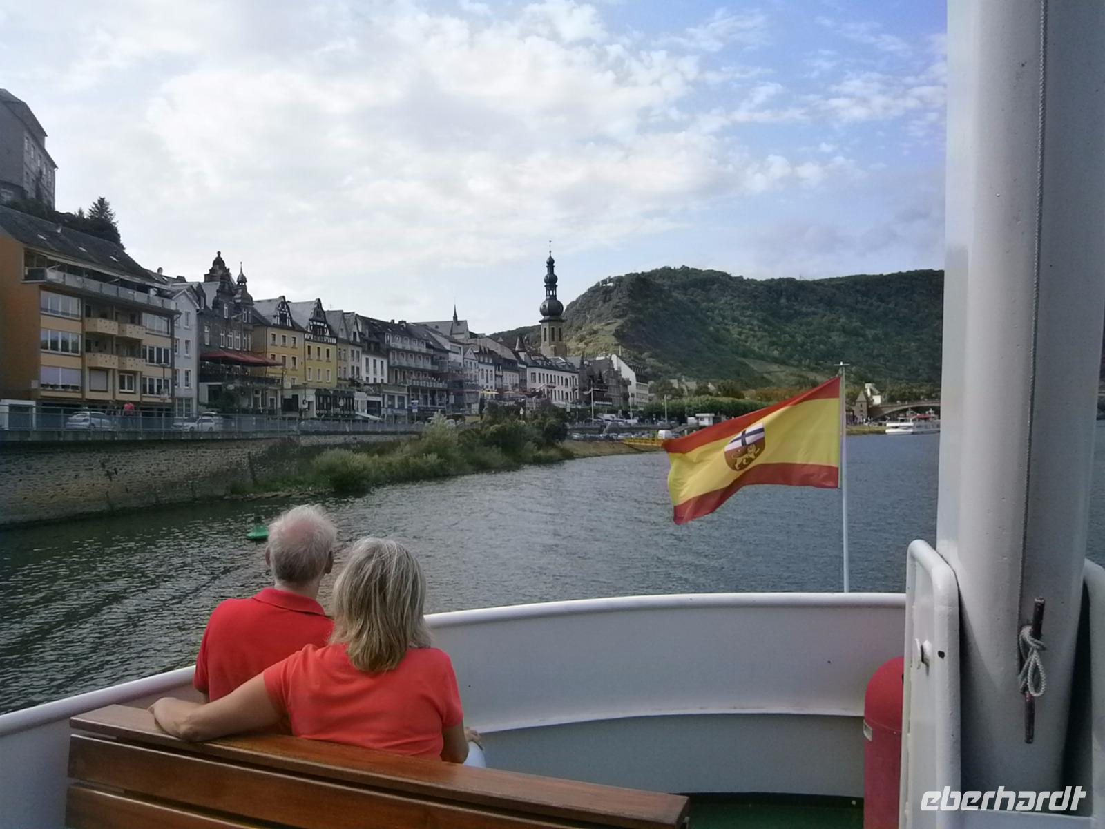 Wir besuchten auch die malerischen Weinstädte Bernkastel-Kues und Cochem. Während wir in Bernkastel-Kues eine ausgezeichnete Stadtführung und reichlich Freizeit hatten, nutzten unsere Reisegäste den Aufenthalt in Cochem für individuelle Entdeckungen der Reichsburg, der Stadt, die sich gerade auf ein großes Weinfest für vier Tage vorbereitete oder besuchten eines der zahlreichen Restaurants und Cafe's. Während unseres Aufenthaltes in Cochem begab sich die Gruppe auf eine Moselrundfahrt. Nachdem wir das „MS Stadt Bonn" bestiegen hatten, fuhren wir gemütlich, vorbei an Rebflächen, Burgen und kleinen Weindörfern.