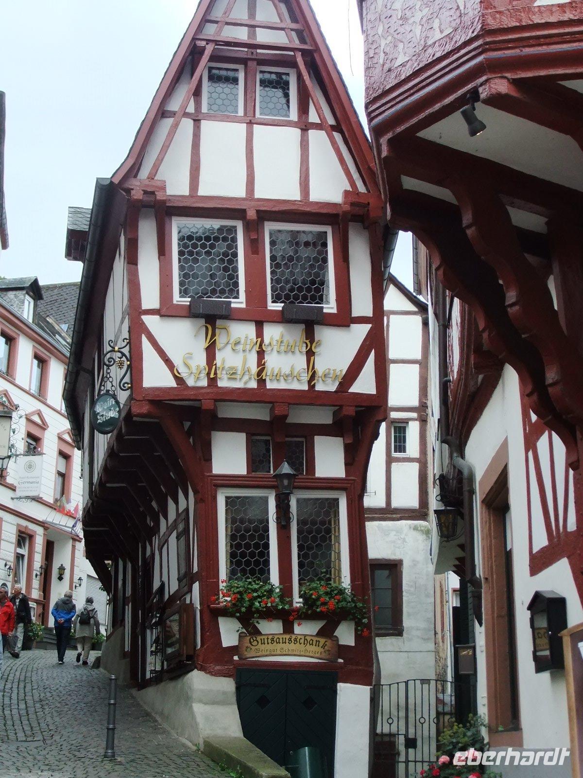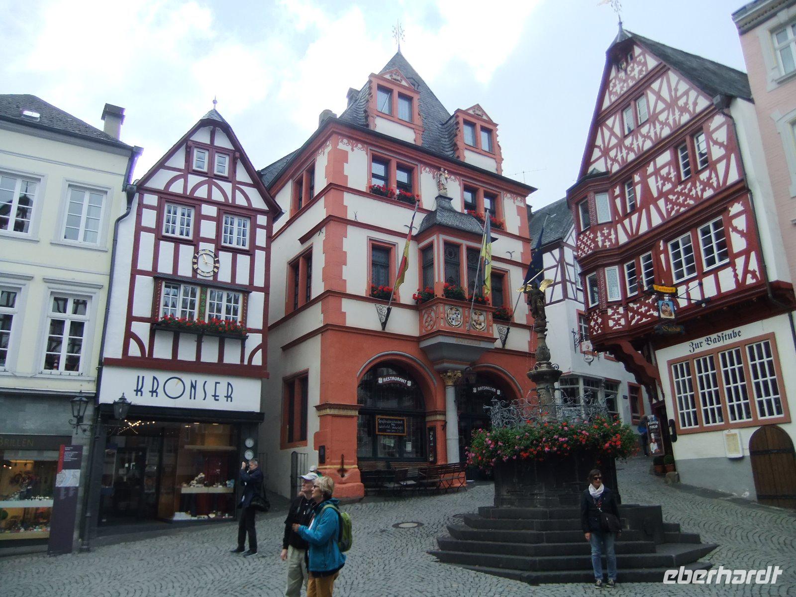 Nach dem Frühstück fahren wir über die Hunsrück-Höhenstraße nach Bernkastel-Kues am Fuße der Burg Landshut. Mit zwei Stadtführern lernen wir dieses Moselörtchen kennen. Immer wieder begeistert bin ich vom Marktplatz mit den schönen Fachwerkhäusern. Wir entdecken außerdem das Spitzhäuschen und so manch sinnigen Weinspruch an den Fassaden, können kaum glauben, wie hoch einst das Moselwasser in den Gassen stand und erfahren, wie Bernkastel zu seinem Namen kam. Nun wird noch das ein oder andere Souvenir gekauft.