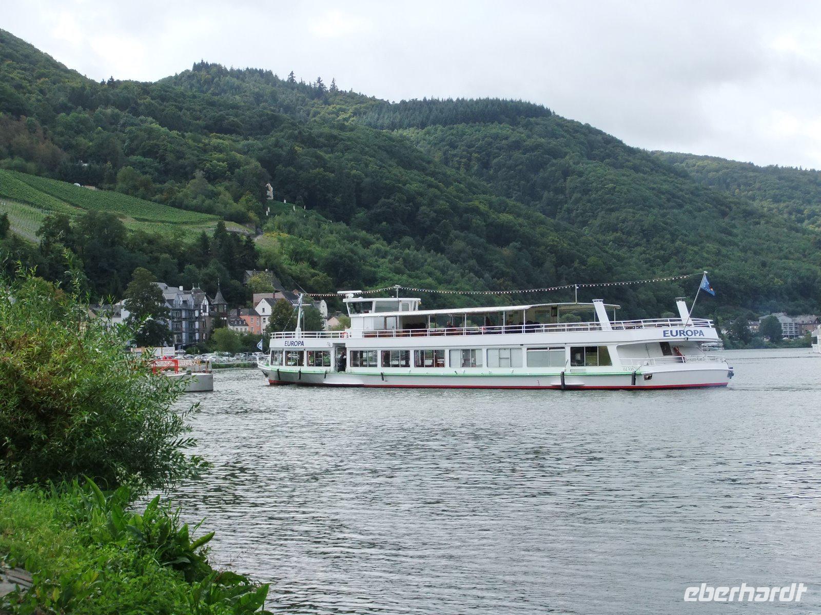 Den Vormittag verbringen wir heute wieder an der Mosel verbringen: Es geht nach Cochem. Bald sehen wir schon von weitem die Reichsburg hoch über dem Ort. Während wird durch die Gassen und zum Marktplatz bummeln, überrascht uns ein Regenschauer. Doch in den zahlreichen Cafes und Weinlokalen finden alle ein gemütliches Plätzchen. Dann startet unsere Schifffahrt auf der Mosel. Die „Stadt Bonn" bringt uns vorbei am Kloster Ebernach zu den von Weinbergen umgebenen Winzerorten Valwig und Ernst. Nach einer Stunde sind wir zurück in Cochem und gehen gemeinsam zum Parkplatz an der Mosel. Hier hat Jörg für alle ein Winzerpicknick vorbereitet.