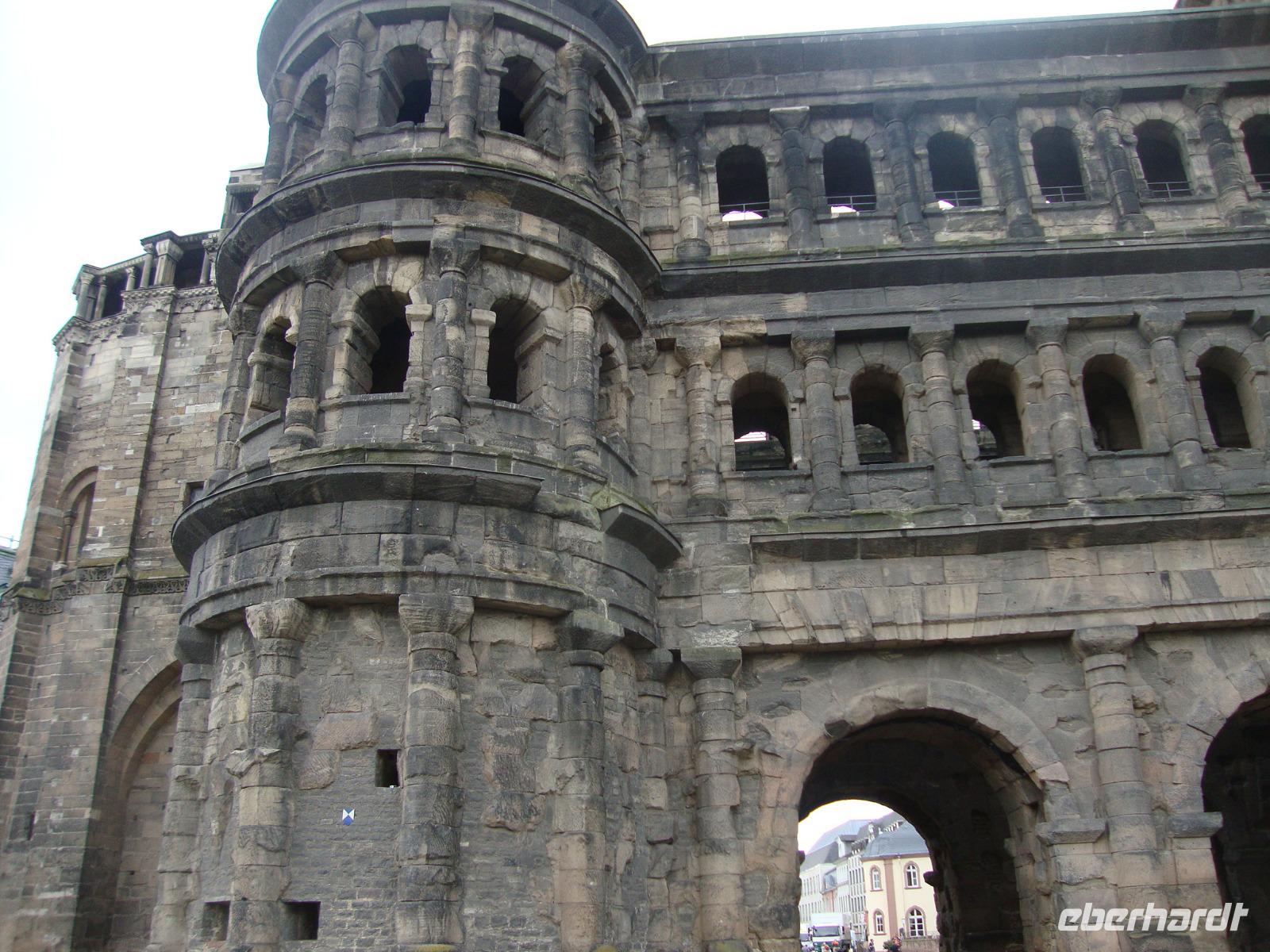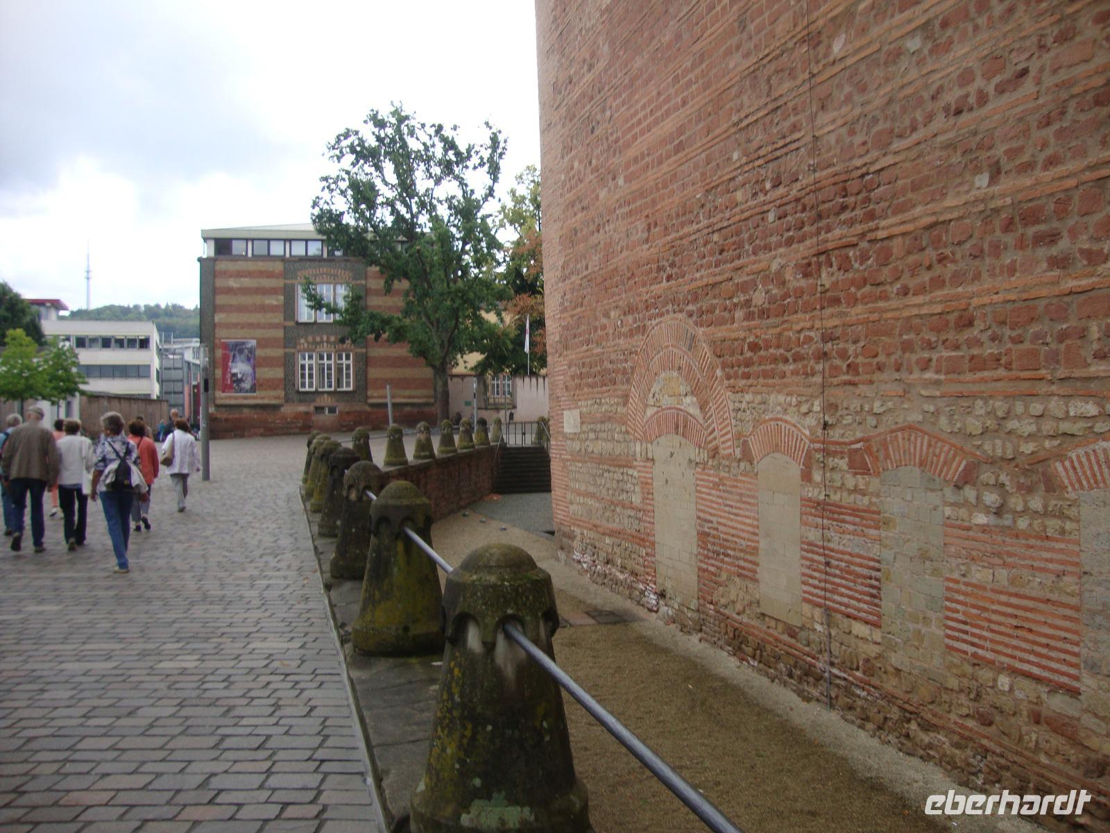 Das Schwarze Tor, die "Porta Nigra", gilt als das Wahrzeichen Triers und erinnert inmitten der modernen Stadt an die römischen Wurzeln. Hier empfing uns Frau Fickenscher, unsere Gästeführerin, die uns die nächsten zwei Stunden begleitete. Das neue Denkmal von Karl Marx, dem größten Sohn der Stadt, steht unweit der Tourist - Information, vor dem Haus, wo er geboren wurde. Es gab viele Diskussionen, ob und wo diese Statue aufgestellt werden soll, aber anläßlich des 200. Geburtstag des Philosophen wurde der Beschluss gefasst. Im Zentrum der Trierer Altstadt, dem Hauptmarkt entstanden über mehrere jahrhunderte Bürgerhäuser mit hübschen Fassaden. Im Dom, mit seinen gewaltigen Ausmassen, gibt es drei Krypten, die sich mit dem Kreuzgang und der Schatzkammer zu einem Ensemble aus Architektur und Kunst vereinen. Der Bau wurde im 10. -12. Jh. begonnen, später immer wieder erweitert und in verschiedenen Stilepochen mit Altar, Kanzel und Grabmälern ausgestattet. Der römische Kaiser Konstantin lies das kolossale Bauwerk um 305 als Palastaula errichten. Der ehemals mit Marmor verkleidete und mit Fussbodenheizung ausgestattete innenraum war später Teil des Kurfürstlichen Palais, bevor er Mitte des 19.Jh. in eine Kirche umgewandelt wurde, die einzig evangelische in Trier.