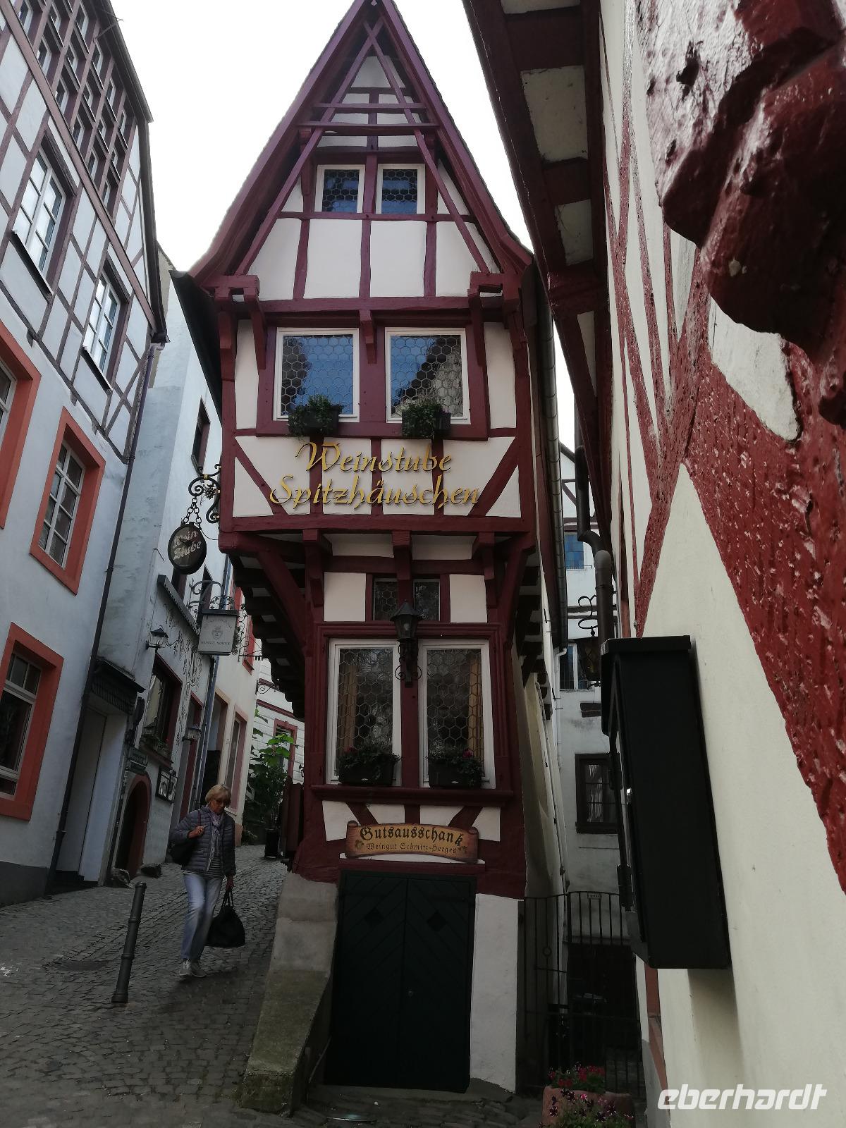 Sie zeigten uns mit sehr viel Charme, Wissenswertem und Witz die Stadt unterhalb der Burgruine Landshut. Die Winzergemeinschaft von Bernkastel verfügt über die größten zusammenhängenden Weinberge in Deutschland. Der berühmteste Tropfen ist der „Bernkastler Doktor". Dieser Legende und vielen andern Geschichten konnten wir während des Stadtrundganges lauschen. Der Rundgang führte uns durch das Schwanengässchen mit dem alten Zollhaus. Besonders beeindruckt waren wir vom Spitzhäuschen (1583), einem schmalen Häuschen am Marktplatz.