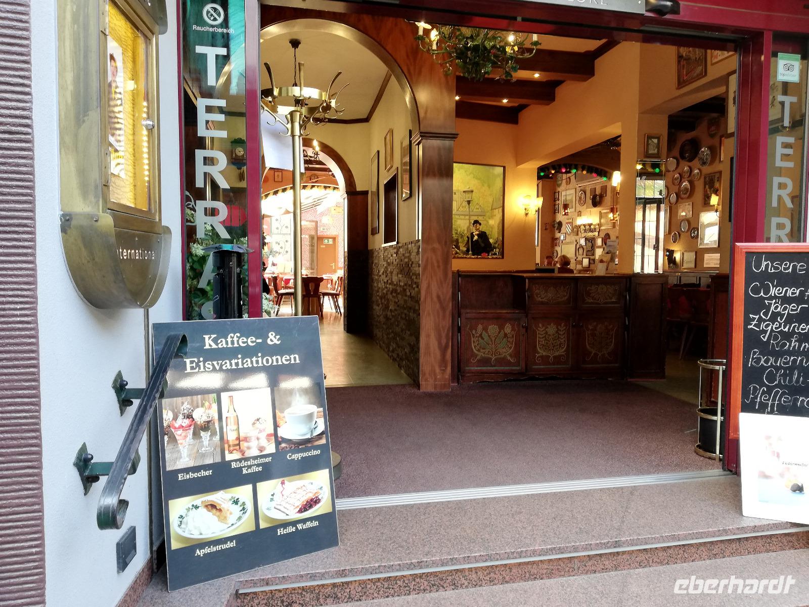 Nach der Mittagspause setzten wir unsere Reise entlang des „Vater Rheines" nach Rüdesheim fort. Wir fuhren an den zahlreichen Burgen und kleinen Dörfern vorbei. In Rüdesheim blieb uns noch etwas Zeit, um durch die Drosselgasse zu schlendern. Diese berühmte Gasse ist Sinnbild für Weingemütlichkeit.