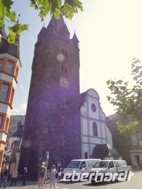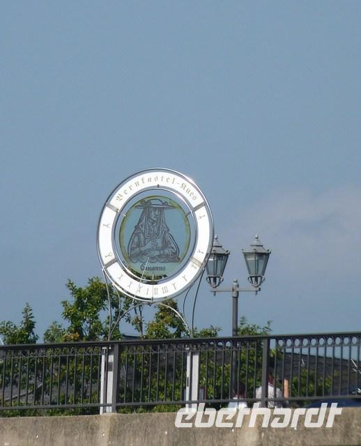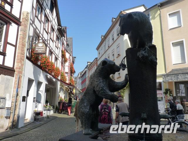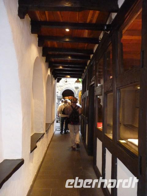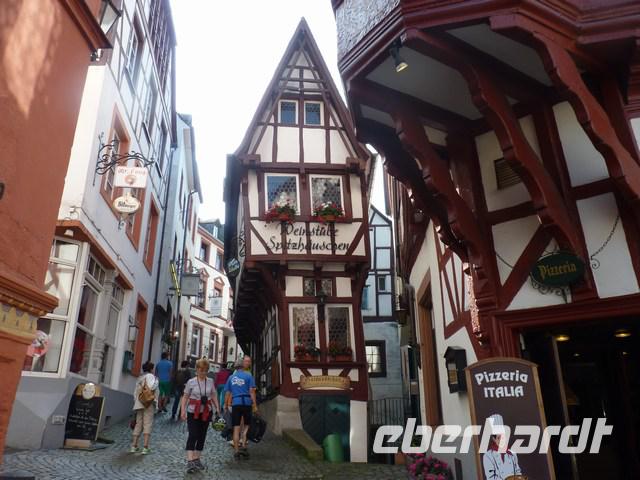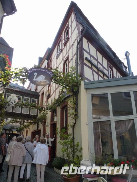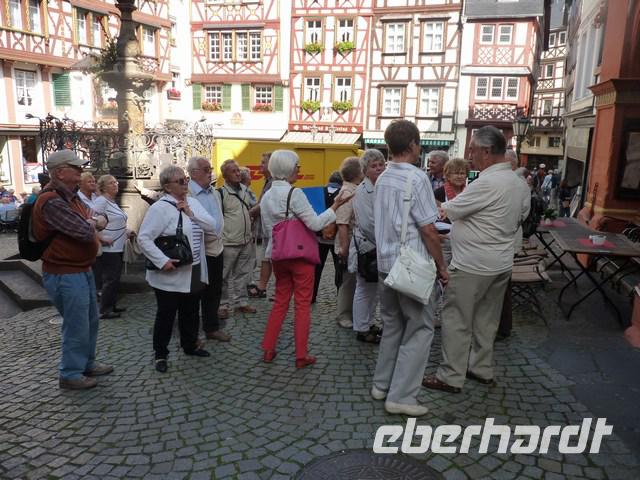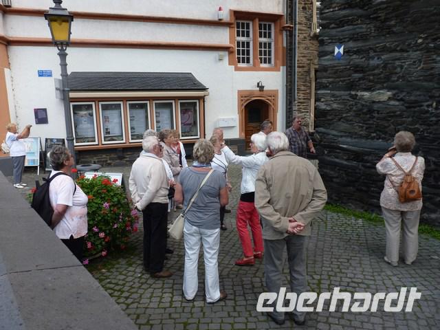 Sie zeigten uns mit sehr viel Charme, Wissenswertem und Witz die Stadt unterhalb der Burgruine Landshut. Die Winzergemeinschaft von Bernkastel verfügt über die größten zusammenhängenden Weinberge in Deutschland. Der berühmteste Tropfen ist der „Bernkastler Doktor". Dieser Legende und vielen andern Geschichten konnten wir während des Stadtrundganges lauschen. Der Rundgang führte uns durch das Schwanengässchen mit dem alten Zollhaus. Besonders beeindruckt waren wir vom Spitzhäuschen (1583), einem schmalen Häuschen am Marktplatz.