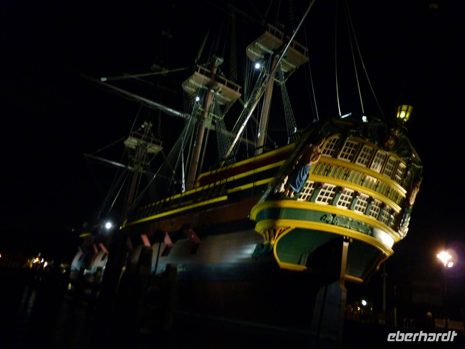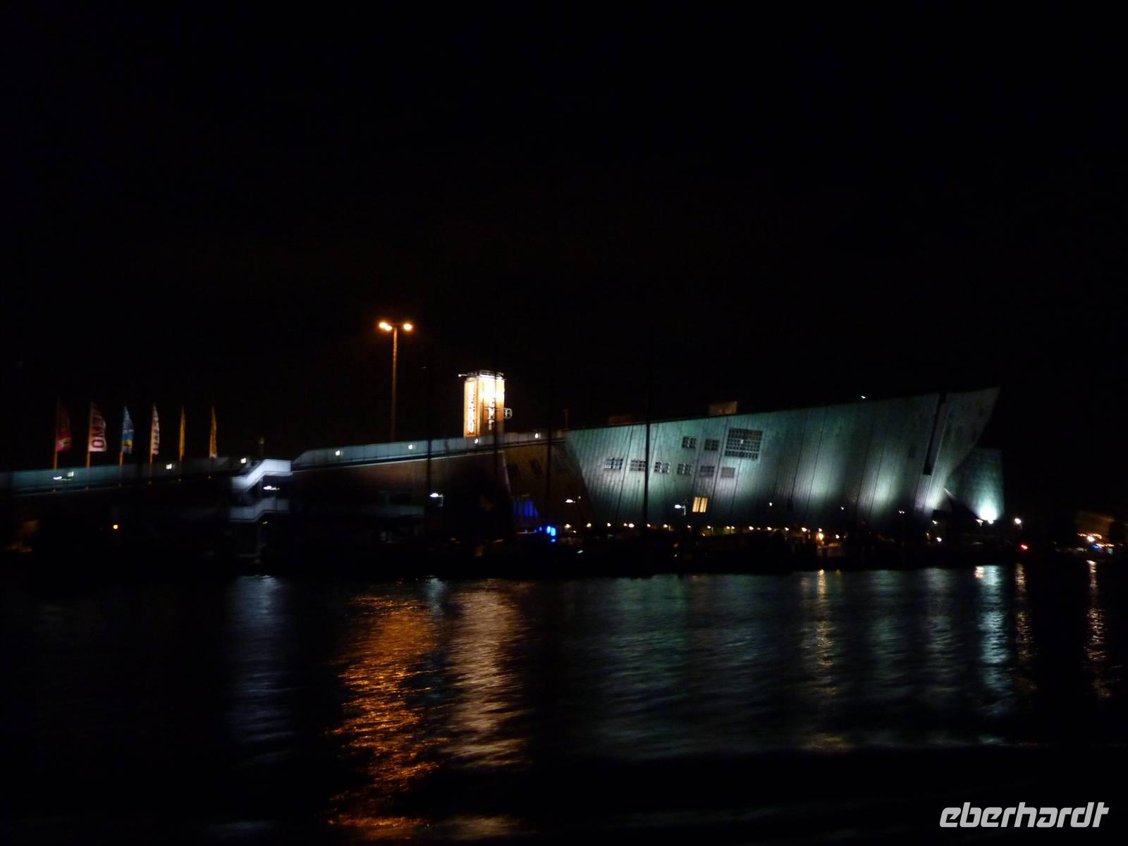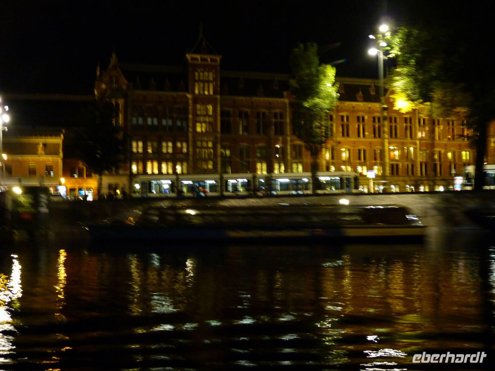 Krönender Abschluss unserer Reise war die Grachtentour am späten Abend. Durch das Oosterdok am Nemo vorbei - technisches Museum in Form eines Walfischs, weiter in die Oudeschans - vorbei am Montelban-Turm, mit Blick in die Nieuwe Amstel biegen wir etwa nach 270° um die Altstadt in eine innere Gracht um dann entgegen dem Uhrzeigersinn weiterzufahren. Viele Quergrachten mit unzähligen Brücken sehen wir bei unserer Fahrt, sowie zahlreiche der Prachthäuser in der Heren-, Prinsen- und Kaizersgracht und zum Abschluss ein Museumsschiff, einen Nachbau des V.O.C.