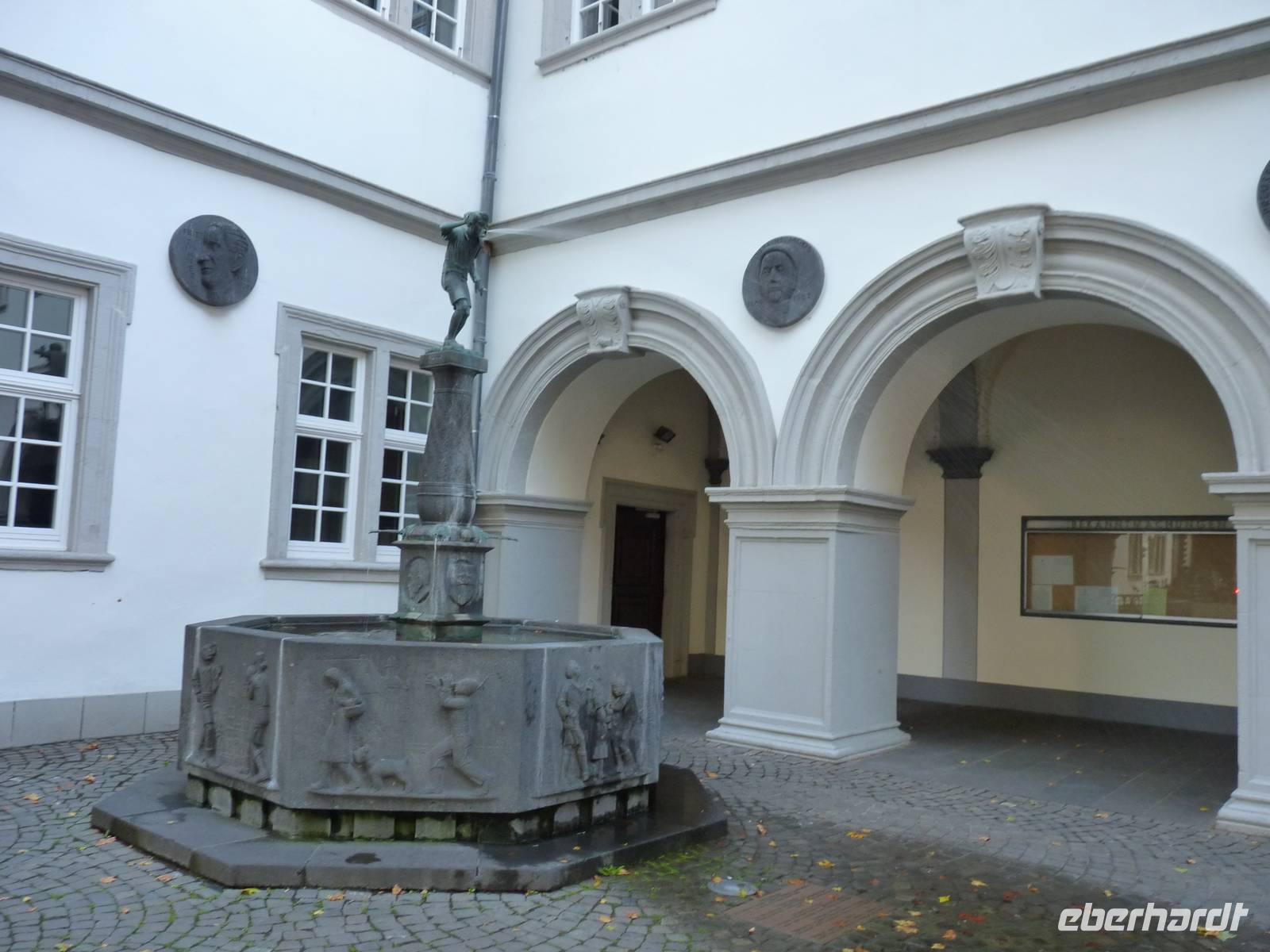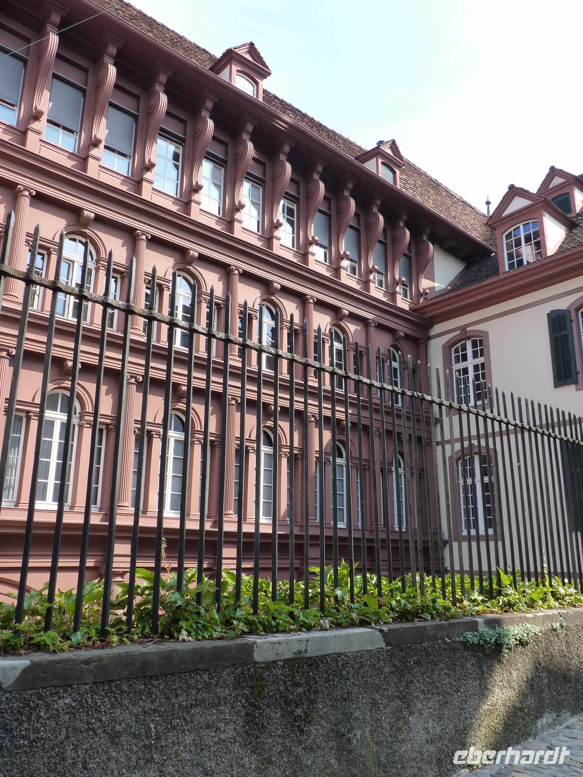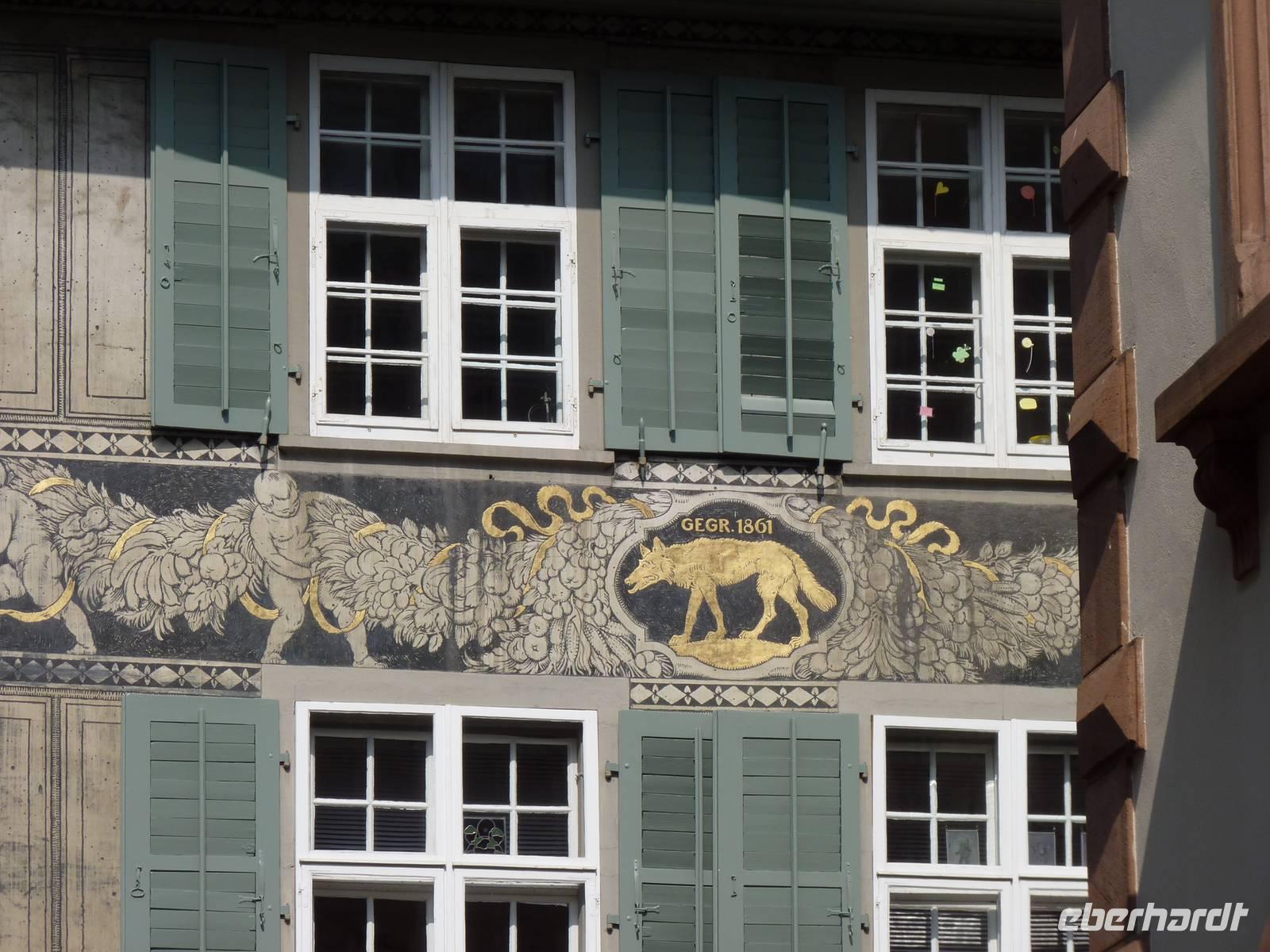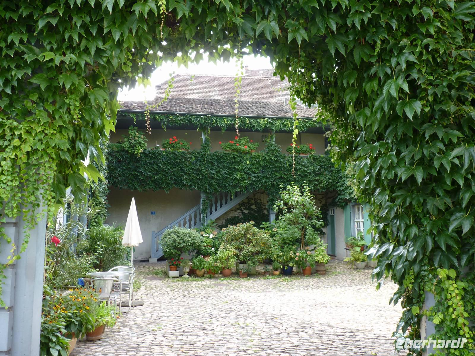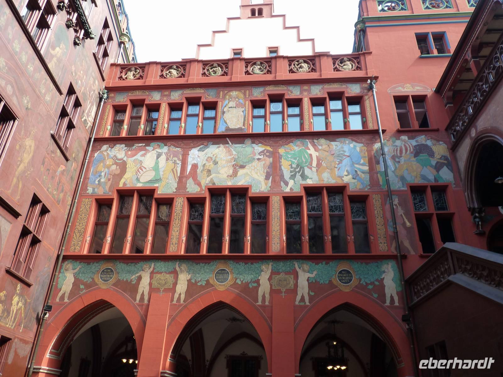 Sehenswert auch die Wände des Innenhofes, sie sind bemalt im Jugendstil und an den Zinnen sind die Wappen der 12 Kantone abgebildet, mit denen Basel damals die Eidgenossenschaft bildete.