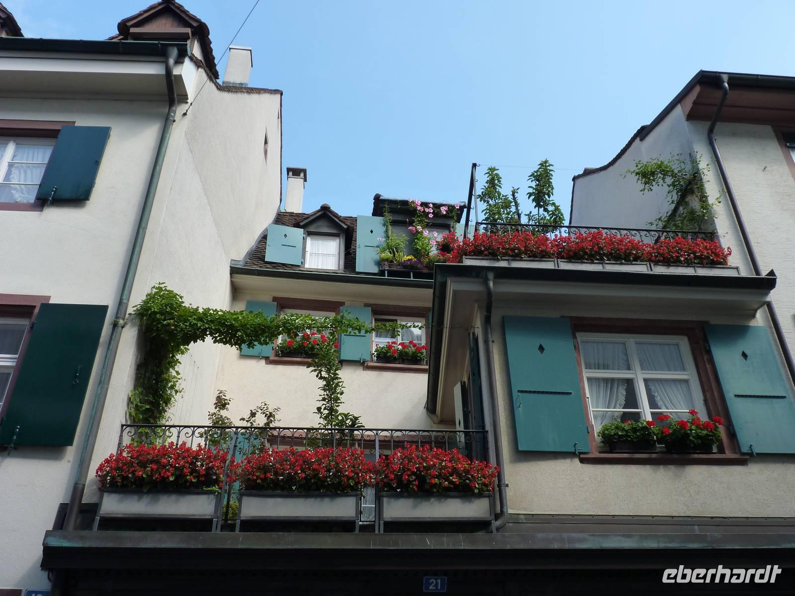 Die schmucken Bürgerhäuser sind dekoriert in munteren Farben und heraus geputzt mit Blumen. In ihren Untergeschossen bieten Geschäfte alltägliche und besondere Waren an.