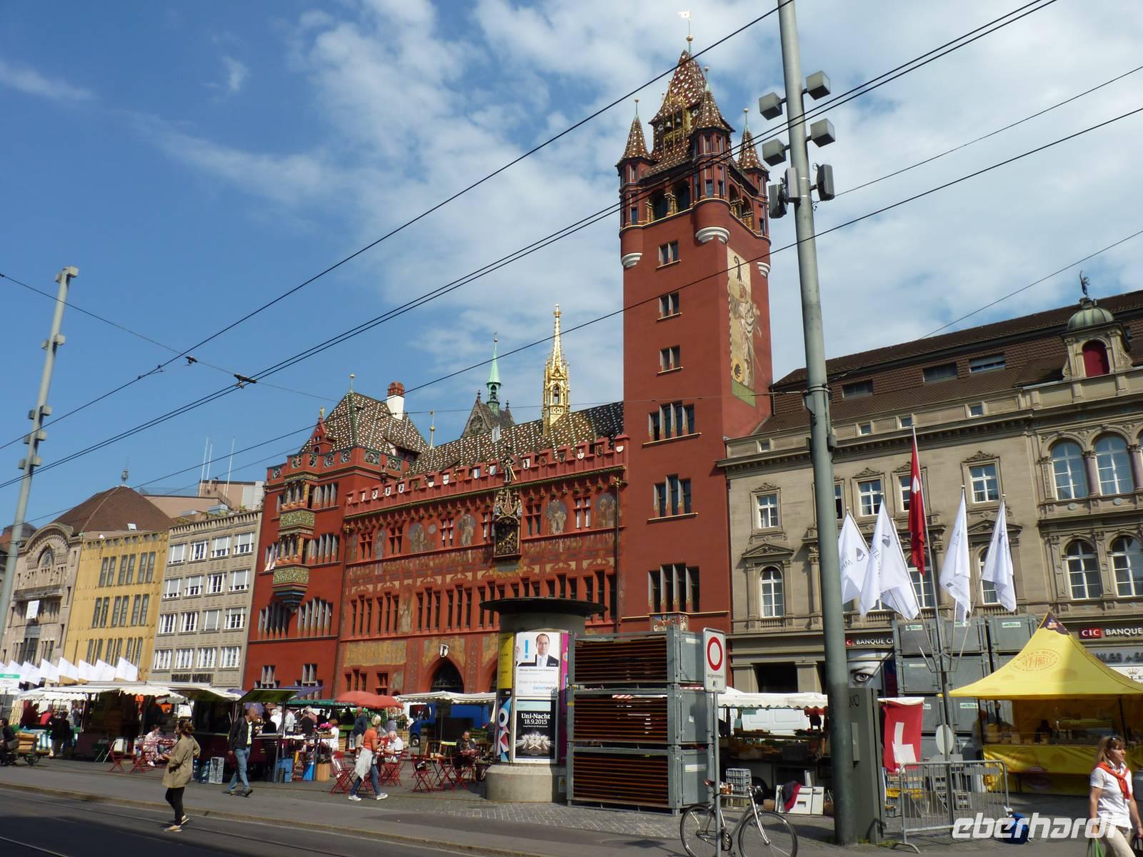 Ein weiteres optisches Highlight fanden wir auf dem Marktplatz, dem Mittelpunkt der Basler Altstadt. Hier fiel sofort die rote, bemalte Sandsteinfassade des Rathauses ins Auge, das zwischen 1507 und 1513 errichtet wurde und zu Ehren eines Besuches der englischen Königin Elisabeth II. seinen heutigen Anstrich erhalten hat.