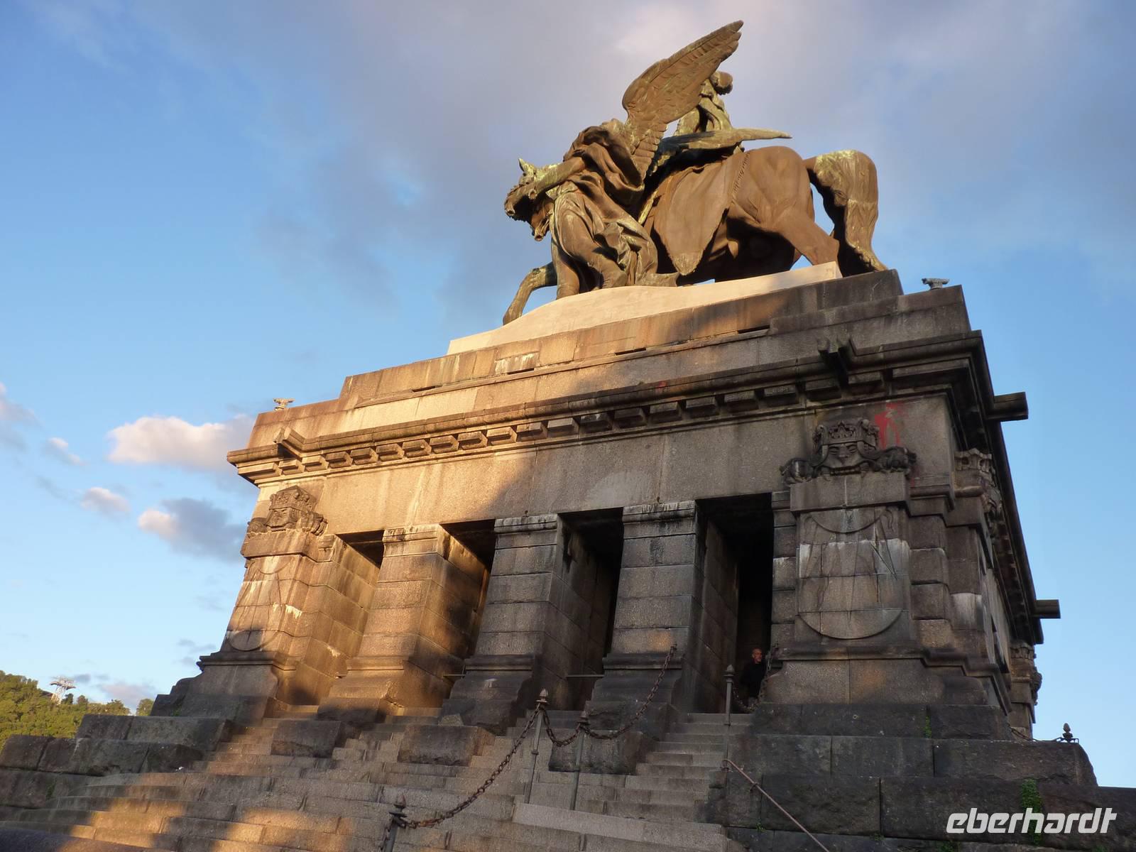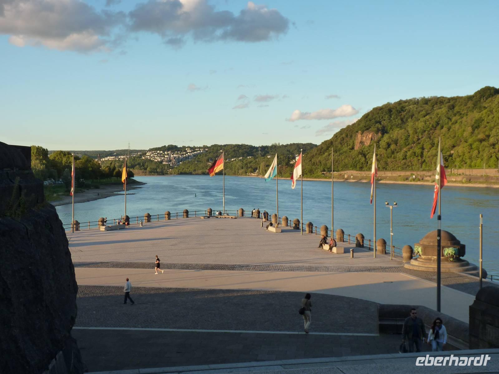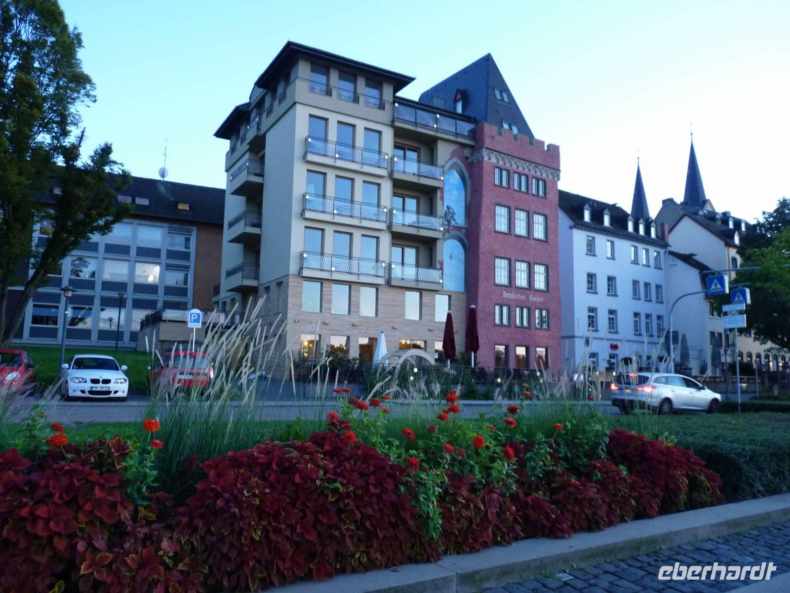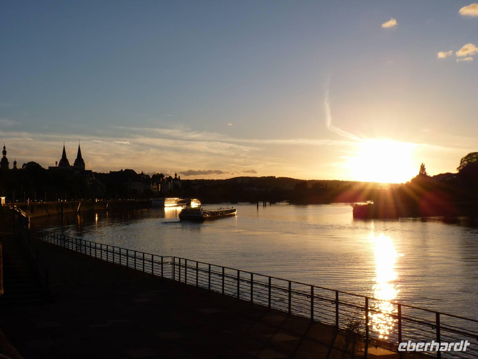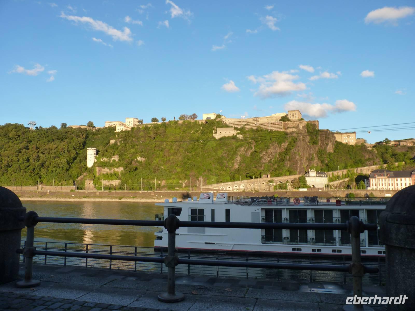 In der Abenddämmerung schlenderten wir durch die Gassen vorbei am Brunnen mit dem Schängel, sehen so manch schönes Haus, kommen an der Liebfrauenkirche vorbei, besuchen den Plan und den Jesuitenplatz. Während unseres Rundgangs treffen wir auch viele Koblenzer Originale: den Augenroller, die Marktfrau, den Schutzmann, den Trommler und die Pfefferminzje. Verlassen dann das Zentrum und kommen zum Rheinufer. Hier steht die imposante Kirche St. Kastor. Von ihr ist es nicht weit bis zum Deutschen Eck mit dem Kaiser-Wilhelm-Denkmal. Hier sehen wir im Sonnenuntergang die imposante Festungsanlage Ehrenbreitstein. Leider hat der Lift schon geschlossen und wir gehen zum Schiff zurück. Bei einem Cocktail und netter Gesellschaft lassen wir den Abend ausklingen.