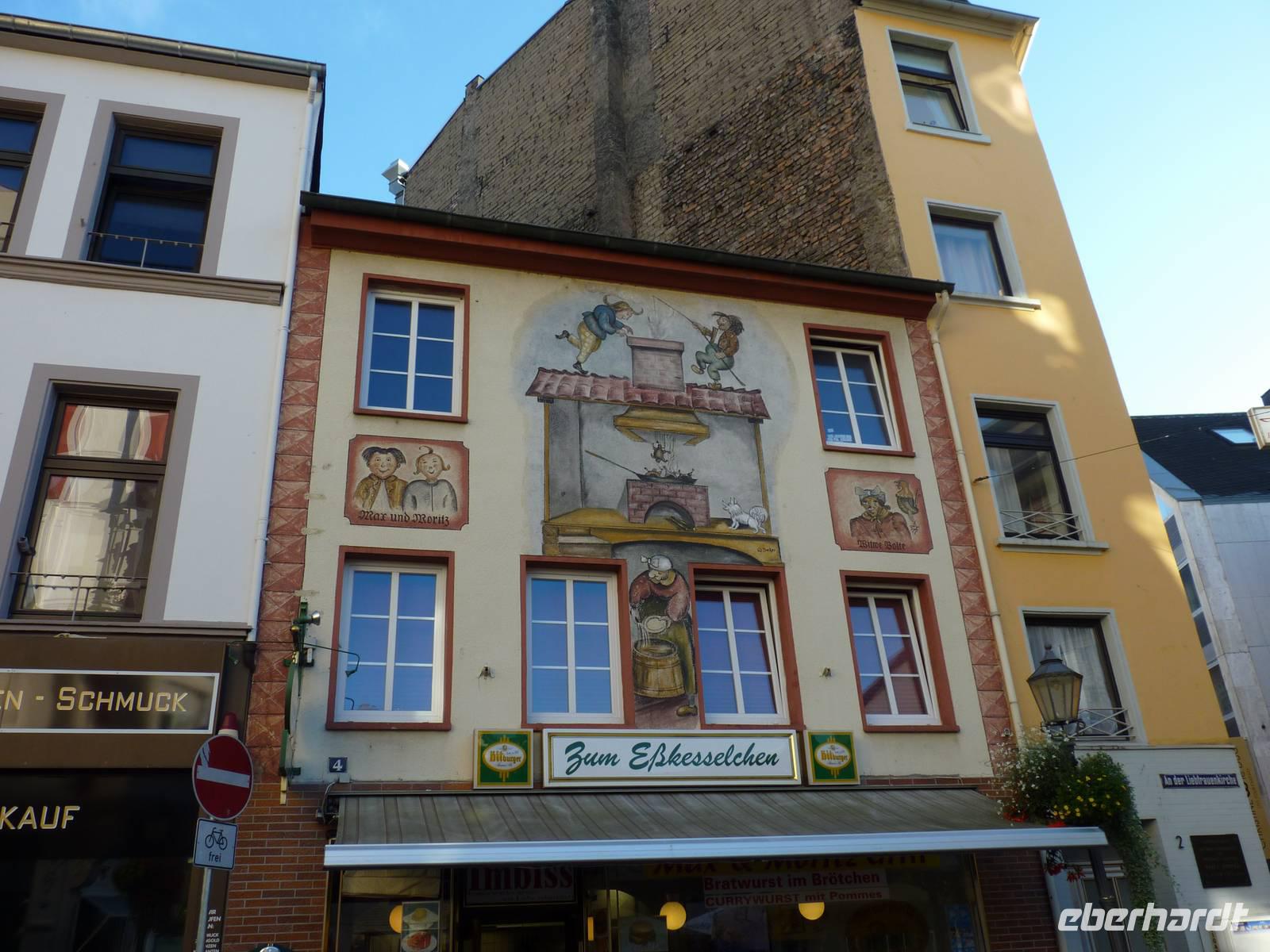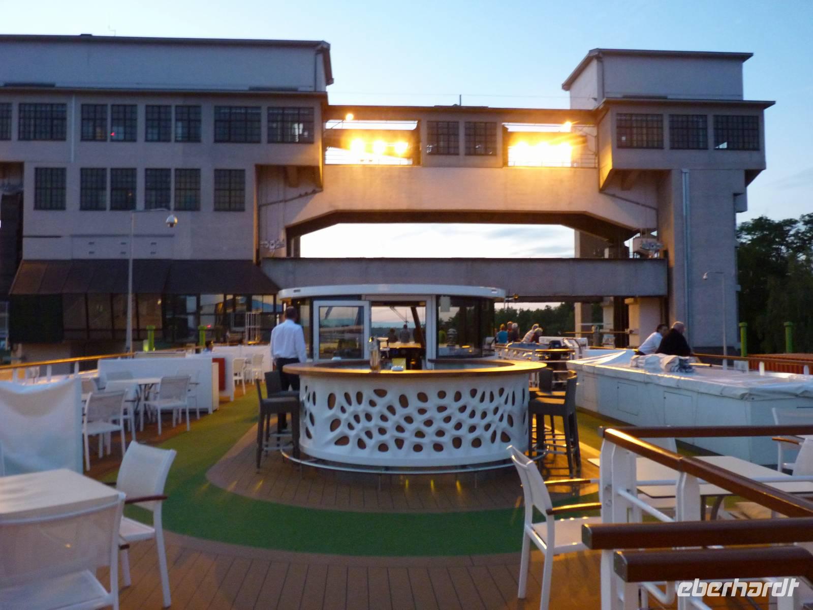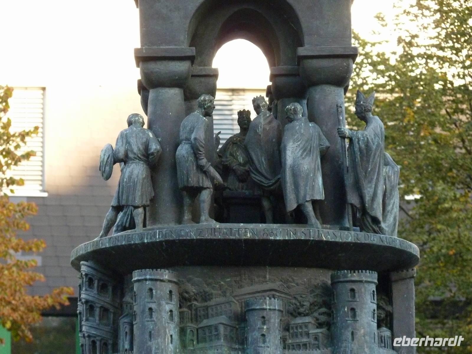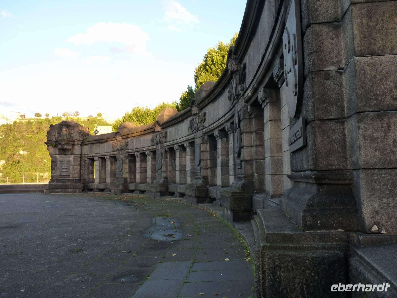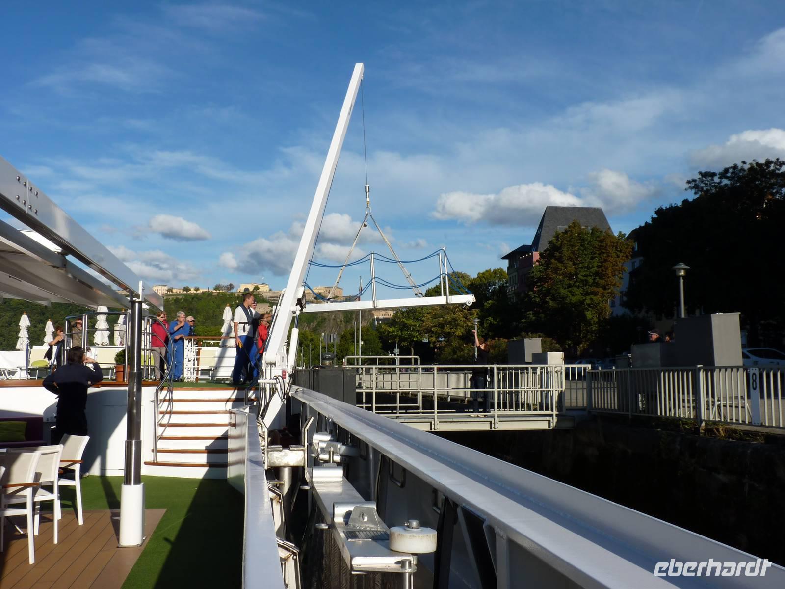 In der Abenddämmerung schlenderten wir durch die Gassen vorbei am Brunnen mit dem Schängel, sehen so manch schönes Haus, kommen an der Liebfrauenkirche vorbei, besuchen den Plan und den Jesuitenplatz. Während unseres Rundgangs treffen wir auch viele Koblenzer Originale: den Augenroller, die Marktfrau, den Schutzmann, den Trommler und die Pfefferminzje. Verlassen dann das Zentrum und kommen zum Rheinufer. Hier steht die imposante Kirche St. Kastor. Von ihr ist es nicht weit bis zum Deutschen Eck mit dem Kaiser-Wilhelm-Denkmal. Hier sehen wir im Sonnenuntergang die imposante Festungsanlage Ehrenbreitstein. Leider hat der Lift schon geschlossen und wir gehen zum Schiff zurück. Bei einem Cocktail und netter Gesellschaft lassen wir den Abend ausklingen.