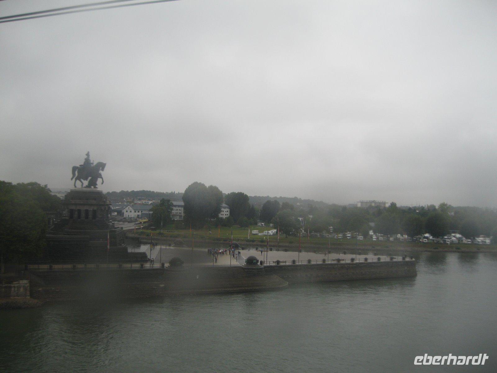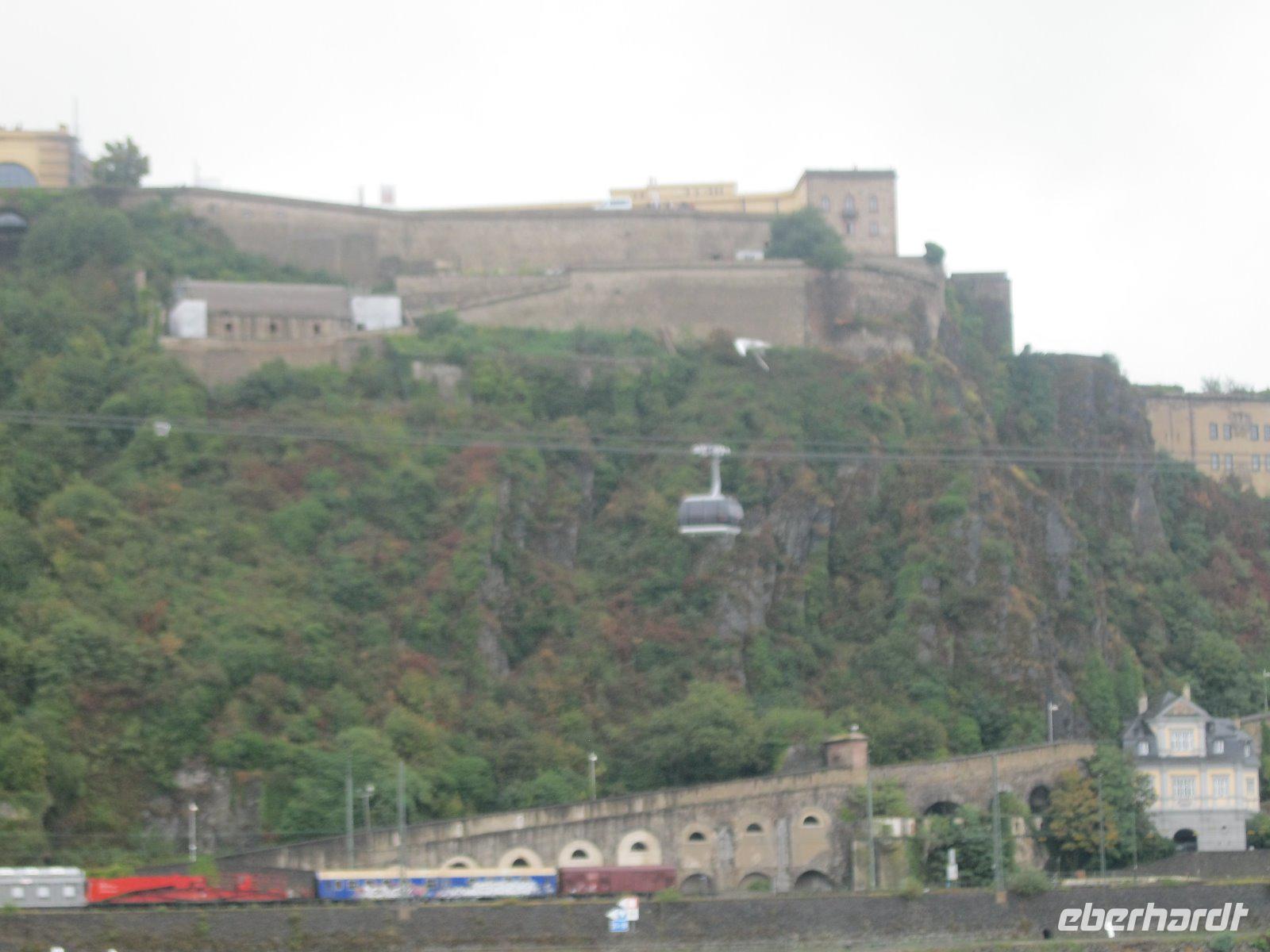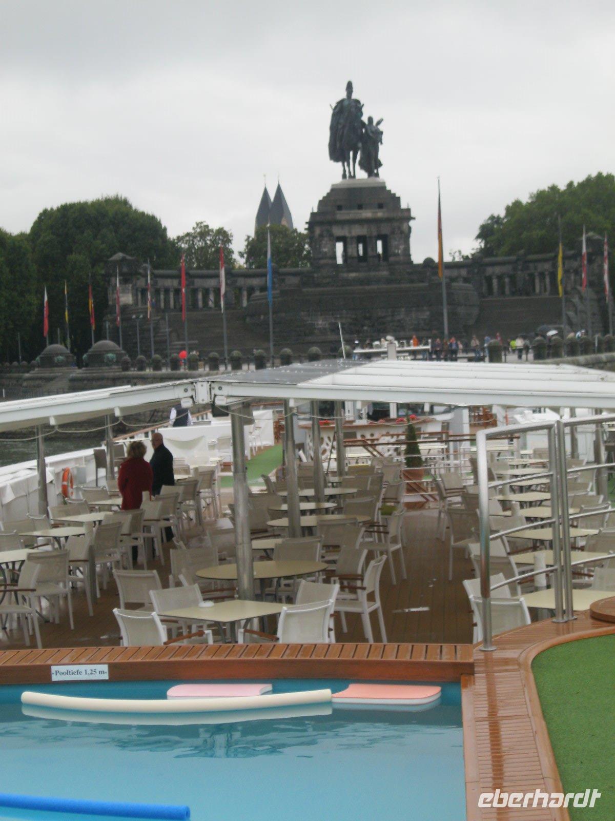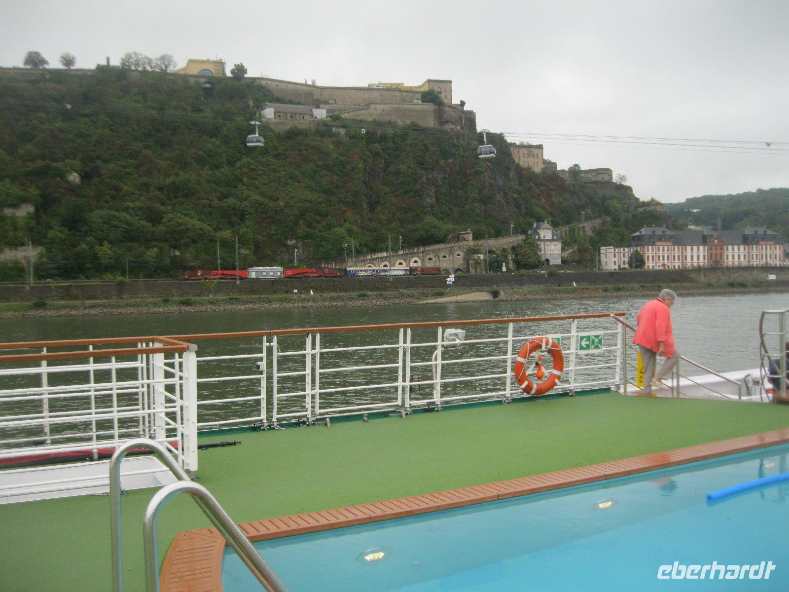 Schon zeitig früh legten wir diesmal an der Mosel an,500 m vom Deutschen Eck entfernt.Dort fließt dann auch die Mosel in den Rhein u.Kaiser Wilhelm I.begrüßte uns hoch zu Pferd.Unser Ziel- die Gondelfahrt zur Festung Ehrenbreitstein.Von dort hat man einen tollen Blick wieder hinunter zum Rhein,für uns leider verregnet.Nach einem kurzen Spaziergang legte unser Schiff ab u.wir genossen das Bordleben.Bei Kaffee u.Kuchen zogen die alten Burgen,im Abschnitt Mittelrhein, an uns vorbei. Die Sonne zeigte sich gnädig als wir an der Loreley unsere Kameras in Position brachten.Ungewöhnlich "klein"präsentierte sich der geführchtete Felsen. Während der Passage sang unser Bordmusikus Enzo, live, das Loreley Lied.Wegen des Niedrigwassers zeigten sich allerdings gut die 7 Jungfrauen.Eine Felsformation im Rhein,die besonders schwierig zu umfahren ist u.viel Stoff für Legenden liefert.In Rüdersheim erblickten wir das mächtige Niederwald Denkmal ,umhüllt von mystisch dunklen Wolken.Am Abend konnte man sich in der Bar bei einer Karaoke Show von seiner "verkannten"Seite zeigen,leider grif niemand zum Mikro.