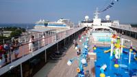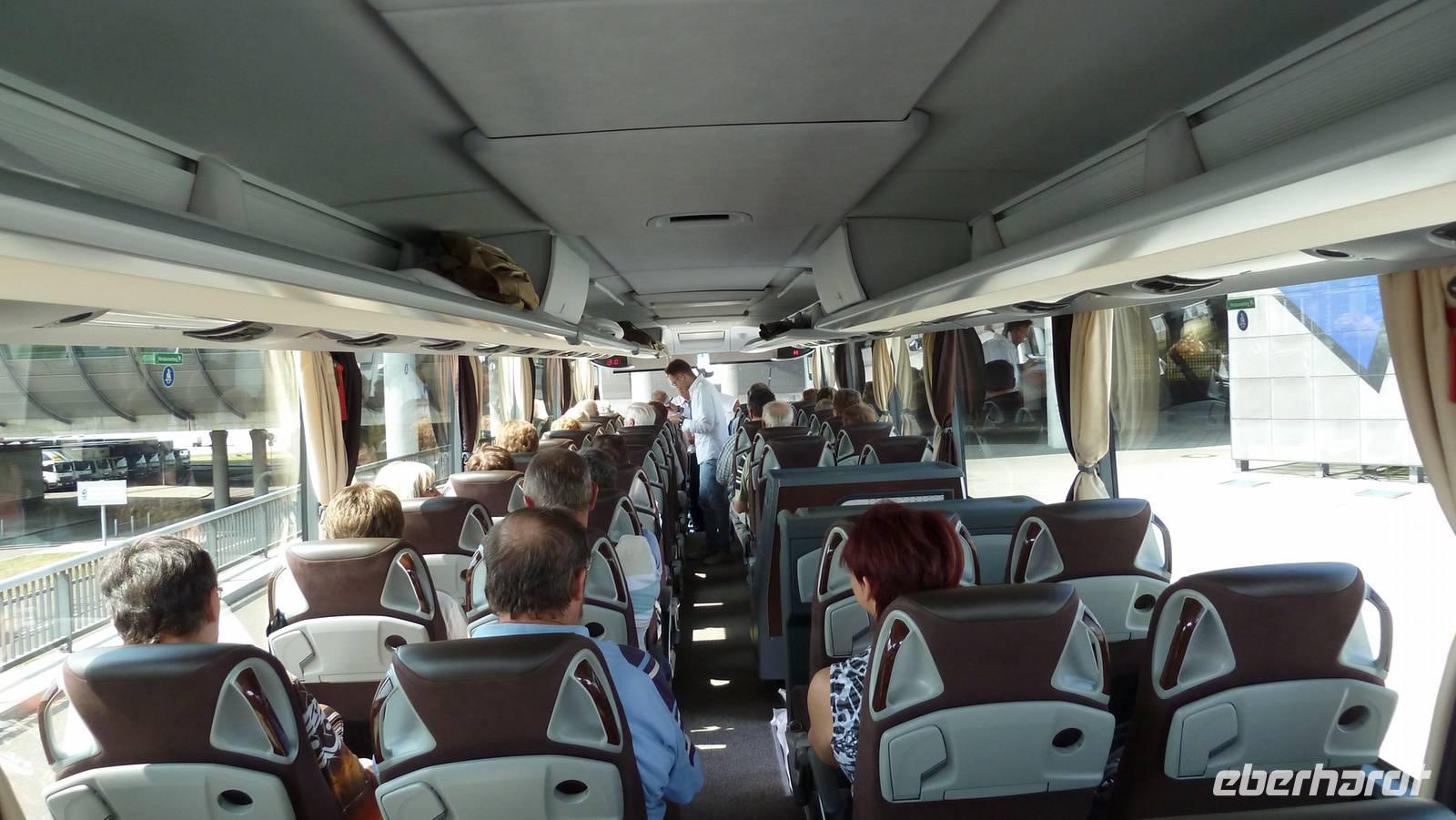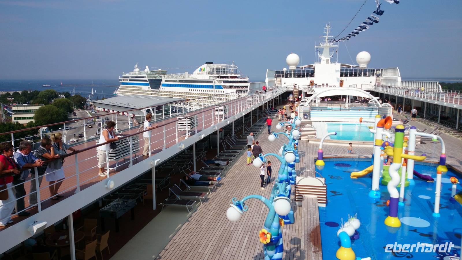 Nach dem Frühstück fuhren wir gespannt nach Warnemünde und gegen 11:00Uhr erreichten wir schon das Hafengelände. Nachdem noch einige AIDA Gäste zur Gruppe dazu kamen, ging es auch schon auf das gigantische MSC Schiff „Sinfonia". Zuerst unternahmen wir einen kleinen Rundgang durch das innere des Schiffs. Danach gab es ein hervorragendes Mittagessen an Bord. Nachdem wir alle gestärkt waren, spazierten wir ein paar Meter weiter in die „Manhatten-Bar", wo unsere Reiseleiterin Ute Hofmann einen interessanten Vortrag über die MSC Reisen bei Eberhardt TRAVEL hielt. Nach diesen interessanten Einblicken in die Kreuzfahrtwelt, ging es gleich weiter mit dem 2. Teil des Rundgangs. Wir besichtigten u.a. den Wellness-Bereich und das Pooldeck. Gegen 16:00 Uhr, war es nun langsam an der Zeit, Abschied zu nehmen. Somit traten wir unsere Heimreise an. Mit vielen tollen Eindrücken kehrten wir nach zwei Tagen zurück.