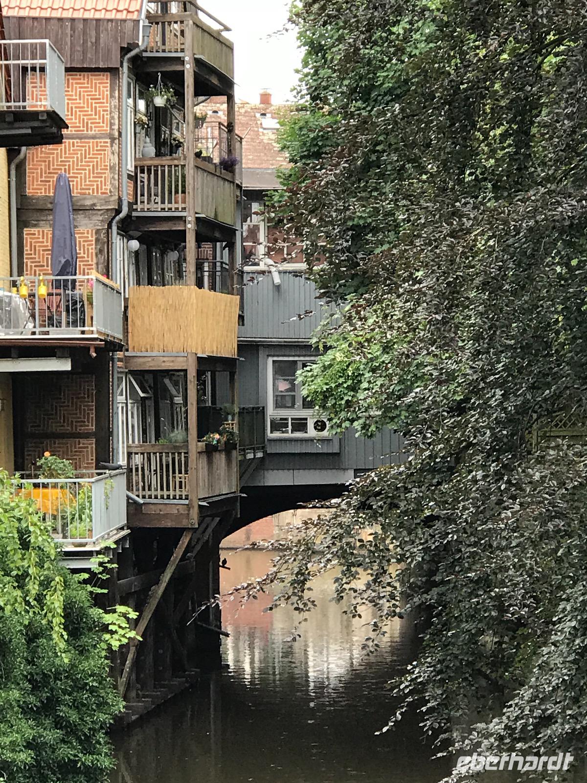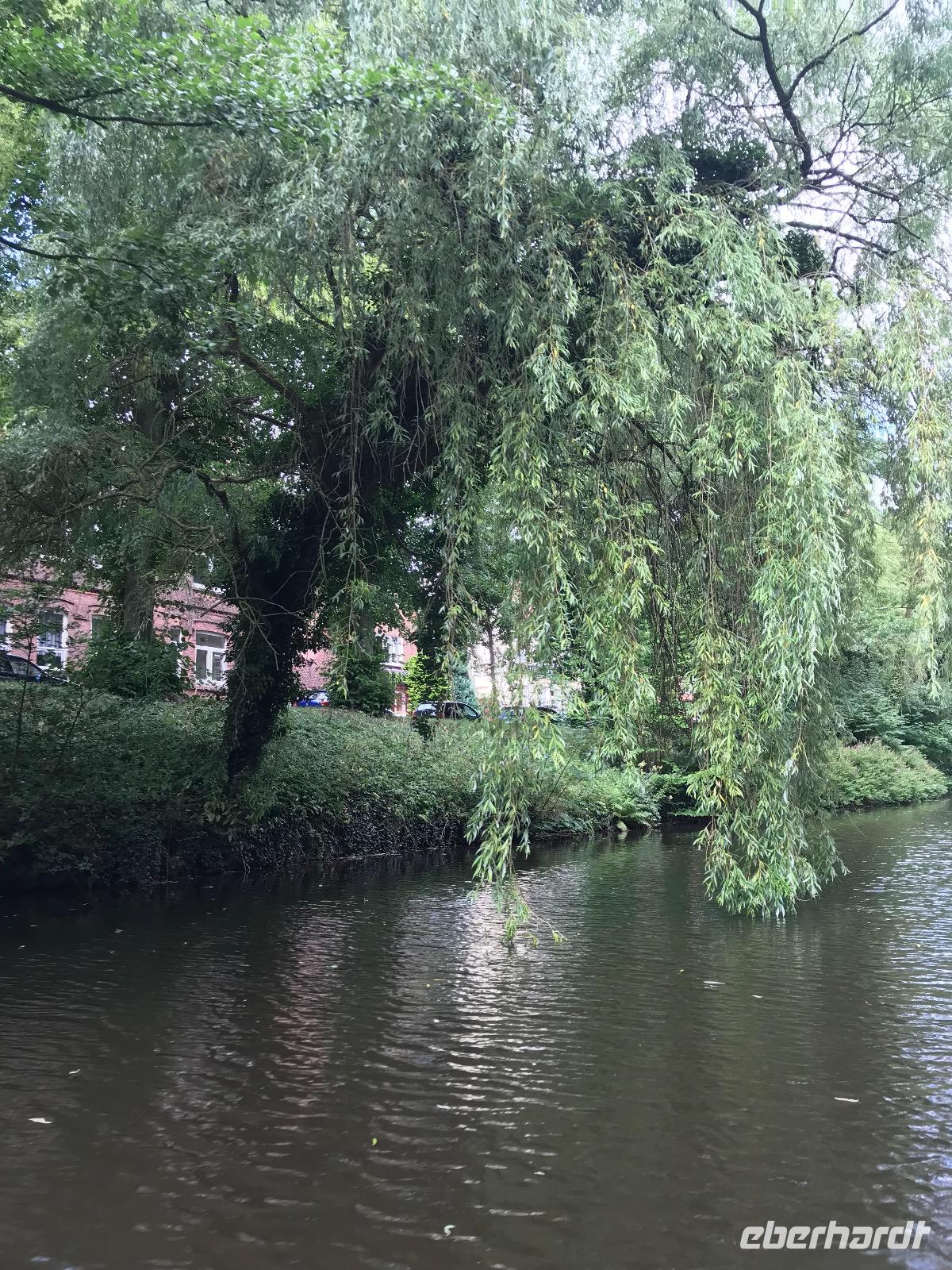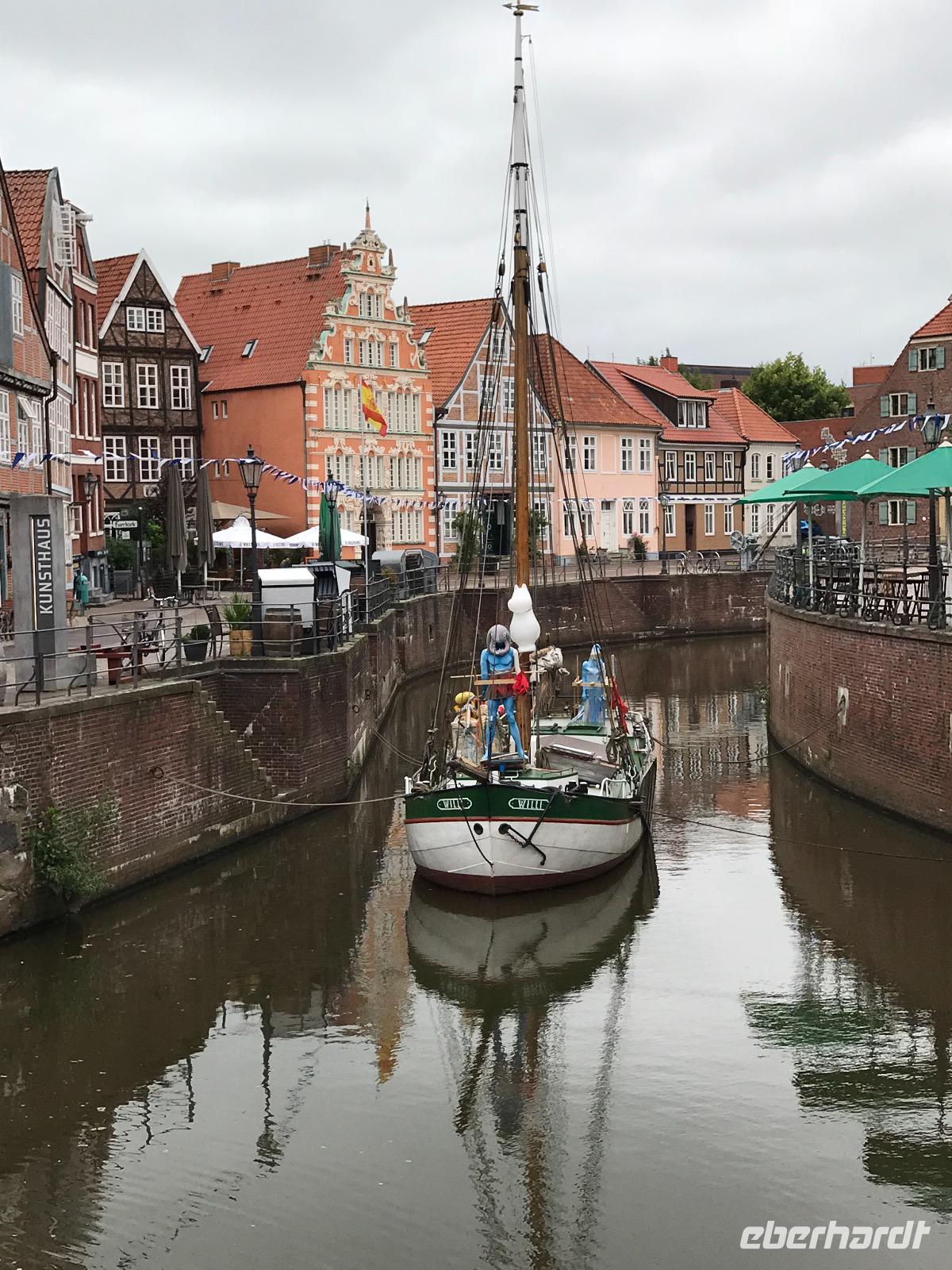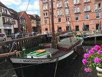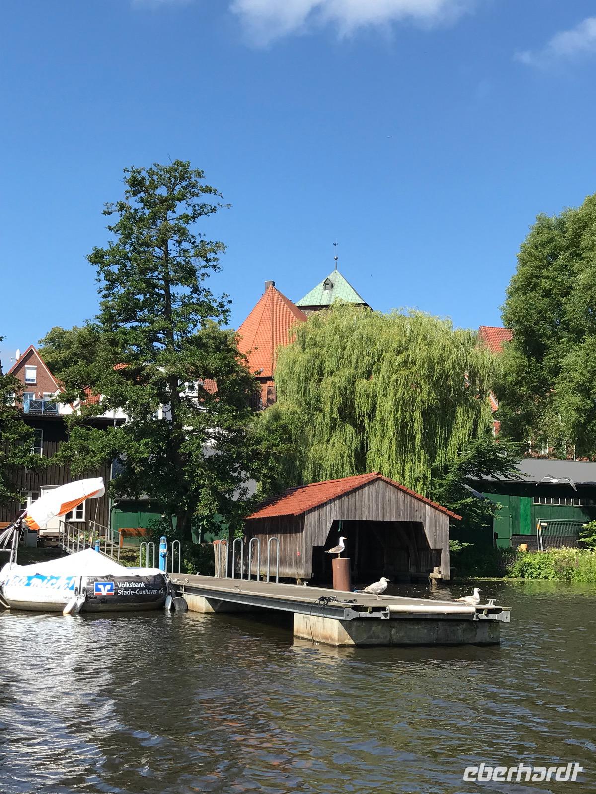 Es war am Morgen noch trübes Wetter als wir zu Fuß zum alten Holzhafen in Stade gingen. Eine Fleetkahnfahrt auf der Schwinge und den Gewässern des Wallgrabens ist ein besonderes Erlebnis. Kaum glitten wir in zwei Kähnen über das ruhige Wasser und lauschten den Erzählungen unserer Schiffer, da kam die Sonne hinter den Wolken hervor. Welch ein schöner Tag und welch ein Lebensglück. Vom Wasser aus - ein anderer Blickwinkel auf die Stadt, und so erholsam. Leider war die Kahnfahrt viel zu schnell vorbei, der Bus wartete schon.