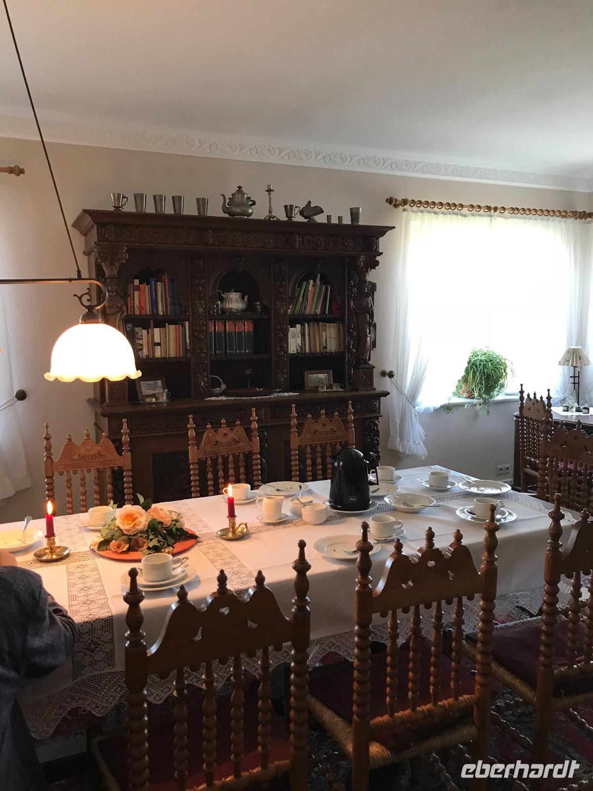Am Nachmittag dann hatten wir eine Rundfahrt durch das Alte Land auf dem Programm, schmucke dekorierte Fachwerkbauernhäuser, gepflegte Gärten und Obstbäume wohin man schaute. Die Kirschen waren gerade reif und so verlockend, und wie groß sie sind und wie gut sie schmecken. Wir lauschten gern den Erklärungen und den Geschichten unserer örtlichen Gästeführerin und besuchten den Obsthof der Familie Bey, um vor Ort zu erfahren, wie es sich lebt auf diesem Stück Erde. Der Obsthof war sehr ursprünglich, es gab eine Vorführung historischer Hilfsmittel für den Apfel- und Kirschanbau. Der Tisch war schon für uns Gäste bereitet, Hochzeitssuppe nach Altländer Art. Wie war das wohl, eine große Hochzeit mit allen Dorfbewohnern zu feiern? Bald schon ging es weiter nach Jork, dem Zentrum des größten Obstanbaugebietes in Deutschland. Wir statteten der breiten Elbe einen Besuch ab, hörten die Geschichten von den Sturmfluten und stellten uns vor, wie der Fluss außer Rand und Band geriet. Vorbei an der St. Bartholomäus-Kirche in Mittelshagen führte uns der Weg in den Obsthof Beckmann zu Kaffee und Kuchen. Frau Beckmann öffnete ihr Haus, ein wunderschönes Reetdachhaus Altländer Art und so ungewöhnlich, dass wir uns in der guten Stube zu Kaffee und Kuchen niederlassen dürfen. Der Apfelkuchen mit Nüssen, Zimt und Rosinen ist unschlagbar und lässt noch in der Erinnerung das Wasser im Mund zusammenfließen. Zufrieden mit dem erlebnisreichen Tag kehrten wir am späten Nachmittag nach Stade zurück. So mancher hatte für Kinder, Enkelkinder und sich selbst ein Souvenir aus dem Hoflanden dabei, und wenn es die Apfelschäl- und Schneidemaschine ist. Leute, esst mehr Äpfel, vielleicht gelingt es mit der Maschine.