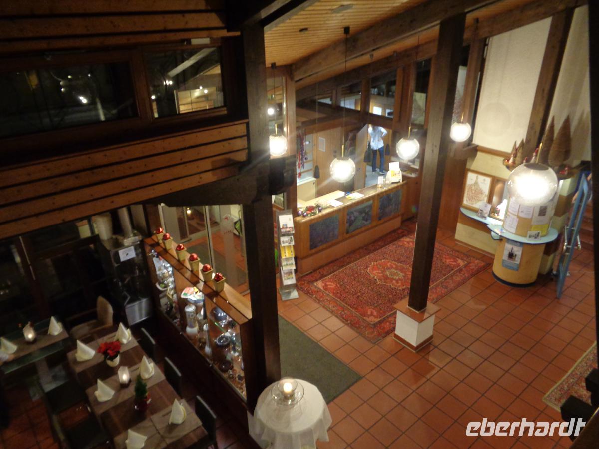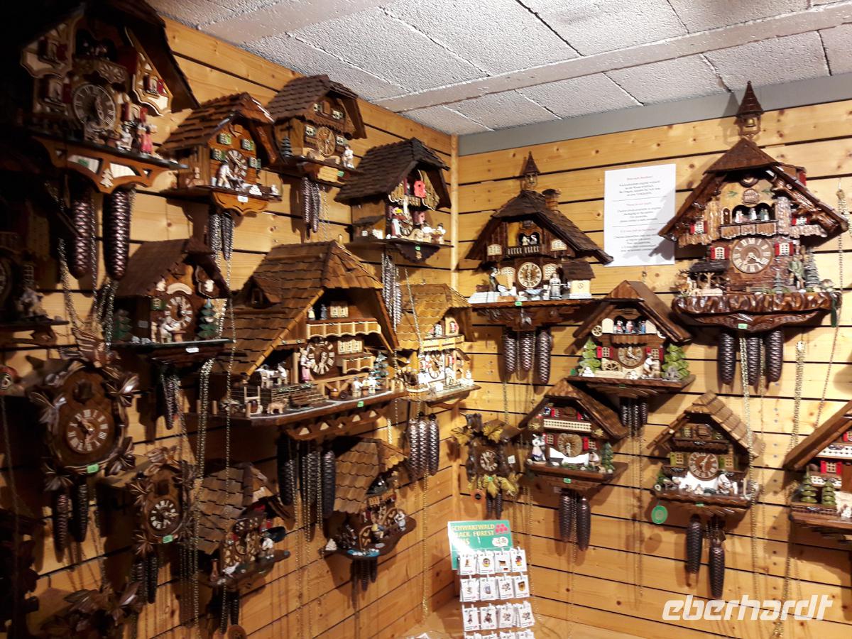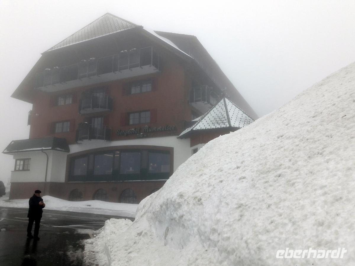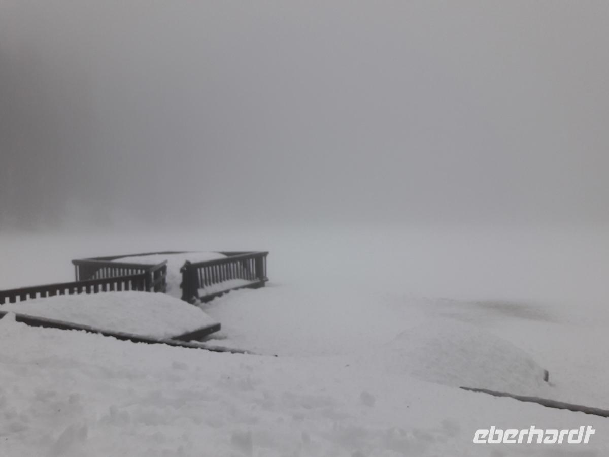 Je höher wir kommen desto düsterer wird das Wetter. Und oberhalb von Kaltenbronn stehen wir mitten in den tief hängenden Wolken. Es schneit sogar und es wehrt ein eisiger Wind. Das ist genau das richtige Wetter für einen Glühwein. Der schmeckt bei dieser Witterung noch einmal so gut. Nur mit der Sicht von der Schwarzwaldhochstrasse auf den Oberrheingraben und die gegenüberliegenden Vogesen wird es heute nichts. Doch auch dieses Wetter hat durchaus seinen Reiz, denn wie Gespenster wabern die dichten Nebelschwaden durch die Fichten. Wir passieren den Schwarzenbachstausee und machen Rast am Mummelsee, unterhalb der Hornisgrinde mit 1164 m. Hier kehren wir kurz ein, denn man kann einen kleinen Imbiss in Form von Brezen oder Schmalzstullen usw. zu sich nehmen. Auch ein Laden nebenan bietet alles, was sich der geneigte Tourist so mit nach Hause nehmen möchte: z. B. Kuckucksuhren, Schwarzwälder Schinken, Kirschwasser, Früchtebrot etc. Selbst an die Bommelhüte der weiblichen Tracht hat man gedacht.