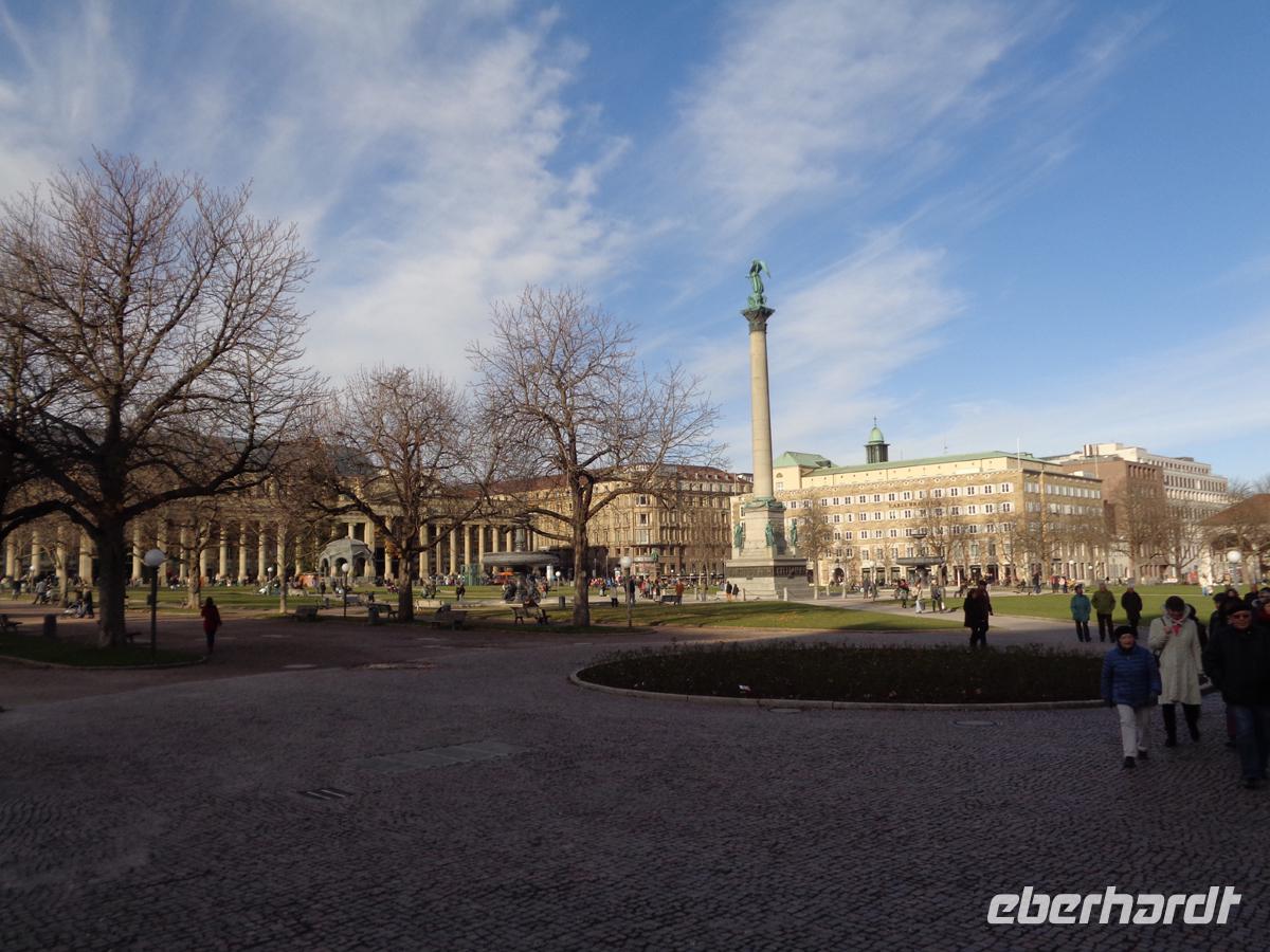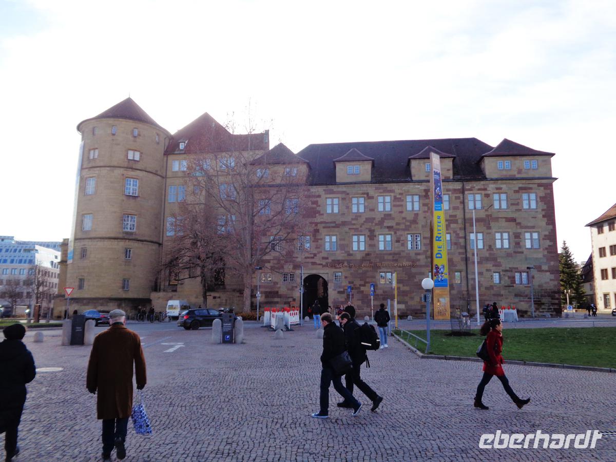 Da noch etwas Zeit ist, unternehme ich mit den Gästen einen kleinen Spaziergang durch die Stuttgarter Innenstadt. Unweigerlich kommen wir auch an der Großbaustelle des Stuttgarter Bahnhofes vorbei. Wir erhaschen einen Parkplatz direkt am alten Schloss und sind von hier aus im Nu auf dem Marktplatz und schlendern von dort aus zum Schillerplatz, wo sich nach 1945 noch einige wenige Gebäude aus früheren Zeiten erhalten haben. Der Schlossplatz stellt den Abschluss dar. Hier überwiegen Gebäude aus Stuttgarts Zeit als Residenzstadt unter den Herzögen und Königen von Württemberg. Also das alte und das neue Schloss, der Königsbau und die Jubiläumssäule. Zudem das Kunsthaus und das erst 2005 eröffnete neue Kunstmuseum.