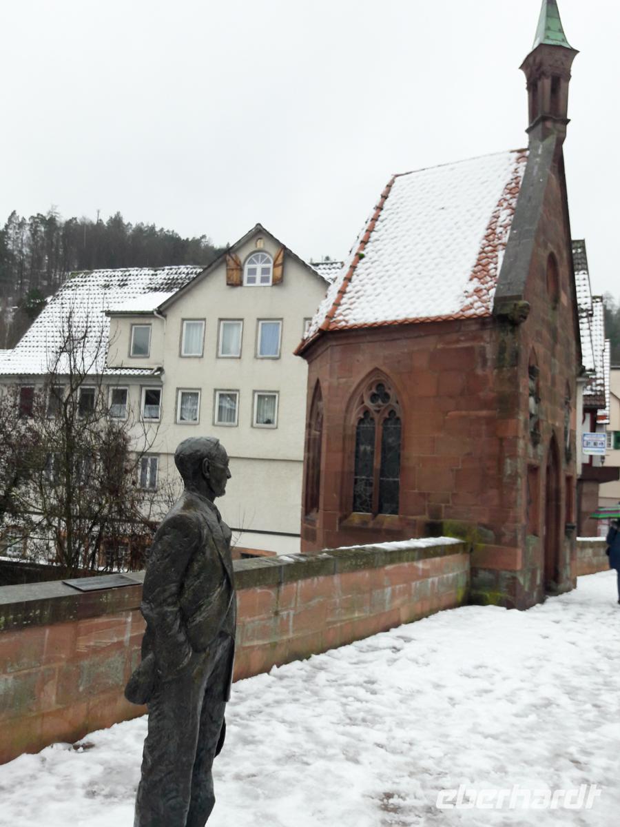 Heute empfängt uns nach dem opulenten Frühstück ein örtlicher Reiseleiter, welcher uns einen Teil seiner Heimat, nämlich den Schwarzwald zeigen möchte. Unsere Reise geht zunächst in die Stadt Calw, dem Geburtsort von Hermann Hesse. In Bronze gegossen steht er auf der Nikolausbrücke vor der gleichnamigen mittelalterlichen Kapelle. Calw an der Nagold ist eine fast gänzlich aus Fachwerk gebaute Stadt, deren pittoreske Häuser auch bei dem Regen, welcher uns begleitet noch sehr schön anzuschauen sind. Auf unserer Weiterfahrt hoch hinauf fahren wir kurz nach Bad Wildbad hinein, um uns die alte, mondäne Kurarchitektur anzuschauen. Nach Baden Baden war dieser Ort für die oberen Zehntausend der meistbesuchte Kurort der Gegend.