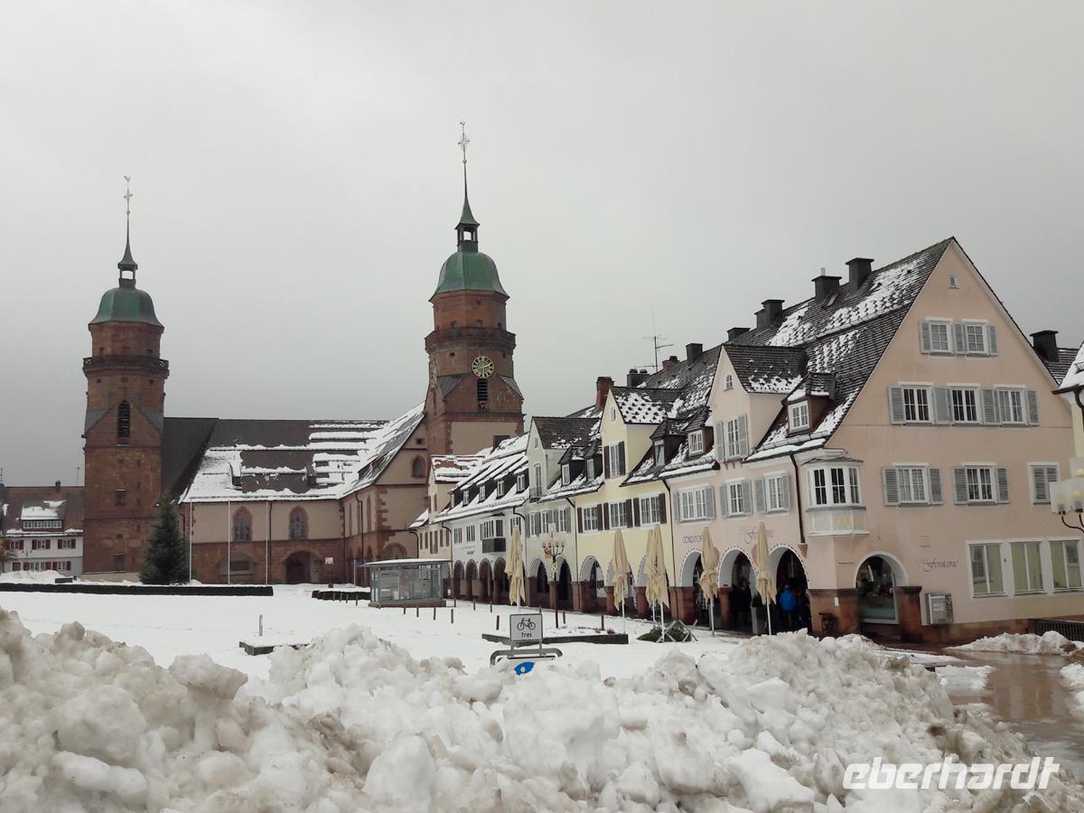 Wir reisen durch dunkle Fichtenwälder ins Tal der roten Murg, fahren an Forbach vorbei und erreichen Freudenstadt. Diese Stadt besticht durch einen riesigen Marktplatz, der komplett mit Laubengängen umgeben ist. So kann einem der Regen auch gar nichts anhaben, während man die Auslagen in den Schaufenstern der vielen geöffneten Geschäfte bestaunt. Das machen wir auch, nachdem wir die Knickkirche besichtigt haben, die aus derselben Zeit stammt, wie die gesamte Stadt. Ab 1599 wurde vom Architekten Heinrich Schickert im Auftrag Herzog Friedrich I. planmäßig angelegt, und nach den Zerstörungen im 2. Weltkrieg detailgetreu wieder errichtet. Nach der Besichtigung der Kirche, die tatsächlich um die Ecke gebaut wurde gehen die meisten von uns in den verschiedenen Cafés der Stadt ein Stück Schwarzwälder Kirschtorte essen, um danach in der individuellen freien Zeit noch ein wenig in den vielen interessanten Läden zu stöbern.