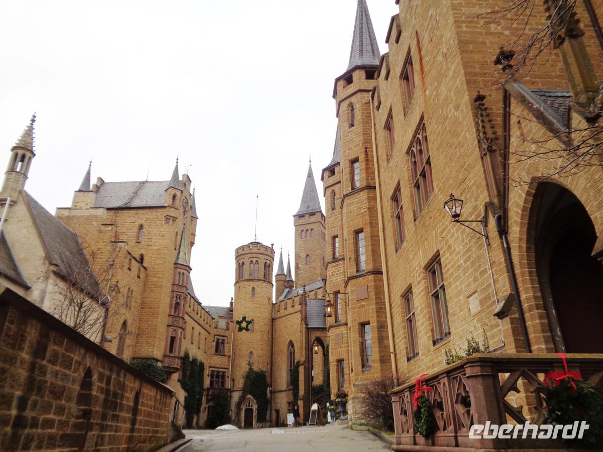 Heute steht zunächst ein Besuch der Burg Hohenzollern auf dem Programm. Schon von weitem ist die mächtige Anlage zu sehen. Es ist bereits die dritte Burg auf diesem Berg und stammt aus der 2. Hälfte des 19. Jh. Es handelt sich also um eine Burg im Stil des Historismus, wie man sich eben eine romantische Ritterburg zu Kaisers Zeiten vorstellte. Vom Parkplatz aus sie es doch noch gut 1,5 km steil bergan. Aber es gibt einen Pendelbus, den den Gäste nicht extra bezahlen müssen. Das erledigt Eberhardt-travel für sie. Nach einer guten Weile stehen wir auf dem romantischen Burghof und besichtigen zunächst die beiden Kirchen. Dann öffnet sich die Schlosstür und wir bekommen eine geistreiche, mit Witz gespickte Führung geboten, in der alles Wissenswerte untergebracht ist. Nach soviel Burg lassen wir uns wieder unten auf dem Parkplatz einen heißen Glühwein schmecken, denn der Wind hat doch ordentlich und eiskalt geweht.