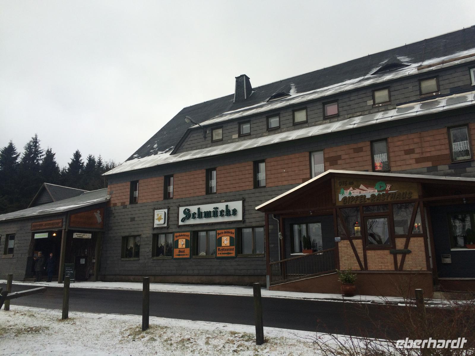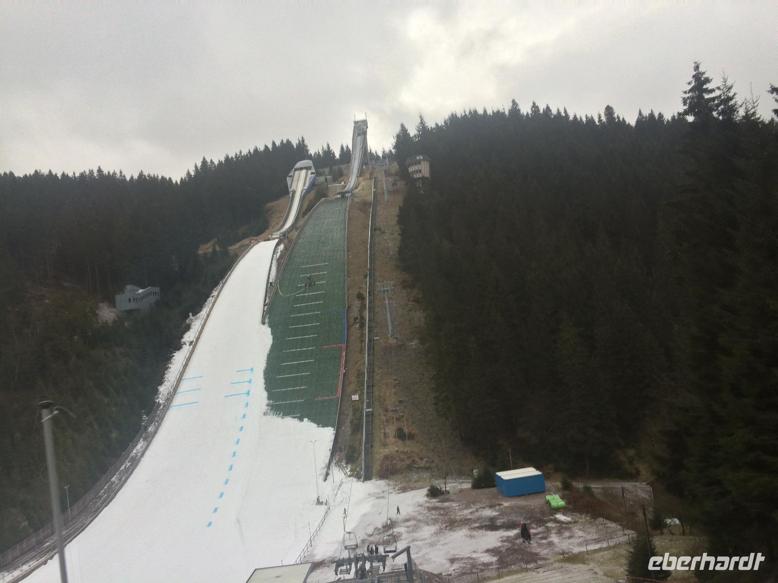 Unsere Route in Richtung Heimat führt uns vorerst nach Oberhof. Hier oben liegt Schnee! Juhu, eine schöne Winterlandschaft, auch wenn die Schneedecke noch recht dünn ist. Wir schauen uns den hübschen Ort mit der Bobbahn und die Ski-Schanzen an. Von der Bobbahn ist nicht all zu viel zu sehen. Aber da! Dort befinden sich die Skisprungschanzen. Es liegt zwar nicht viel Schnee, aber der Anblick genügt schon, um eine leichte Gänsehaut zu bekommen. Nein, also da möchte ich bitte nicht hinunterspringen. Ich glaube, Michael wollte uns was vormachen? Also, wenn man das mal so aus der Nähe sieht: Hut ab, vor den Mutigen, die sich da herunterstürzen. Das Mittagessen lassen wir uns in der „Schmücke" servieren. Es wird wieder viel gelacht und wir wollen auch weitere Wiedersehenstreffen oder Reisen gemeinsam unternehmen. Ich wünsche mir sehr, dass wir diesen Vorsatz für das neue Jahr erfüllen werden.