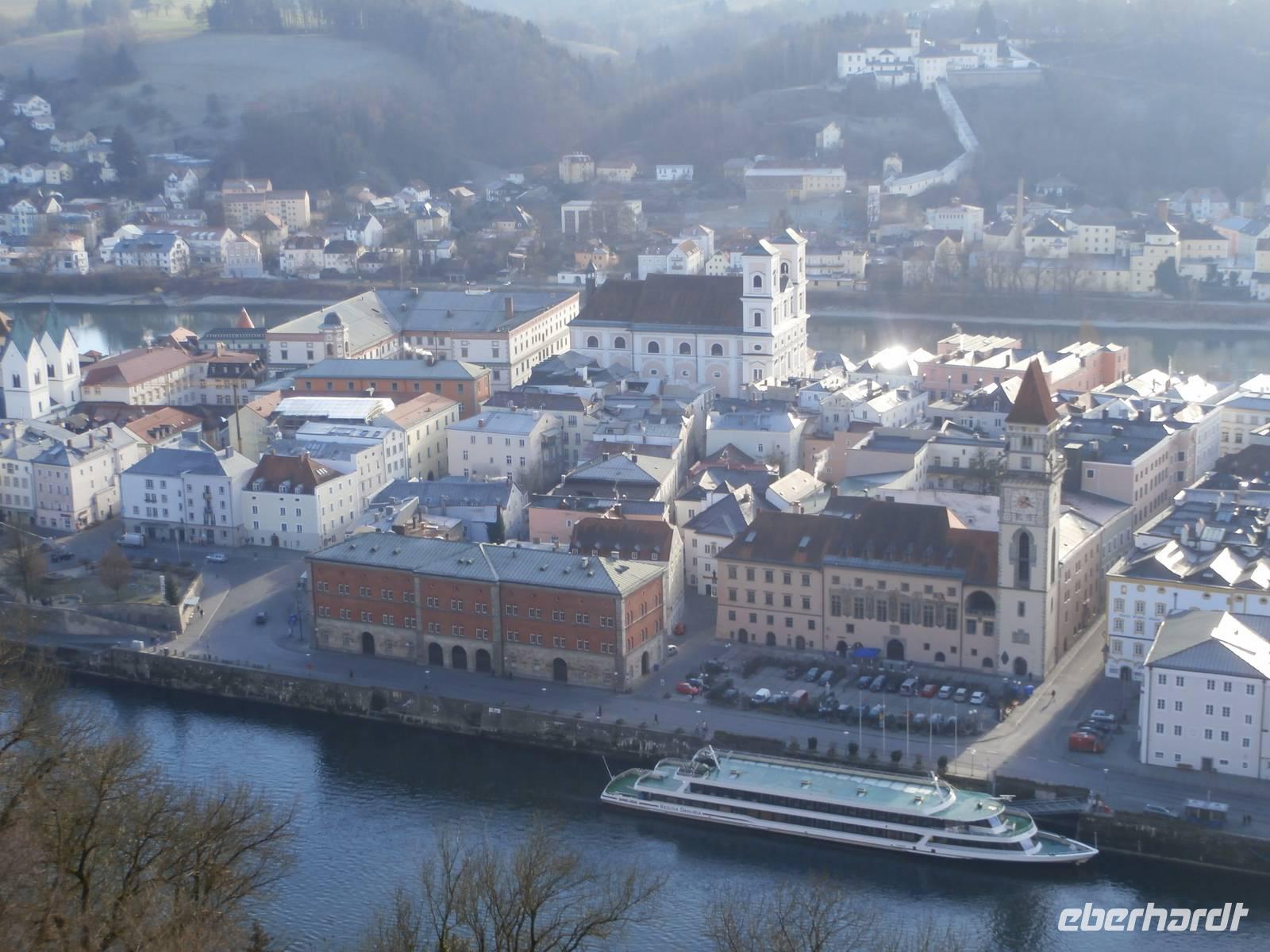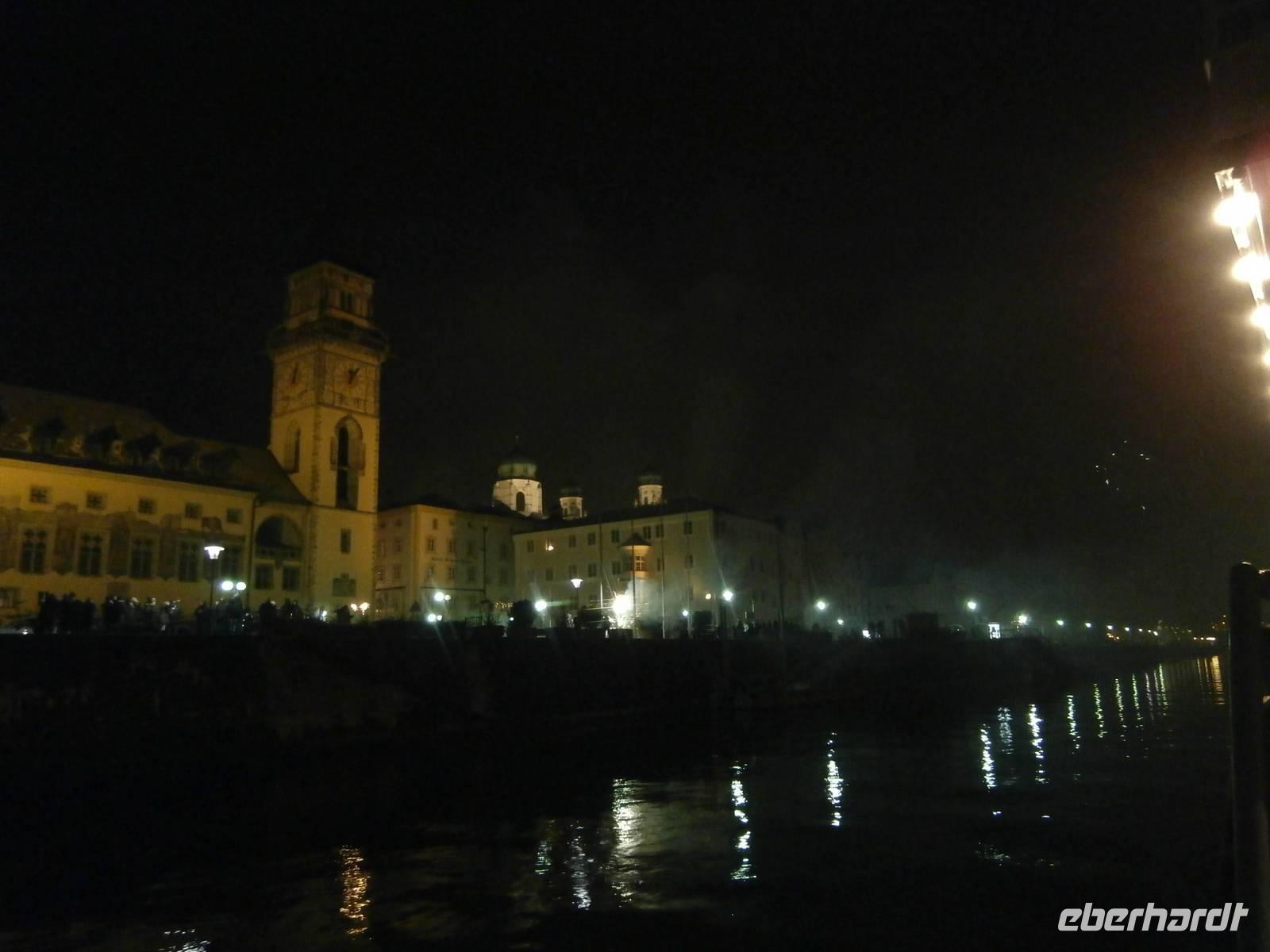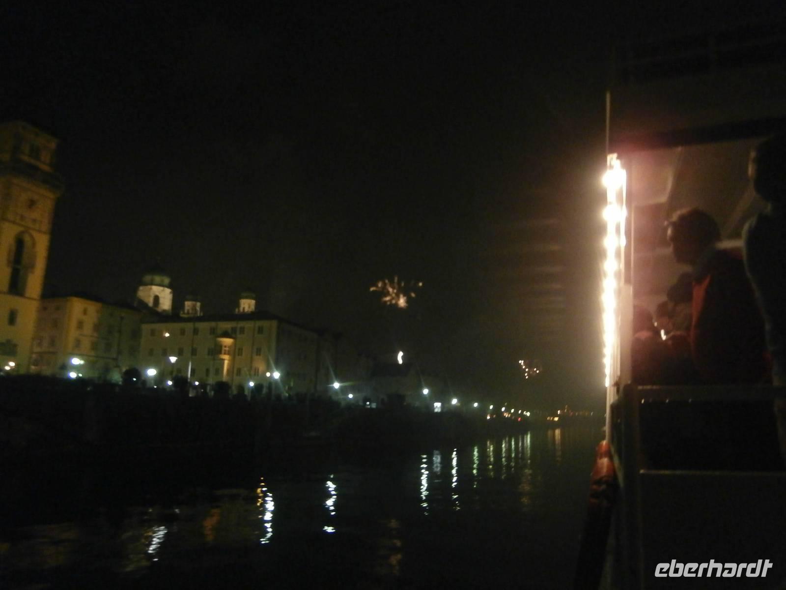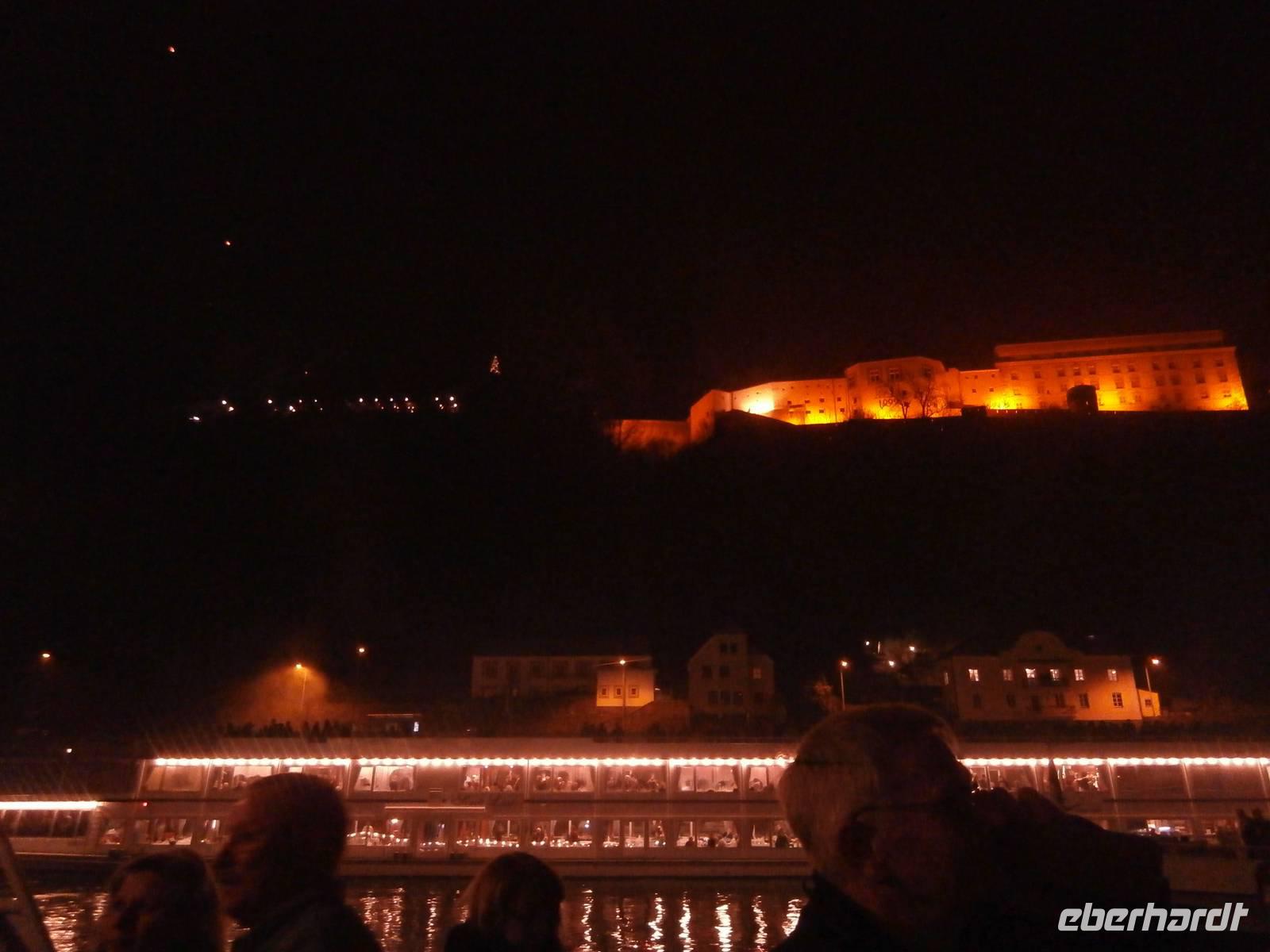 Der letzte Tag des Jahres 2015 führt uns am Vormittag nach Hauzenberg zur Alten Hausbrennerei der Firma Penninger. Dieses traditionsreiche Unternehmen beschäftigt sich immer noch mit der Essigherstellung, aber heute steht die Schnapsbrennerei im Mittelpunkt. Hier befindet sich das Erste Bayrische Schnaps-Museum. Wir erhalten in einem Film Informationen zur Geschichte der Firma sowie zur Herstellung von Essig und Schnaps. Anschließend erhalten wir Kostproben von Blutwurz, Bärwurz und Co. Selbst Essig aus Schlehen verkosten wir, er eignet sich als "Magentratzerl" und soll die Lust aufs Essen steigern. Nach Einkauf und Gruppenfoto geht es weiter hinunter nach Passau. Vor Ankunft im Hotel fahren wir noch bei schönstem Wetter hinauf zur Veste Oberhaus, einfach herrlich der Blick auf die Donau, Inn und den Dom auf seiner Insel. Am Nachmittag holt uns die Stadtführerin Josefine zum Rundgang in Passau ab. Viel Interessantes zur Geschichte der Stadt und deren Sehenswürdigkeiten erzählt und präsentiert sie uns. Auch am Inn laufen wir entlang und zum Abschluss besuchen wir den imposanten Dom. Er steht am höchsten Punkt der Altstadt und reckt sich prunkvoll in den Passauer Himmel. Mit Orgelmusik werden wir von der größten Domorgel der Welt empfangen, wir sind beeindruckt von diesem akustischen Erlebnis. Nach kurzer Ruhepause im Hotel heißt es pünktlich 19.00 Uhr "Leinen los" und mit der "MS Gisela" starten wir zur Flusskreuzfahrt ins Neue Jahr 2016. Unser "Partydampfer" schippert uns ins bayrisch-österreichische Donautal bis hinunter nach Engelhartszell, auch eine Schleusung bei Jochenstein erleben wir zweimal mit. Das Galabuffet ist großartig und vielseitig. Uns schmecken die Köstlichkeiten an Bord und zur Live-Musik wird kräftig das Tanzbein geschwungen. Um Mitternacht erreichen wir wieder Passau und in Nähe des Rathauses genießen wir von Deck aus das Feuerwerk über der Stadt. Ein tolles Erlebnis! Prosit Neujahr! Sekt ausgegeben vom Reiseveranstalter Eberhardt Travel und Mitternachtssuppe runden das Silvester Event an Bord der „MS Gisela" ab.