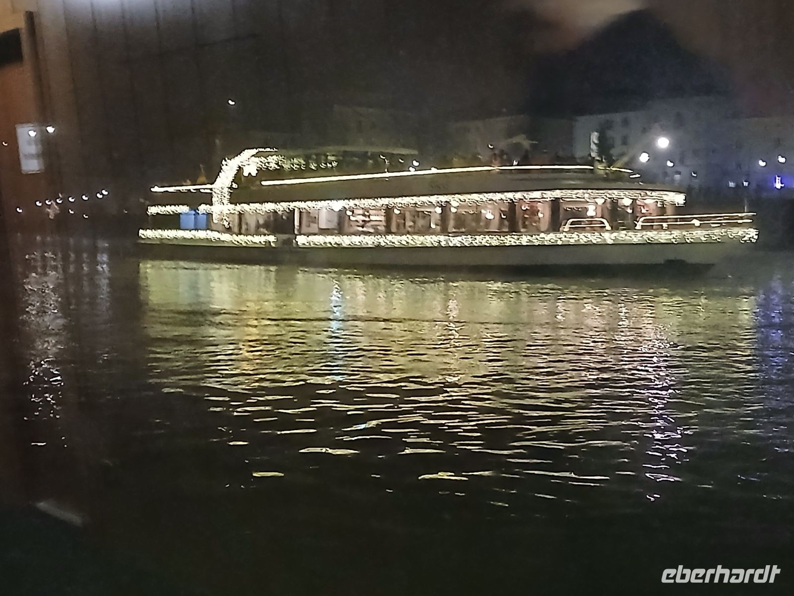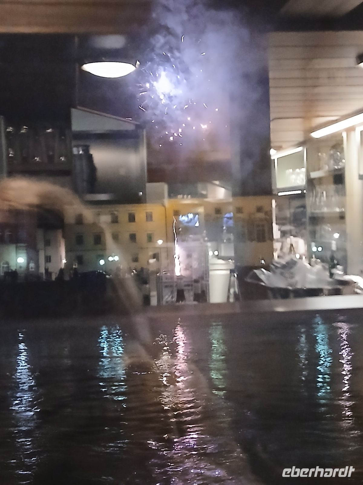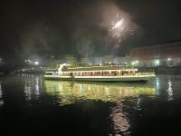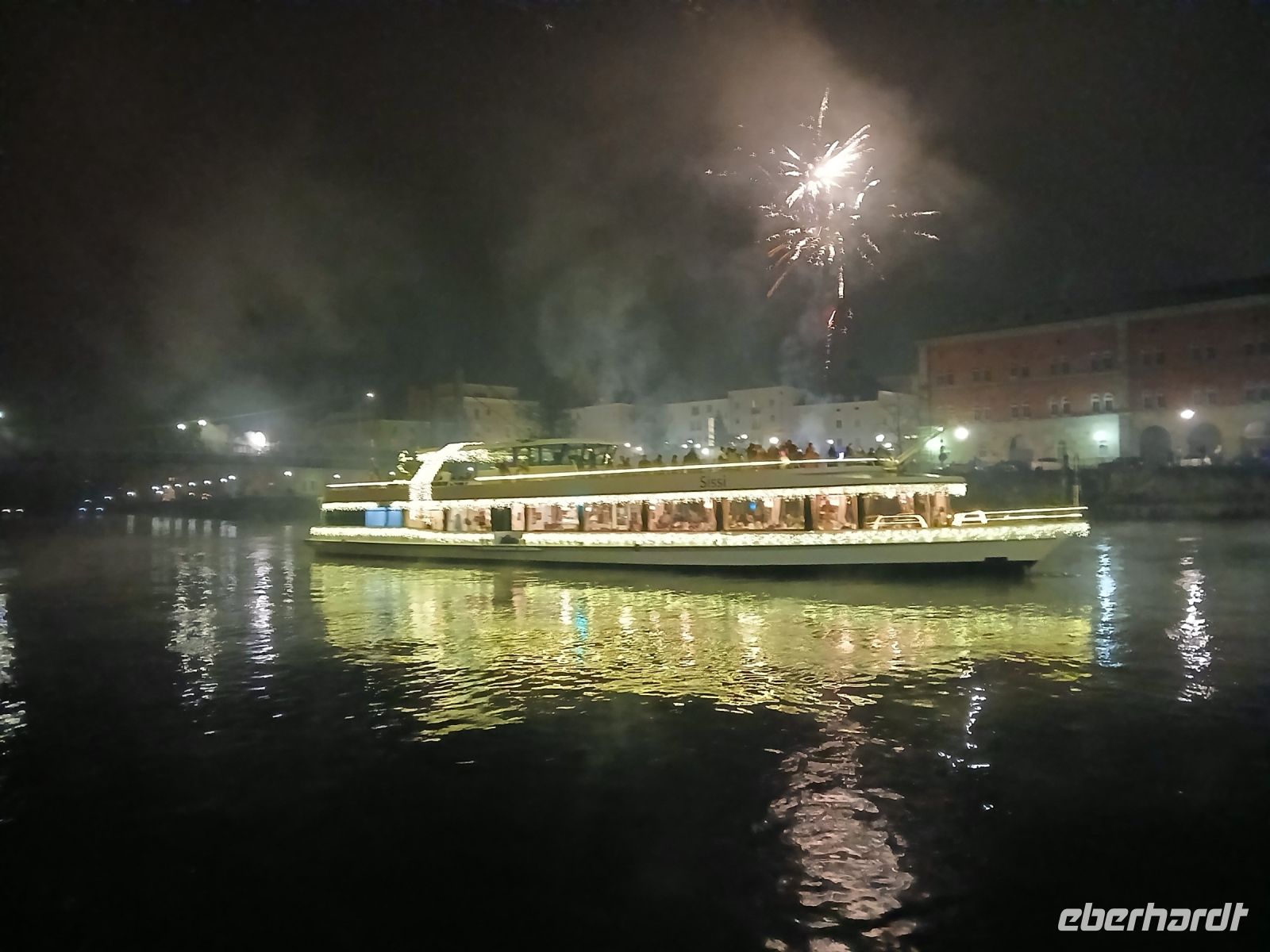 Nachdem wir wieder "fit" und "aufgehübscht" sind ,bringt uns unser eberhardt- Bus zeitig zur Anlegestelle der Schiffe, was ein enormer Vorteil bei der Parkplatzwahl ist. Dort verkürzen wir uns die Wartezeit mit Silvestergedichten, - geschichten und Musik. Auf dem Schiff " Stadt Linz" erlebten wir einen phantastischen Silvesterabend. Während der nächtlichen Fahrt auf der Donau genossen wir bei Musik und Tanz, ein reichhaltiges Büfett und grüßten winkend und einander zuprostend die vorbeifahrenden Schiffe. Nach Mitternacht konnten wir uns vom Schiff aus am Silvesterfeuerwerk der Stadt Passau erfreuen.