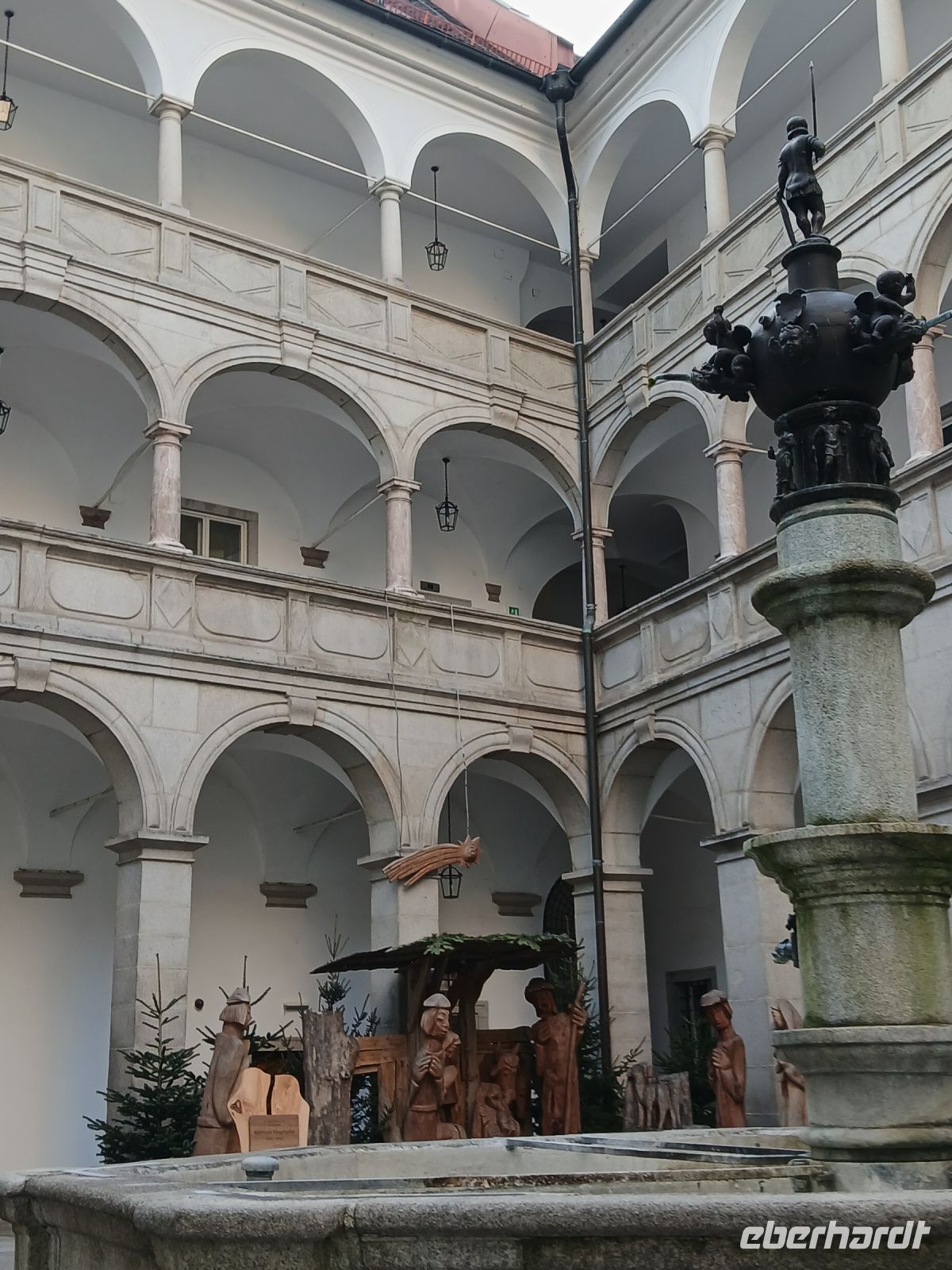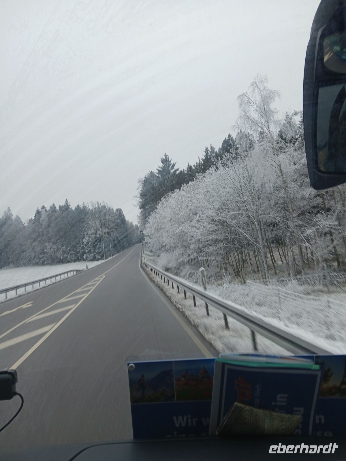 Heute fährt der größte Teil unserer Reisegruppe mit dem Bus durch die Oberpfalz und den von Raureif "verzuckerten" , und somit sehr romantisch wirkenden, Bayrischen Wald. An höhergelegenen Stellen liegt sogar Schnee. Das tut der Seele gut. Fürs körperliche Wohlbefinden sorgt ein Halt in Böbrach, bei der Penninger - Brauerei. Hier kosten wir nicht nur den berühmten gesundheitsfördernden Bär -und Blutwurz, sondern auch verschie-