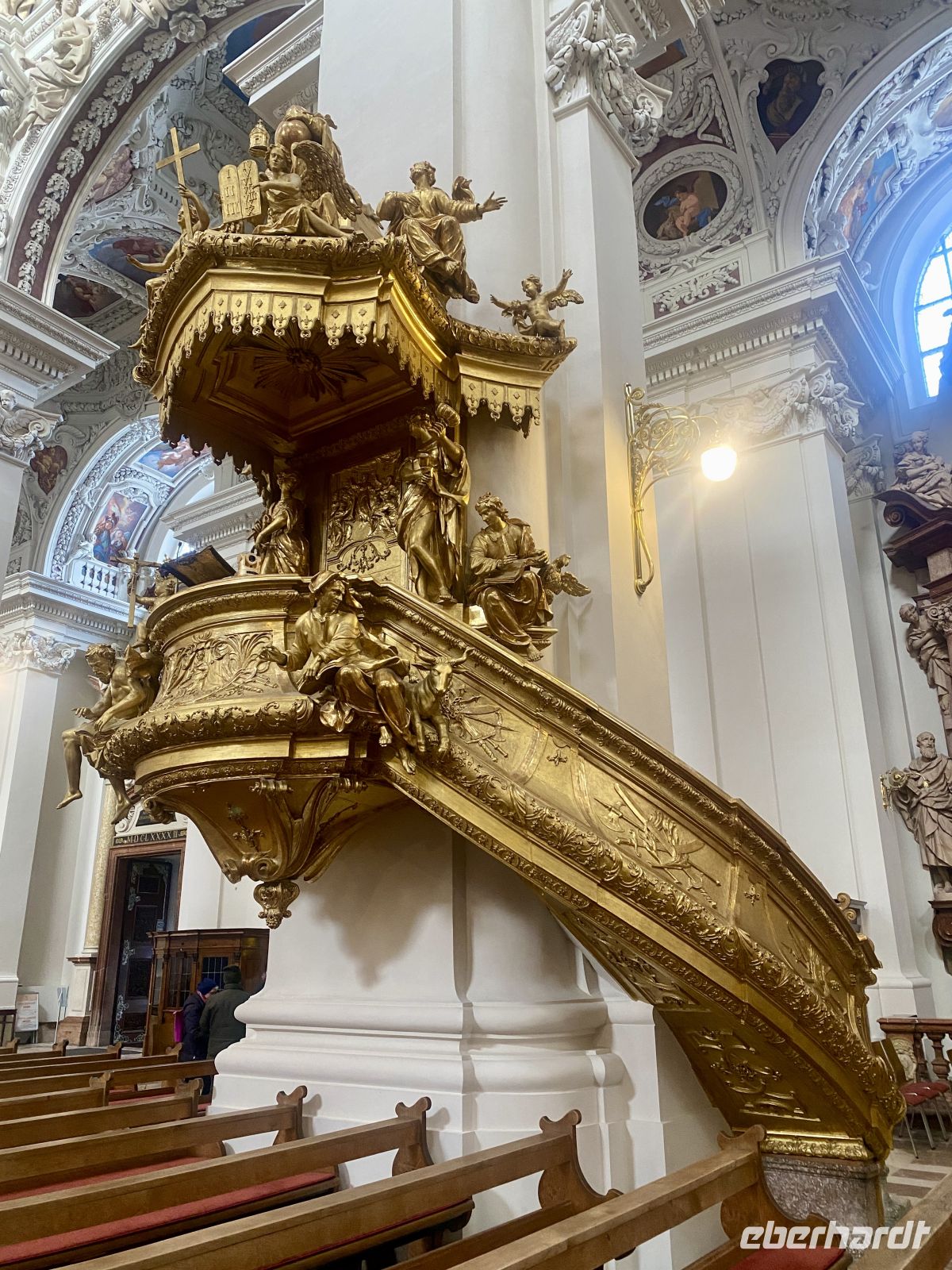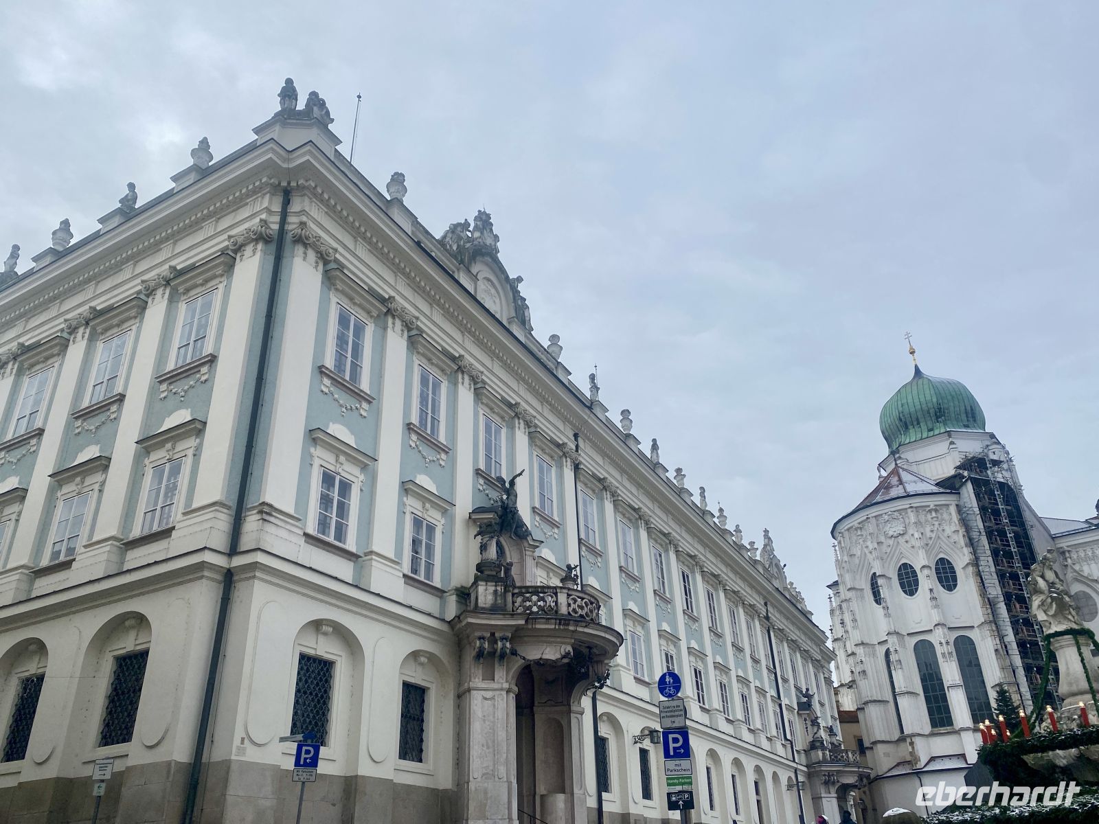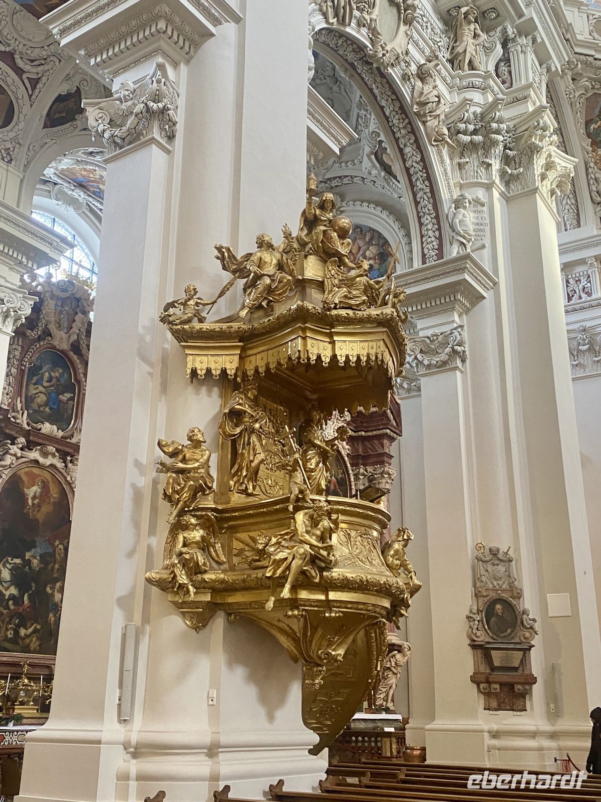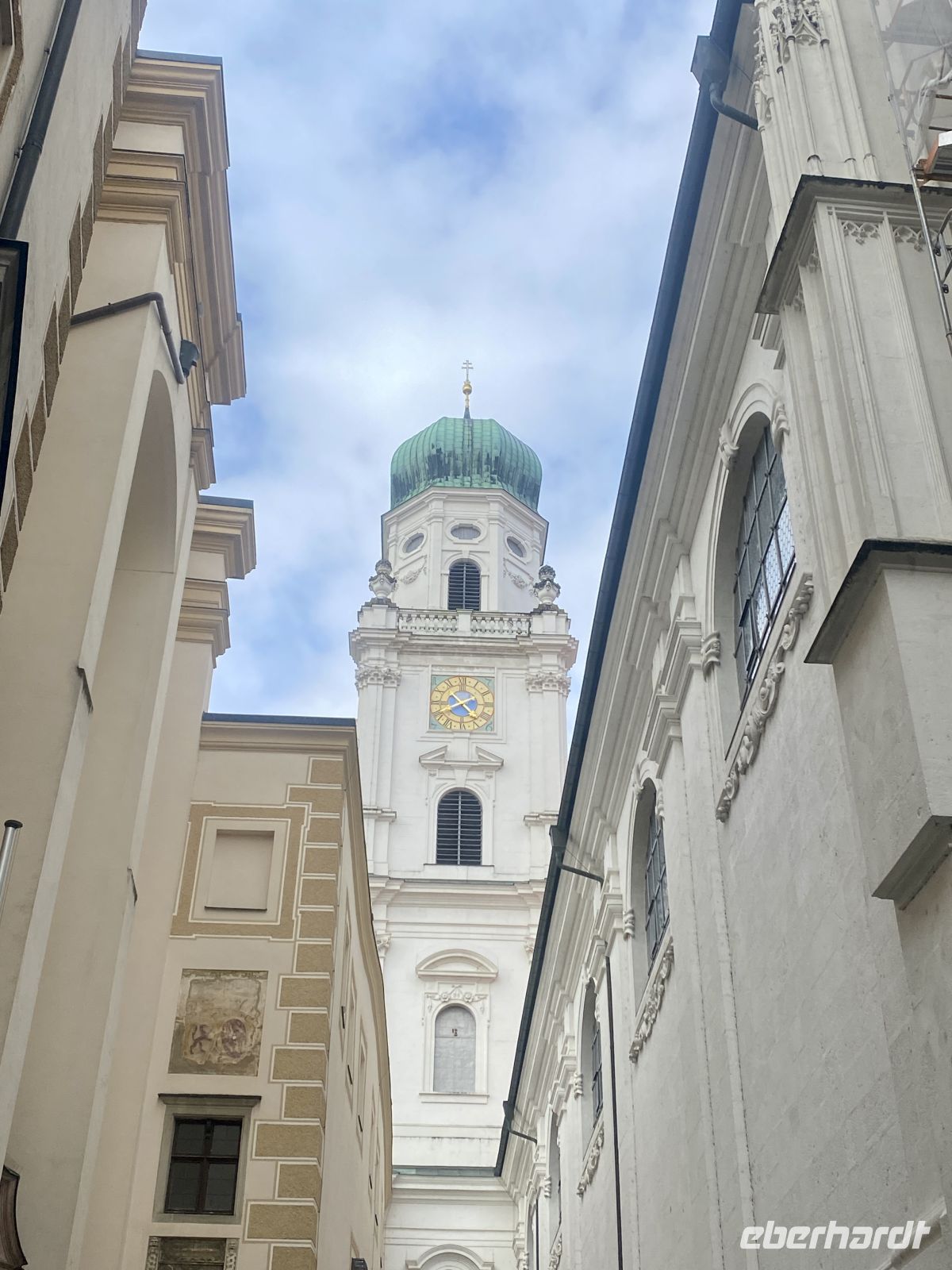 Nach einem ausgiebigen Frühstück treffen wir uns mit weiteren Eberhardt-Gästen, um uns die altehrwürdige Bischofsstadt erklären zu lassen. Dafür zuständig sind zwei sympathisch-kauzige Stadtführer, die uns stolz und mit dem nötigen Humor ihre Heimat präsentieren. Durch engste Gassen gelangen wir zum alles überragenden Dom, einem mit Gold und Stuck reichlich verzierten Barockbau, der dank seiner gotischen Vergangenheit eine ehrfurchteinflößende Höhe aufweist. Zwar wird das Prunkstück, die mit 18000 Pfeifen größte Kirchenorgel der Welt, gerade renoviert, doch schmälert diese Baustelle unseren Kunstgenuss in keinster Weise. Weiter geht es dann vorbei am Bischofspalast über den Residenzplatz hinunter zum alten Rathaus, an dem wie an vielen anderen Gebäuden die Hochwassermarkierungen der schlimmsten Überschwemmungen verzeichnet sind.