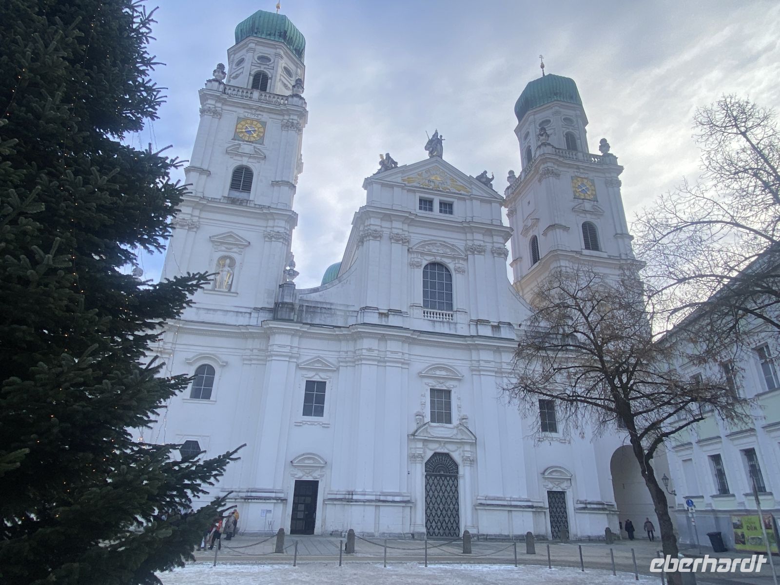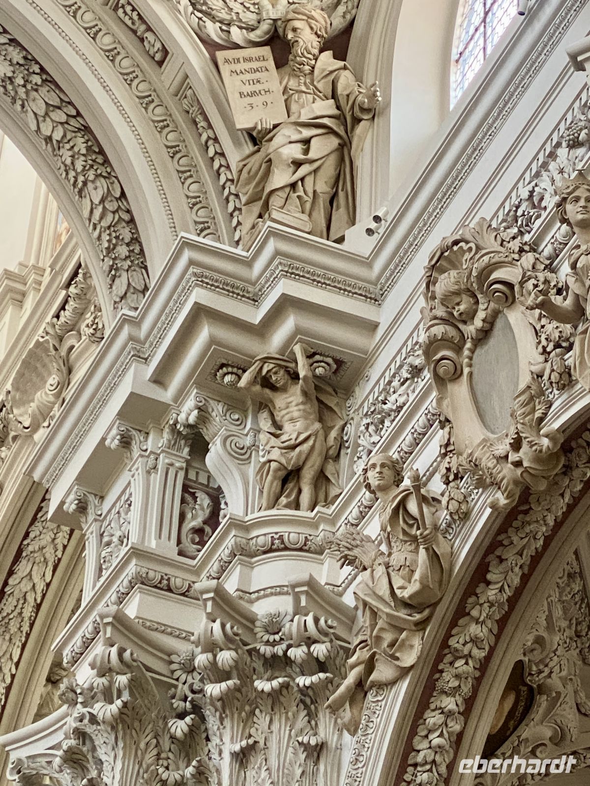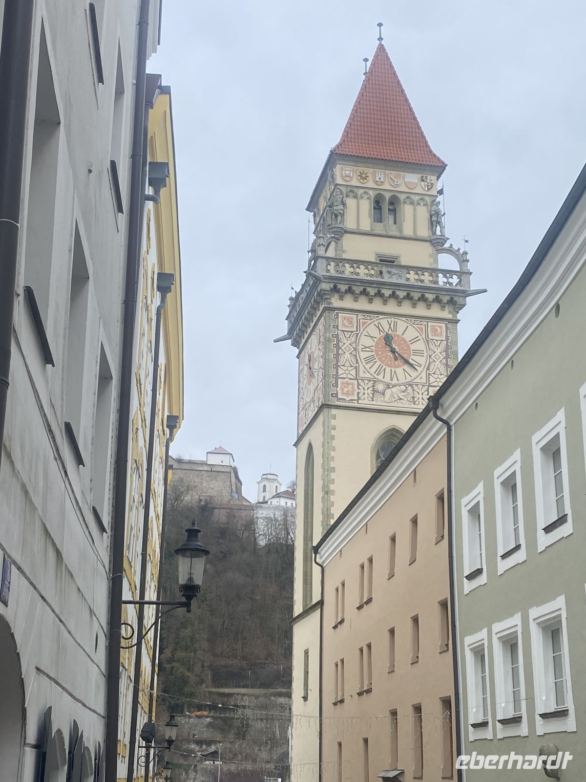 Nach einem ausgiebigen Frühstück treffen wir uns mit weiteren Eberhardt-Gästen, um uns die altehrwürdige Bischofsstadt erklären zu lassen. Dafür zuständig sind zwei sympathisch-kauzige Stadtführer, die uns stolz und mit dem nötigen Humor ihre Heimat präsentieren. Durch engste Gassen gelangen wir zum alles überragenden Dom, einem mit Gold und Stuck reichlich verzierten Barockbau, der dank seiner gotischen Vergangenheit eine ehrfurchteinflößende Höhe aufweist. Zwar wird das Prunkstück, die mit 18000 Pfeifen größte Kirchenorgel der Welt, gerade renoviert, doch schmälert diese Baustelle unseren Kunstgenuss in keinster Weise. Weiter geht es dann vorbei am Bischofspalast über den Residenzplatz hinunter zum alten Rathaus, an dem wie an vielen anderen Gebäuden die Hochwassermarkierungen der schlimmsten Überschwemmungen verzeichnet sind.