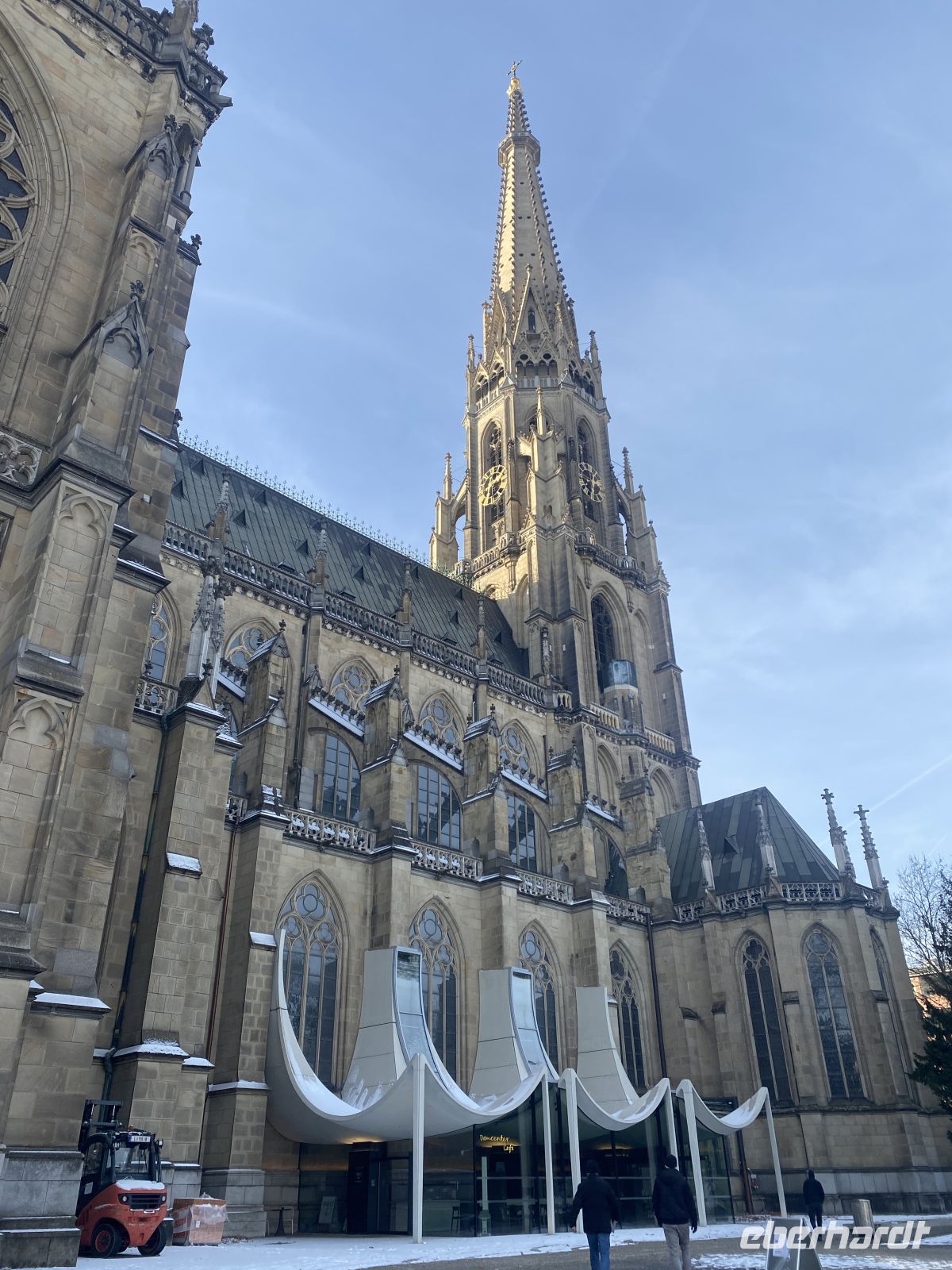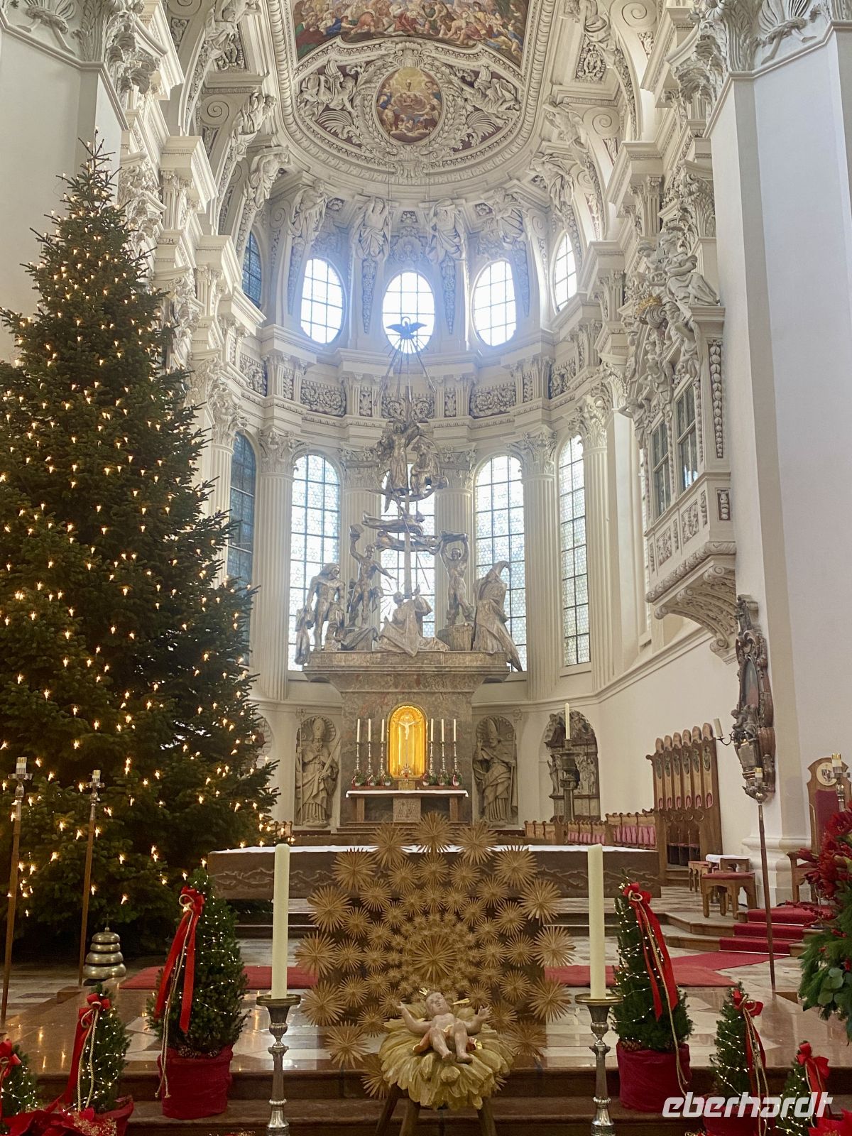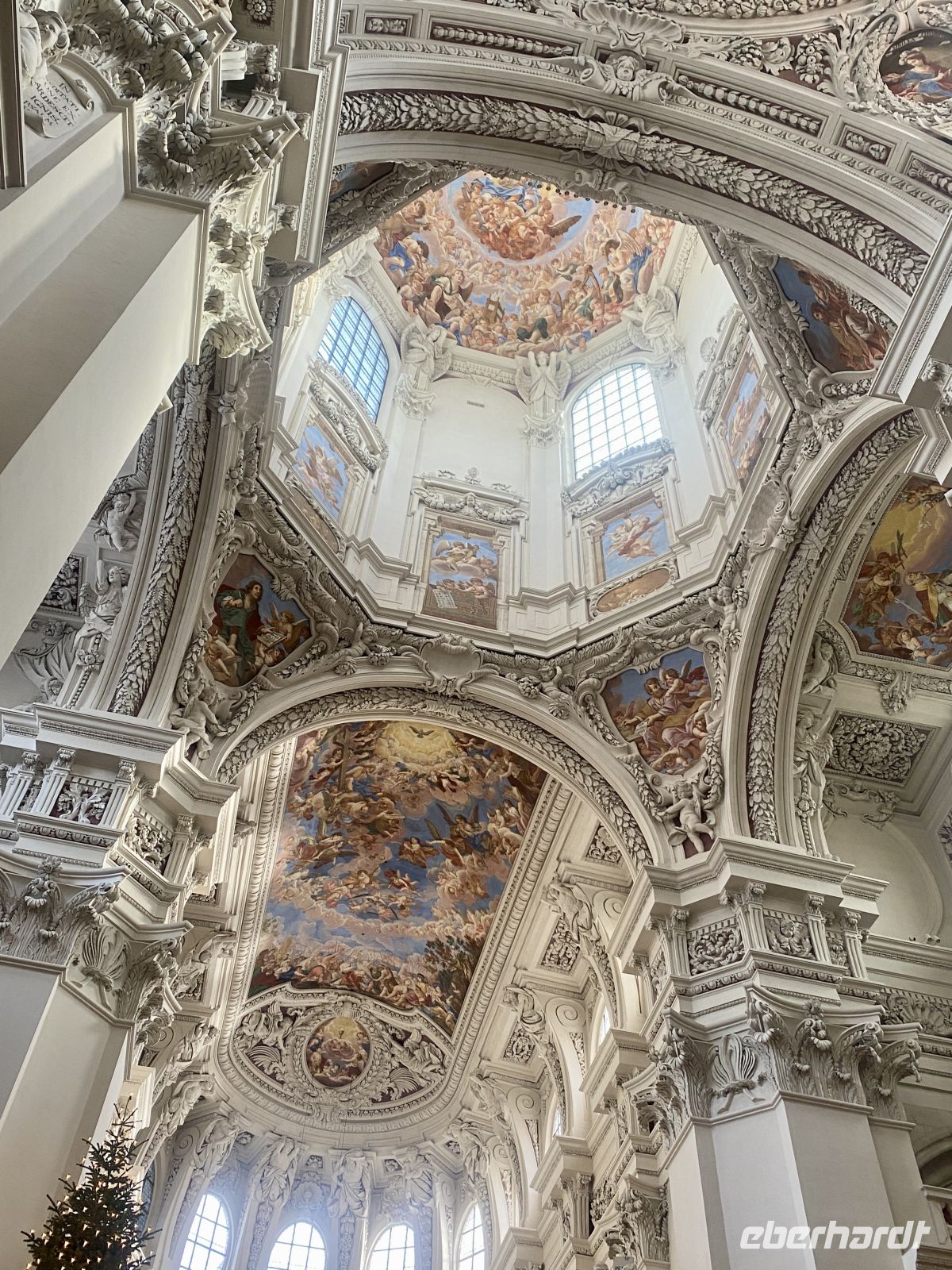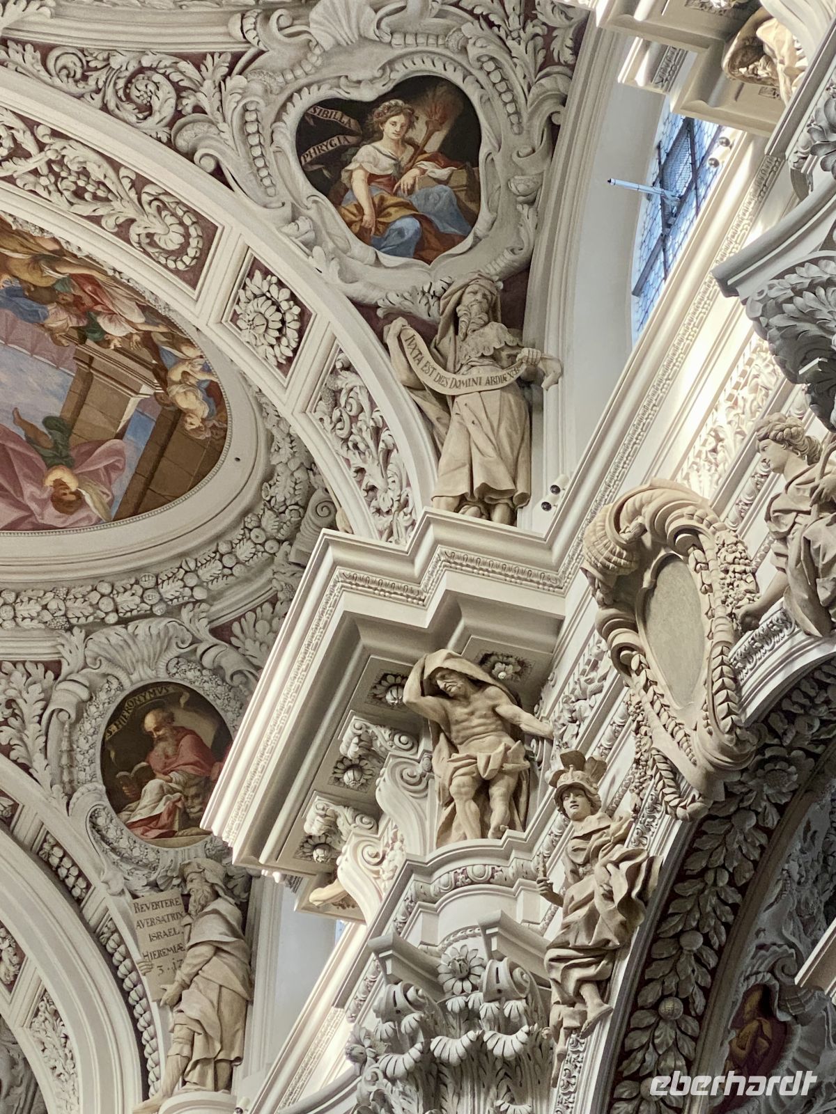 Nach einem ausgiebigen Frühstück treffen wir uns mit weiteren Eberhardt-Gästen, um uns die altehrwürdige Bischofsstadt erklären zu lassen. Dafür zuständig sind zwei sympathisch-kauzige Stadtführer, die uns stolz und mit dem nötigen Humor ihre Heimat präsentieren. Durch engste Gassen gelangen wir zum alles überragenden Dom, einem mit Gold und Stuck reichlich verzierten Barockbau, der dank seiner gotischen Vergangenheit eine ehrfurchteinflößende Höhe aufweist. Zwar wird das Prunkstück, die mit 18000 Pfeifen größte Kirchenorgel der Welt, gerade renoviert, doch schmälert diese Baustelle unseren Kunstgenuss in keinster Weise. Weiter geht es dann vorbei am Bischofspalast über den Residenzplatz hinunter zum alten Rathaus, an dem wie an vielen anderen Gebäuden die Hochwassermarkierungen der schlimmsten Überschwemmungen verzeichnet sind.