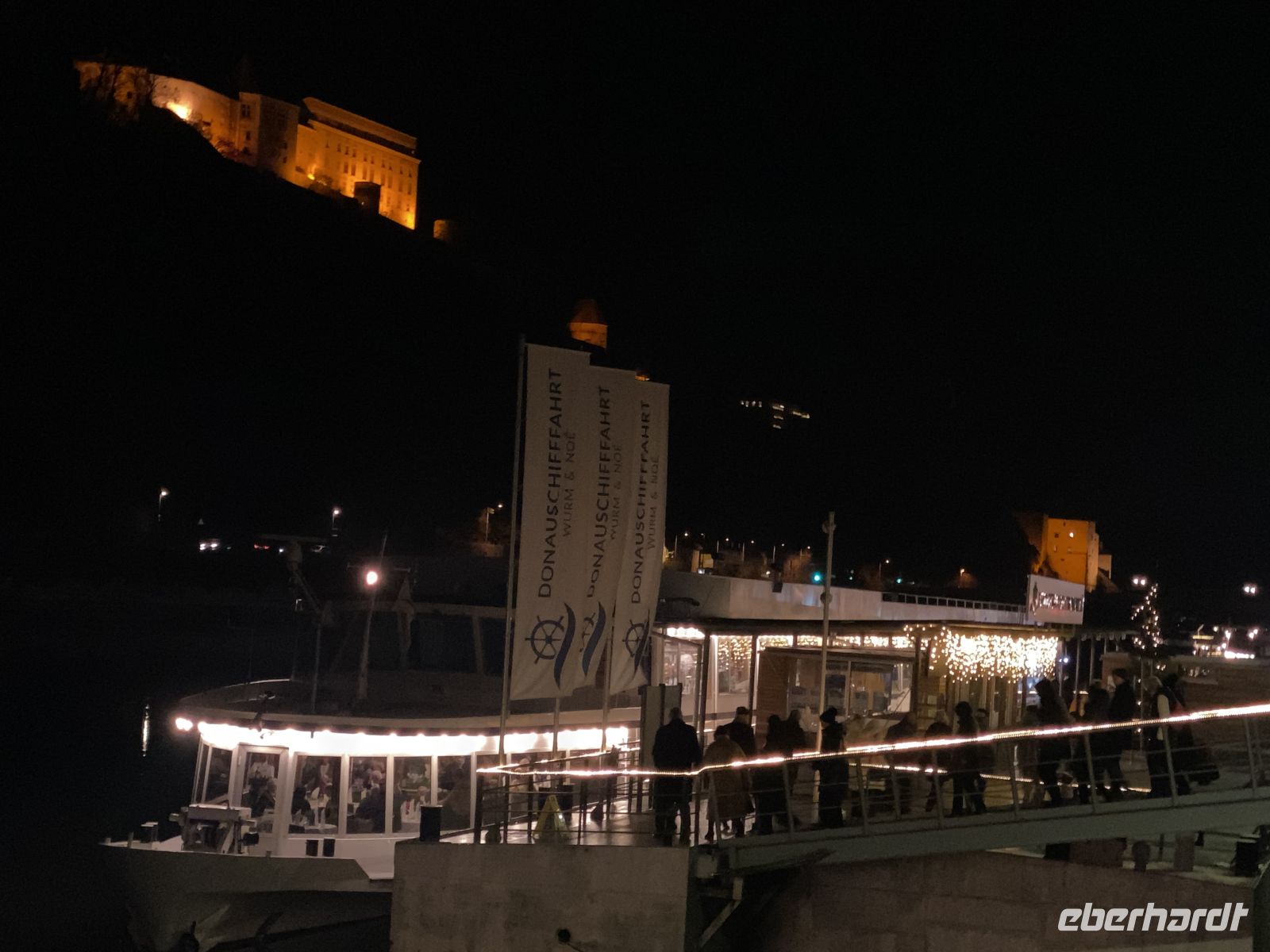Danach können alle die verbleibende Zeit bis zum abendlichen Einstieg ins Schiff auf ihre Weise nützen, ehe dann die große Silvesterfeier losgeht. Auf dem majestätischen Donauschiff "Stadt Linz" quartieren wir uns an sechs langen Tischen ein, laben uns an einem wirklich fürstlichen Gala-Diner, gleiten über den Tanzboden, lachen und feiern den letzten Abend des Jahres, und alles bei einer gemütlichen Fahrt nach Österreich, bei der wir die nächtliche Uferlandschaft genießen und den Gästen der anderen Partyschiffe zuwinken.