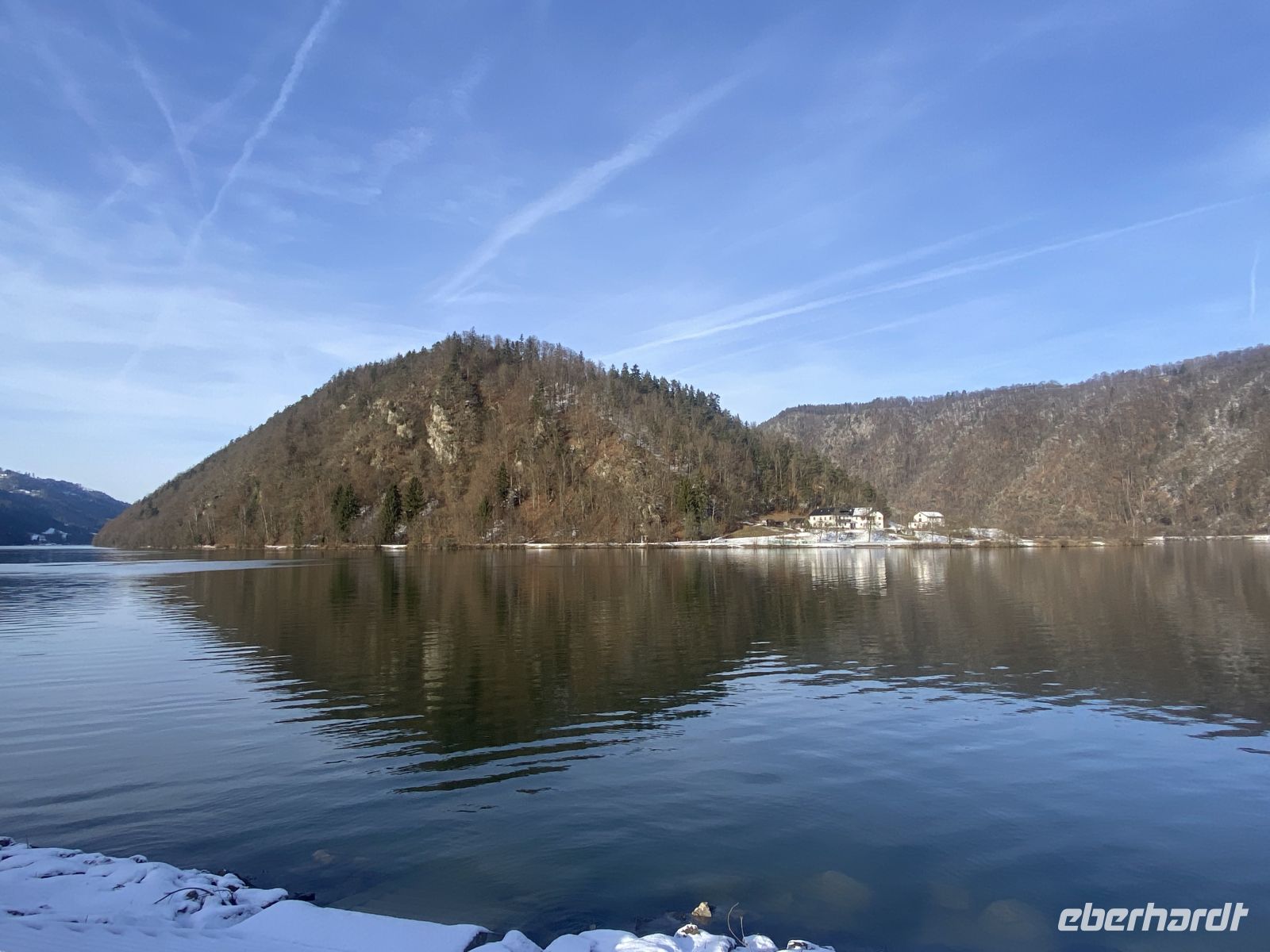 Um zu ausreichendem Schlaf zu kommen, ist das Frühstück heute später terminiert. Danach fahren wir entlang der Donau ins Österreichische und machen einen kurzen Stopp an der berühmten Schlögener Schlinge an der Donau, die hier auf undurchdringliches böhmisches Grundgestein trifft und zwei ausweichende 180°-Biegungen vollführen muss. Bei strahlendem Winterwetter können wir die eindrucksvolle erste Kurve gut erkennen.