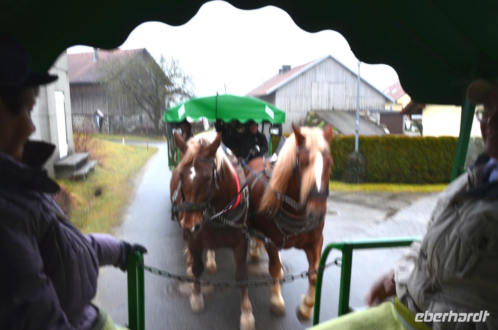 Als kleines eberhardt-Wow gibt es bei der Ankunft eine Schnapsrunde. Dann besteigen wir die Kaltblütergespanne und unternehmen eine regionale Kutschfahrt.