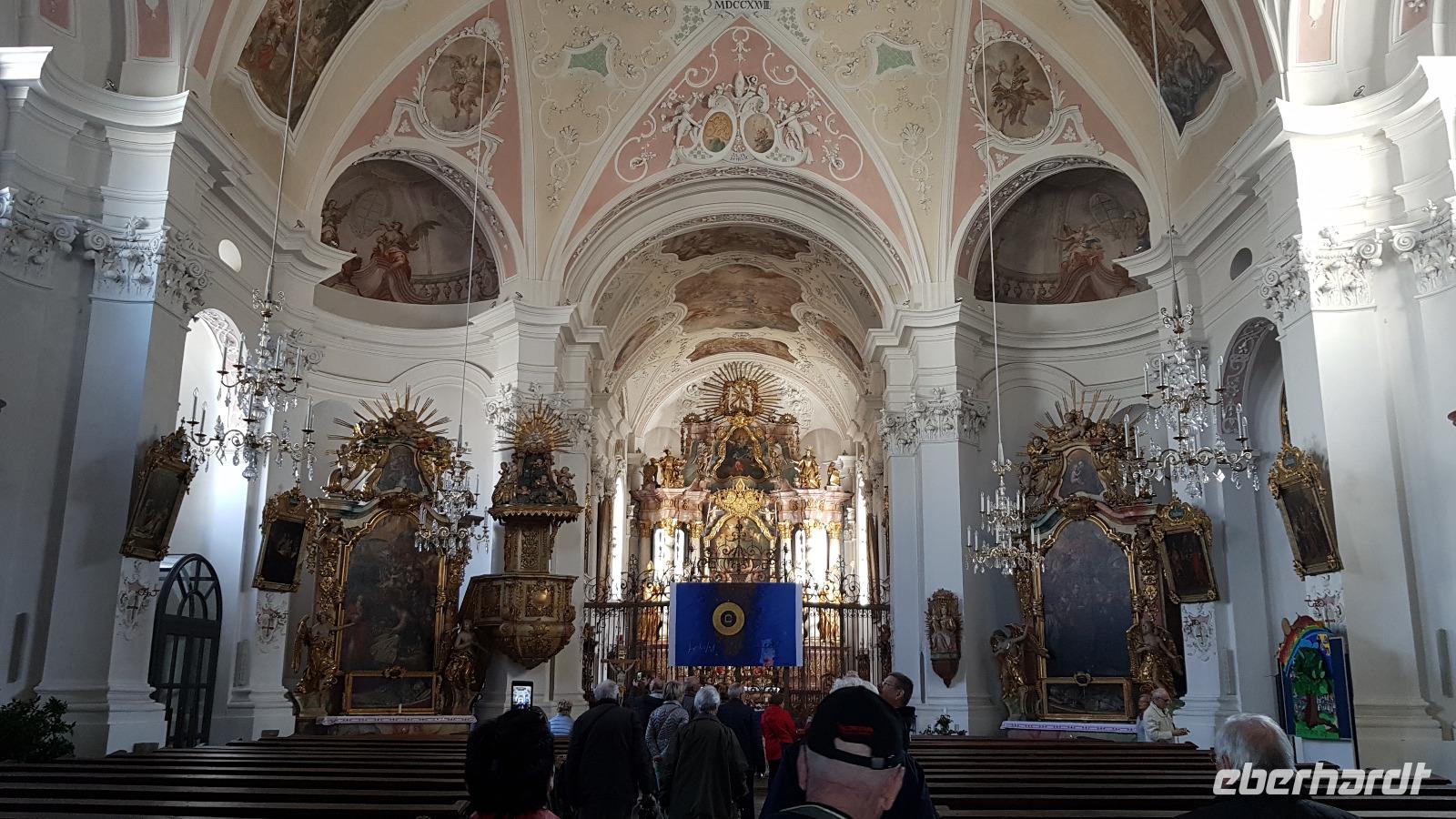 oder wie die Einheimischen sagen:"Kloister". Lustigerweise hat Rinchnach eine Fledermaus als Maskottchen, sie heißt "Fu", das chinesische Wort für Glück oder eben Fledermaus. Sie begrüßt uns am Bach am Ortseingang und hier holt uns unsere Stadtführerin auch ab. Gemeinsam spazieren wir zur alten Klosteranlage. Natürlich hat Rinchnach die schönste Barockkirche des Bayerischen Waldes und wir können uns von der Pracht gleich überzeugen. Sie ist Johannes dem Täufer geweiht und Darstellungen auf den Wandgemälden zeigen u.a. seine Hinrichtung. Dann können wir uns auch im Altarraum umsehen und bestaunen die üppig mit Gold überzogenen Schnitzarbeiten. Noch ein Rundgang im Kreuzgang und dann können wir auch klösterliche Anlagen wie den Bierkeller besichtigen. Es bleibt noch ein wenig Zeit zum Bummeln im Örtchen und dann geht es weiter nach