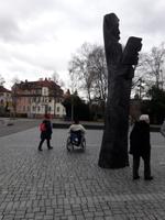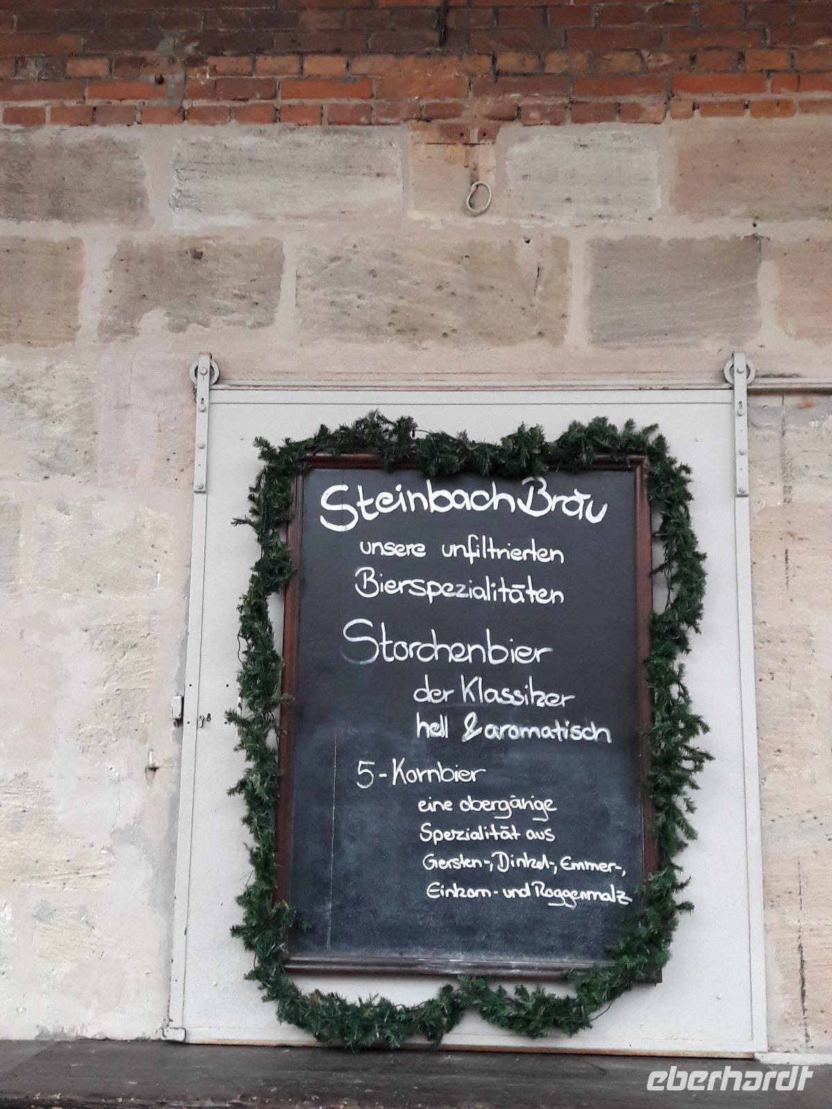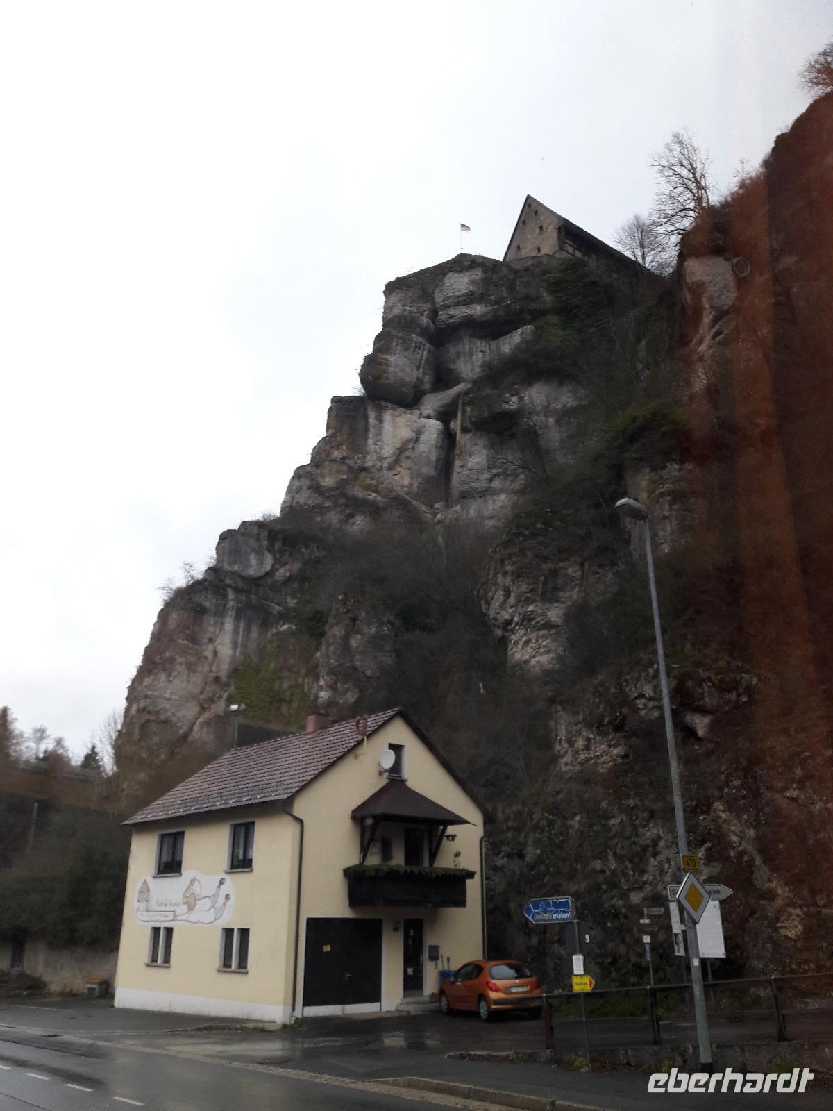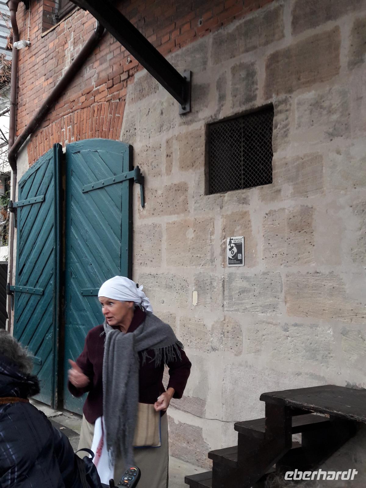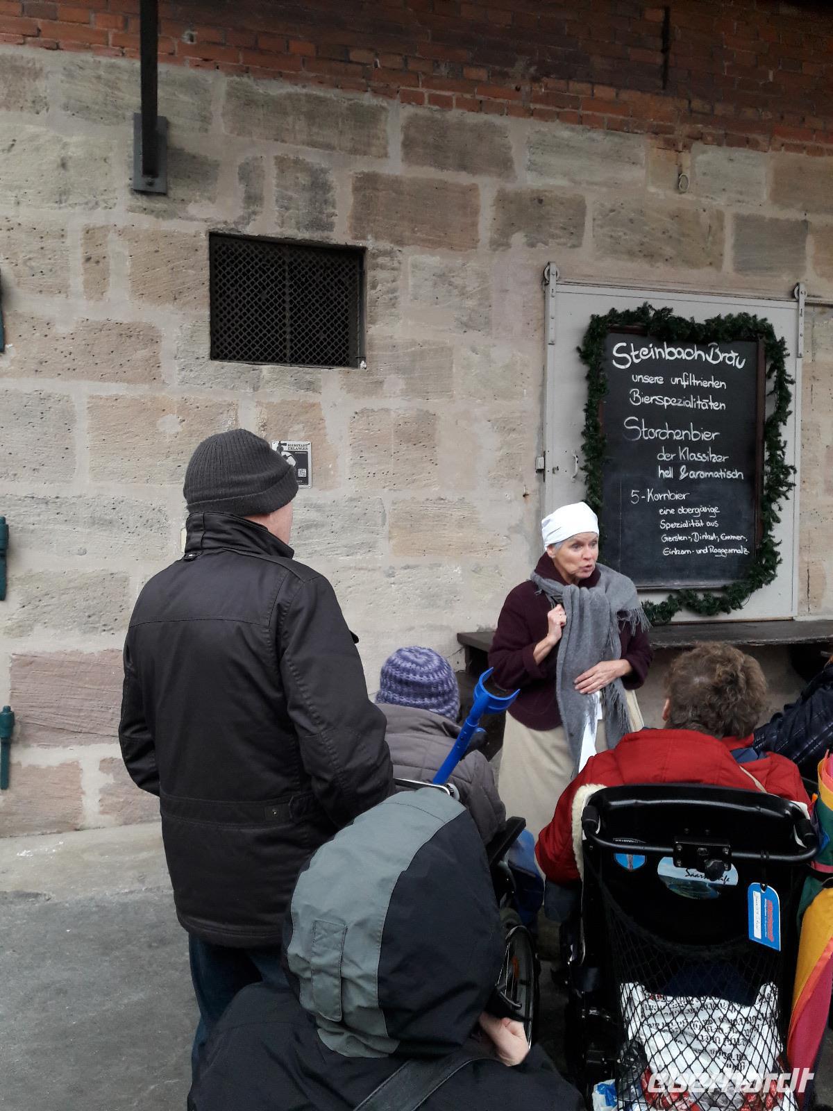 Nach unserem Frühstück laden wir heute relativ spät: unser Ausflug startet 10:00 Uhr. Über Bärenfels bringen uns Thomas und Jörg nach Gößweinstein, DER Wallfahrtsort überhaupt mit einer wunderschönen Basilika, an der uns Thomas auch vorbei bringt. Auch die Burg Gößweinstein erblicken wir auf unsere Fahrt zurück nach Pottenstein. Hier bringt uns Thomas auf die verrückte Idee, an der barrierefreien Sommerrodelbahn zu halten aber leider öffnet diese erst in einer Stunde und damit bleibt uns dieses Vergnügen leider verwehrt. Naja, wir fahren weiter durch die Ortschaft Pottenstein, die am heutigen Samstag Vormittag sehr ausgestorben wirkt. Thomas möchte uns die hiesige Burg Pottenstein, die auf einem Felsen thront, von allen seiten zeigen und anschließend machen wir einen Stopp an der Teufelshöhle. Leider ist diese auch noch geschlossen aber da sie eh nicht barrierefrei ist, können wir Fußgänger wenigstens in den Eingangsbereich der Höhle gehen um ein Erinnerungsfoto zu knipsen. Unsere Rundfahrt führt uns weiter über die B2 in Richtung Auerbach und somit fahren wir auch ein Stück entlang der Burgenstraße. In Hersbruck suchen wir nach einer behindertengerechten Toilette, damit wir hier auch gleich eine Pause einlegen können. Da aber leider keine auffindbar ist, nehmen wir Kurs auf die Autobahn und halten an der Raststätte Nürnberg-Feucht, wo wir auch gleich eine kleine Mittaspause einlegen. Mit Würstchen, Suppen, Glühwein und wer möchte, Schnaps, stärken wir uns für unser Nachmittagsprogramm in Erlangen. Und weil Jörg ja gut vorbereitet ist, wie immer, hören wir den NDW-Klassiker "Wissenswertes aus Erlangen". Am Stadtmuseum von Erlangen holt uns schließlich Emmy, die angestellte Magd einer Brauerei ab, und erzählt uns aus ihrem Leben und die Geschichte der Bierstadt Erlangen. Es ist sehr unterhaltsam und auch wenn uns das Wetter auch heute nicht wohlgesonnen ist, lachen wir über Kentucky und die Hugemotten. Als wir zum Schluss der Führung noch auf den Weihnachtsmarkt rollen wollen, macht uns der einsetzende Starkregen einen Strich durch die Rechnung und so entscheiden wir, dass wir zurück zum Bus rollen und nach Obertrubach zurück kehren. Auch heute sitzen wir nach dem Abendessen wieder zusammen, schließen Buchungen ab und nehmen die ersten Buchungabsichtenfür 2020 auf:-)