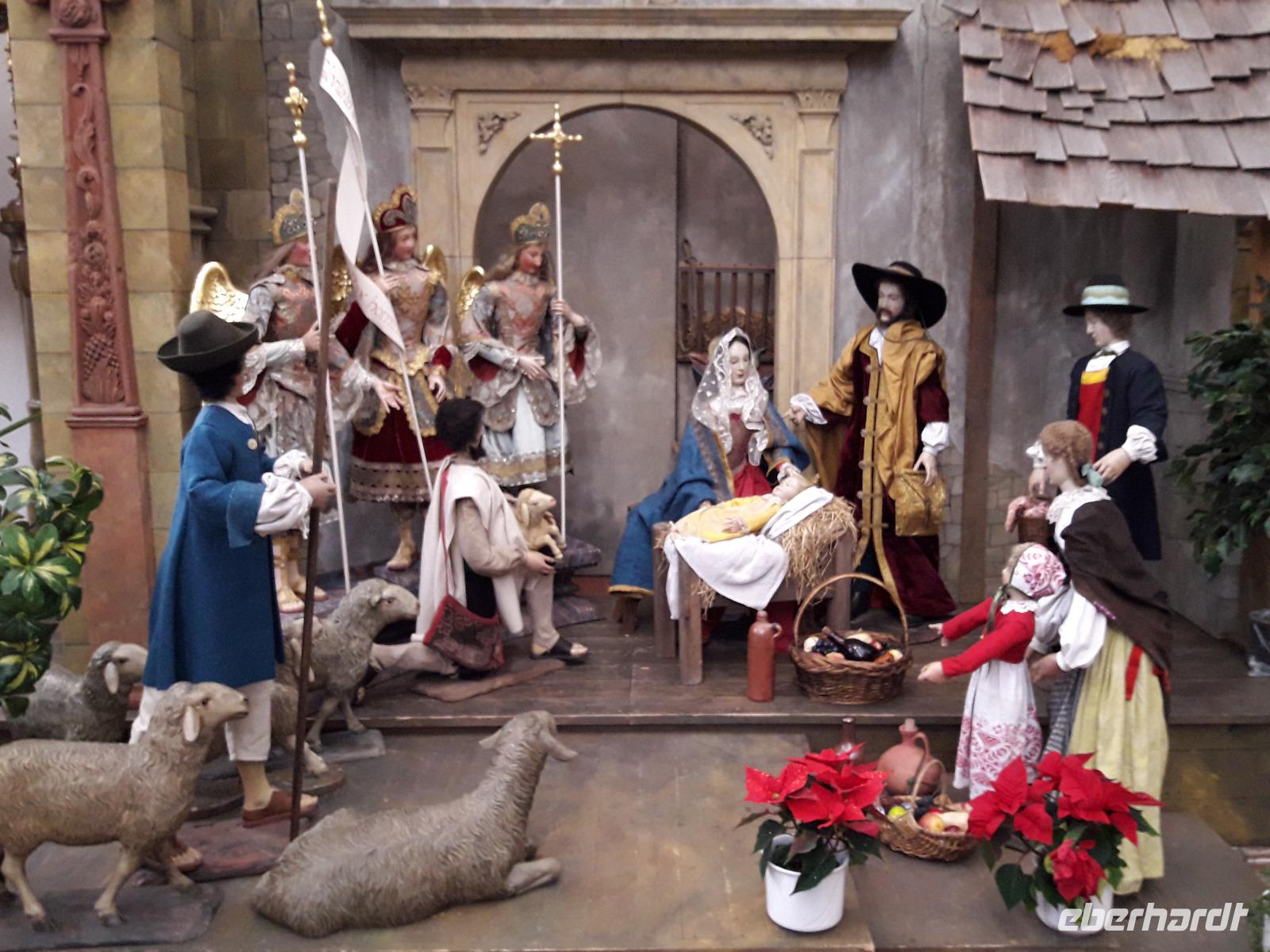 Unser Ziel ist das niederbayerische Straubing. Entlang der Donau fahren wir durch den Gäuboden, die fruchtbare Lössebene, wo schon die Römer siedelten. Mitten im Zentrum Straubings, an den Marktstraßen Theresien- und Ludwigsplatz mit Blick auf die vergoldete Dreifaltigkeitssäule und den Stadtturm, erwarten uns die beiden Stadtführerinnen zu unserer Entdeckungstour „Geheimnis der Weihnacht". Vorbei am abgebrannten alten Rathaus, von dem nur der dekorative Treppengiebel übrig geblieben ist, und schönen Häuserfassaden besuchen wir nacheinander die Stadtpfarrkirche St. Jakob, die Karmelitenkirche Hl. Geist und die Jesuitenkirche mit vielen faszinierenden wundervollen Krippen.Im Gasthof Landshuter Hof stärken wir uns bei einer reichhaltigen bayerischen Brotzeit.Statt der programmgemäßen direkten Fahrt ins Hotel stimmen wir uns -mit Weihnachtsliedern und Weihnachtsgeschichten nach Regensburg zurückgekehrt- am Nachmittag beim Krippenspiel der Kinder in der Neupfarrkirche auf den „Heiligen Abend" ein. Unser Hotel erwartet uns dann mit einem lodernden Feuer vor dem Eingang und einem liebevoll und festlich dekorierten Speiseraum. So steht einem außerordentlichen Abend bei gedämpftem Licht und bayerischer Ente mit Knödel und Blaukraut als Hauptspeise des sehr guten Weihnachtsmenüs nichts mehr im Wege.