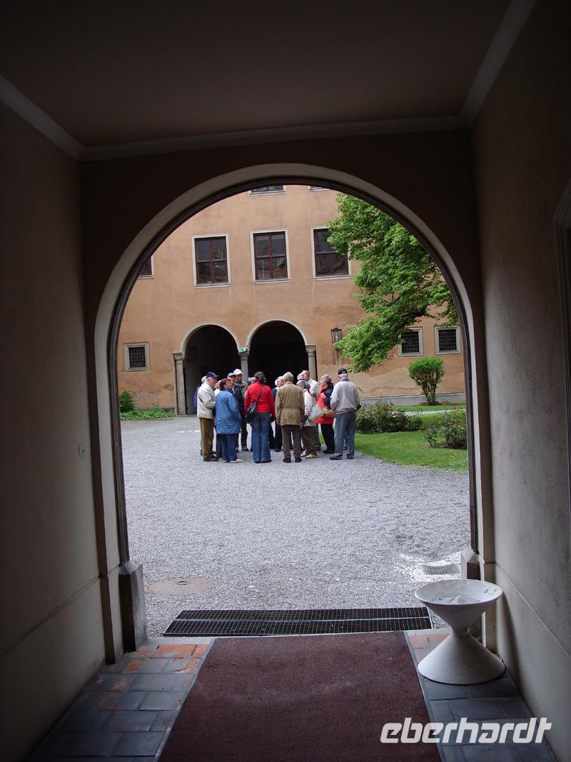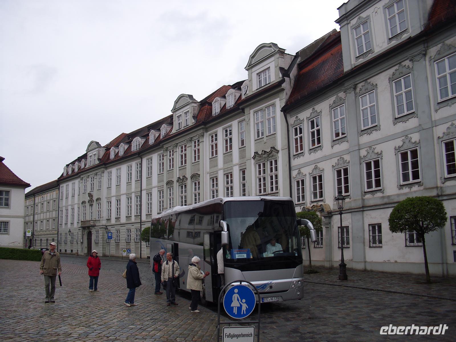 Gegen Mittag erreichen wir Eichstädt. Der Busparkplatz ist weit außerhalb. Wir fahren trotzdem mitten in die Stadt gemäß meinem Motto: Eberhardtgäste werden immer bis vor die Tür gebracht, und lassen die Gäste direkt auf dem Domplatz ausstiegen. Der Fahrer wird zu einem vereinbarten Zeitpunkt wieder dort erscheinen. Es geht in den Dom. Dort wird grade eine Messe beendet. Der Weihrauchduft ist betörend, die barocke Ausgestaltung der Kirche überwältigend. Ich erläutere auf dem Domplatz noch die Gebäude der Domherren, dann geht es hinauf zur Burg. Dort befinden sich mehrere Museen, Heimatgeschichte, Ur-und Frühgeschichte und das berühmte Geologiemuseum mit dem sechsten Fund eines Archäopteryx. Auch der rekonstruierte Renaissancegarten findet viel Anklang.