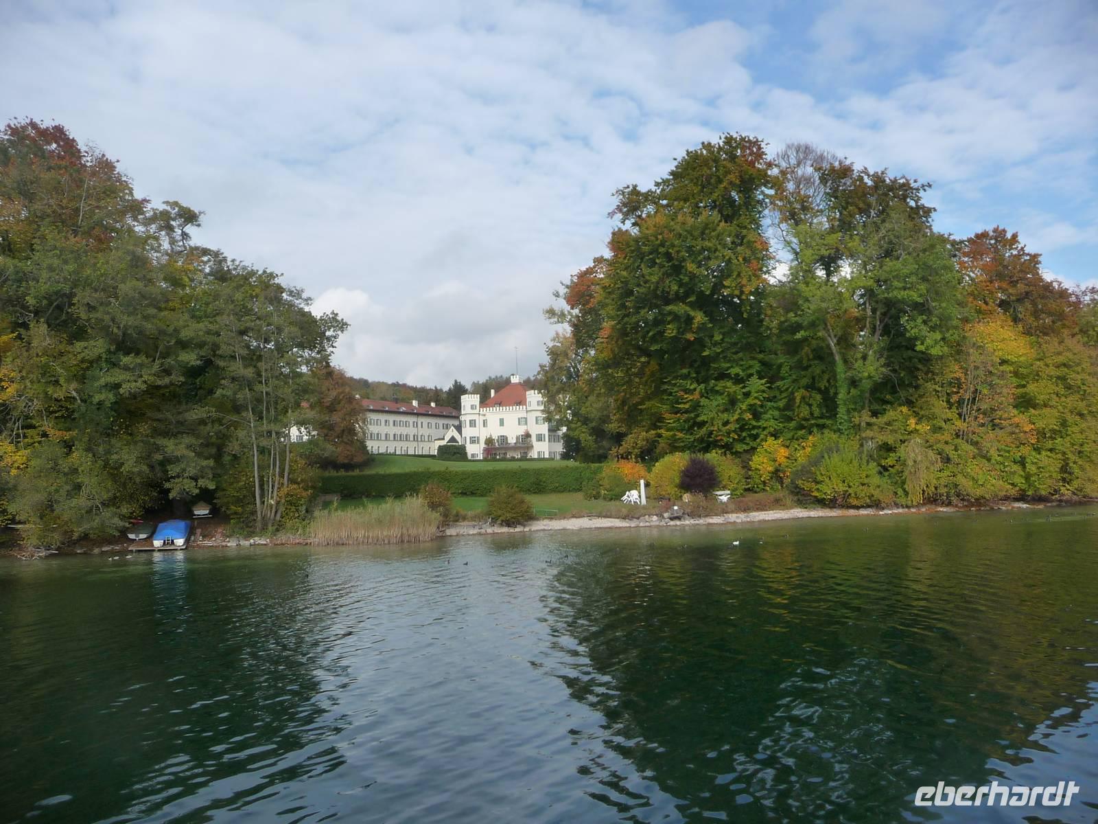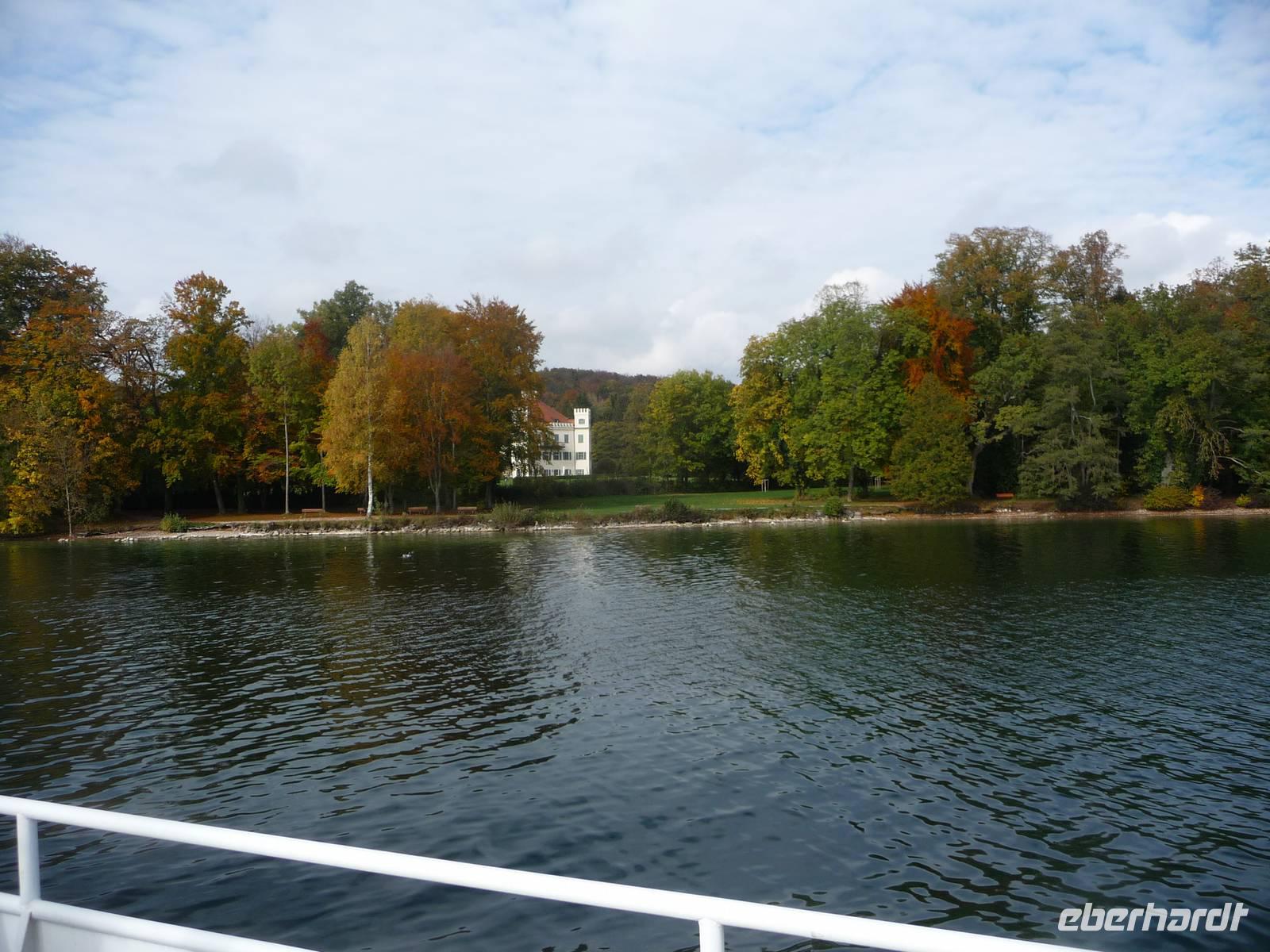 Von der Schiffsanlegestelle Starnberg aus fahren wir mit einem Motorschiff bei Sonnenschein los und sind begeistert von der Seenrundfahrt auf dem Starnberger See. Wir sehen die Roseninsel, auf der sich Sissi in jungen Jahren oft mit ihrem Cousin Ludwig II., dem späteren König, zu Spaziergängen getroffen hat. Sissi verlebte ihre glücklichste Zeit auf Schloss Possenhofen, das wir vom Schiff aus für einen kurzen Moment sehen konnten. Weil in Privathand, kann man das Schloss heute nicht mehr besichtigen. Wir nehmen am Seehotel Leoni neue Gäste auf und unser Schiff fährt nahe an dem Kreuz im See vorbei, das die Stelle markiert, an der der Märchenkönig Ludwig II. tot aufgefunden wurde.