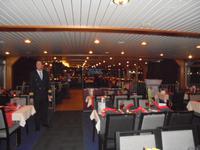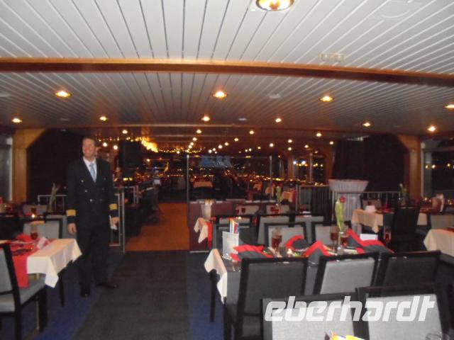 An Bord der Maximilian II begrüßt uns der Kapitän und wir nehmen Platz an bequemen 6 er Tischen im Oberdeck.