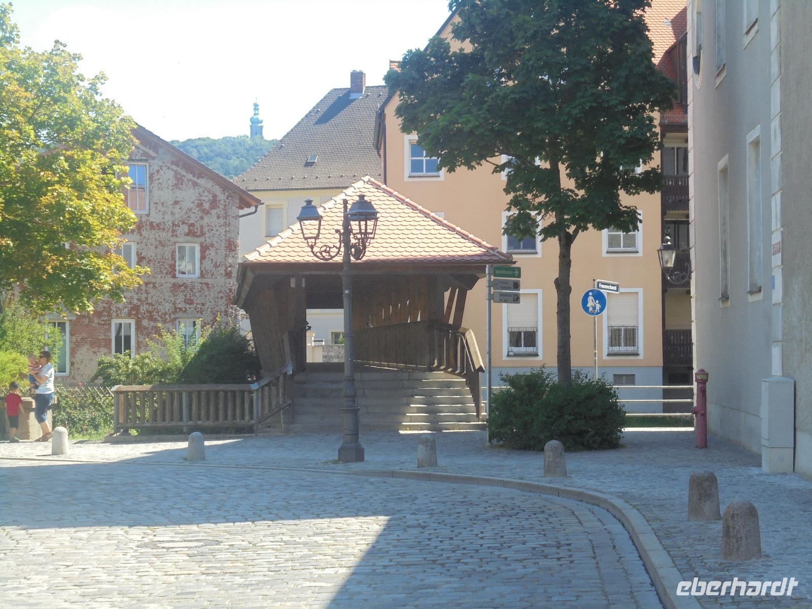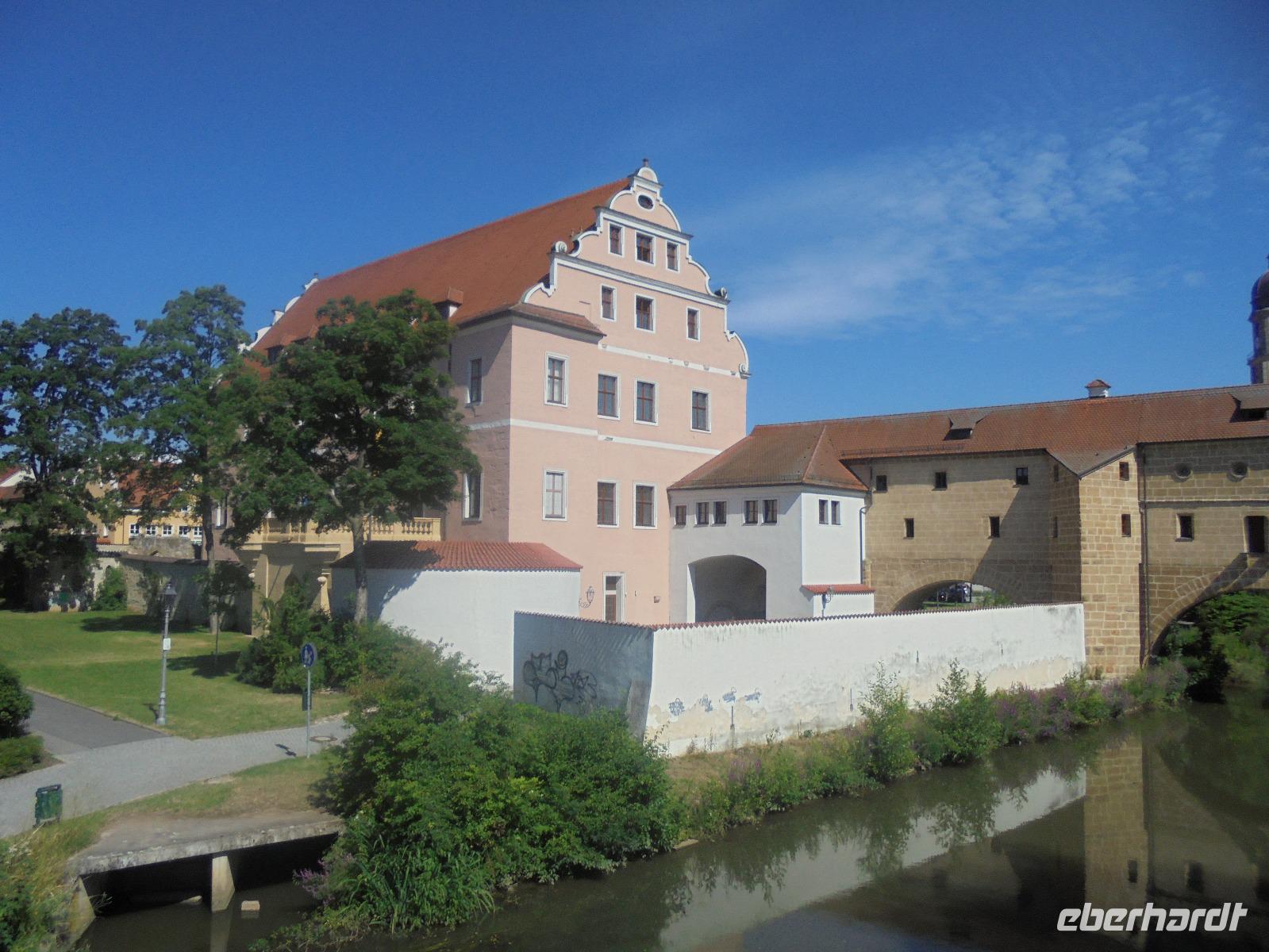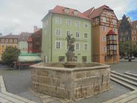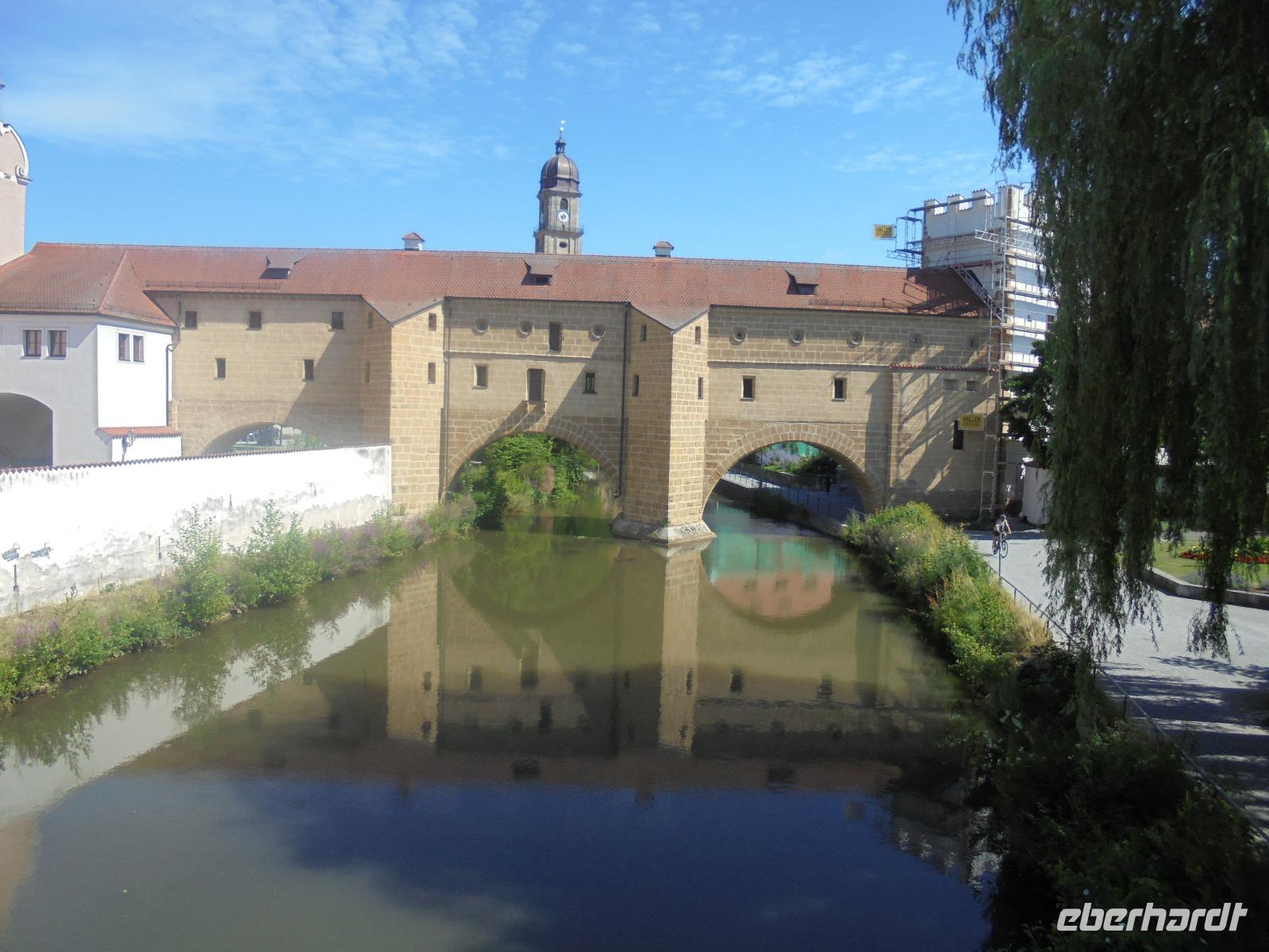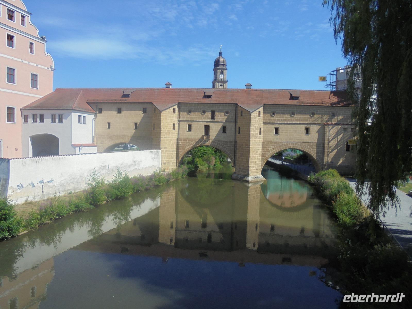 Nach unserem Start ab Dresden erreichten wir über die Autobahnen 4 und 72 den fränkischen Raum und nahmen gleich dort, am ersten Rastplatz an der Autobahn 93 unsere letzten Mitreisenden in dieser kleinen Gruppe auf. So sehr weit war es nun gar nicht mehr bis nach Amberg, der Stadt in der Oberpfalz, die als stark befestigter Ort im Mittelalter, an der historischen „Bayerischen Eisenstraße" gelegen, große Bedeutung für den Eisenhandel aber auch den Salzhandel in der Region hatte. Vom Busparkplatz aus erreichten wir schon nach wenigen Schritten das bekannteste Wahrzeichen Ambergs, das zugleich mit der einst sehr bedeutsamen, zumeist doppelt angelegten Stadtbefestigung verbunden ist: die sogenannte Stadtbrille. Neben den vier Landtoren der gut erhaltenen, außergewöhnlich langen Ringmauer um den großen Altstadtkern gibt es noch eine Art Flusstor über die Vils als Verbindung des Kurfürstlichen Schlosses mit dem alten Zeughaus. Das hatte einst zur Aufbewahrung der Waffen für den Verteidigungsfall gedient und von ihm aus führt die Stadtmauer in Bögen über den Fluss. Weil einer der Pfeiler direkt im Wasser steht, spiegelt er sich zusammen mit den zwei nebenliegenden Bögen im meist ruhigen Wasser der Vils, ergänzt die Spiegelung mit zwei nebeneinander stehenden Kreisen zum Gesamteindruck einer Brille und hat dadurch den Beinamen erzeugt. Das auf der anderen Seite angrenzende kurfürstliche Schloss stammt schon aus dem 15. Jh., war zunächst Residenz von Kurfürst Ludwig III. von der Pfalz und wurde später zum Erscheinungsbild in Renaissance und Barock umgebautWir konnten einen gemütlichen Spaziergang durch hübsche, entspannt und ruhig wirkende Stadt machen und uns dabei Sehenswertes wie Georgskirche und Georgsviertel ansehen, eine der früher typischen „gedeckten" Brücken überqueren und kurz am „Eh-Häusl" verweilen, das als kleinstes Hotel der Welt gilt. Kurioserweise hat der winzige Bau, nur knapp drei Meter breit und auf nur 20 m² Grundfläche errichte, keine Seitenwände: Seine Geschosse und die Fassade sind einfach zwischen die Aussenwände seiner beiden Nachbarhäuser gehängt. Legenden ranken sich um das Häuschen, das wohl ursprünglich für Gesinde gebaut wurde. Da man aber das alte Wiort dafür - „Ehalten" nicht mehr kannte, wurde eine Legende gestrickt, denn um möglichst wenige Nachkommen unterer Schichten zu haben, wurde denen, die wenig besaßen, Eheschließung vom 14. Bis 19. Jh. durch die Bestimmung erschwert, man dürfe nur heiraten, wenn man „schuldenfreien Haus und Grundbesitz nachweise. So hätte ein Kaufmann dieses Häuschen erbaut und es jungen und unvermögenden Heiratswilligen überlassen, die dadurch diese Bedingung erfüllen konnten. Nach den Flitterwochen haben die dann das „Eh-Häusl" gegen geringes Entgelt ans nächste Brautpaar weiterverkauft... Am Markt endete dann unsere kleine Runde in Amberg und wir hatten noch etwas Freizeit.