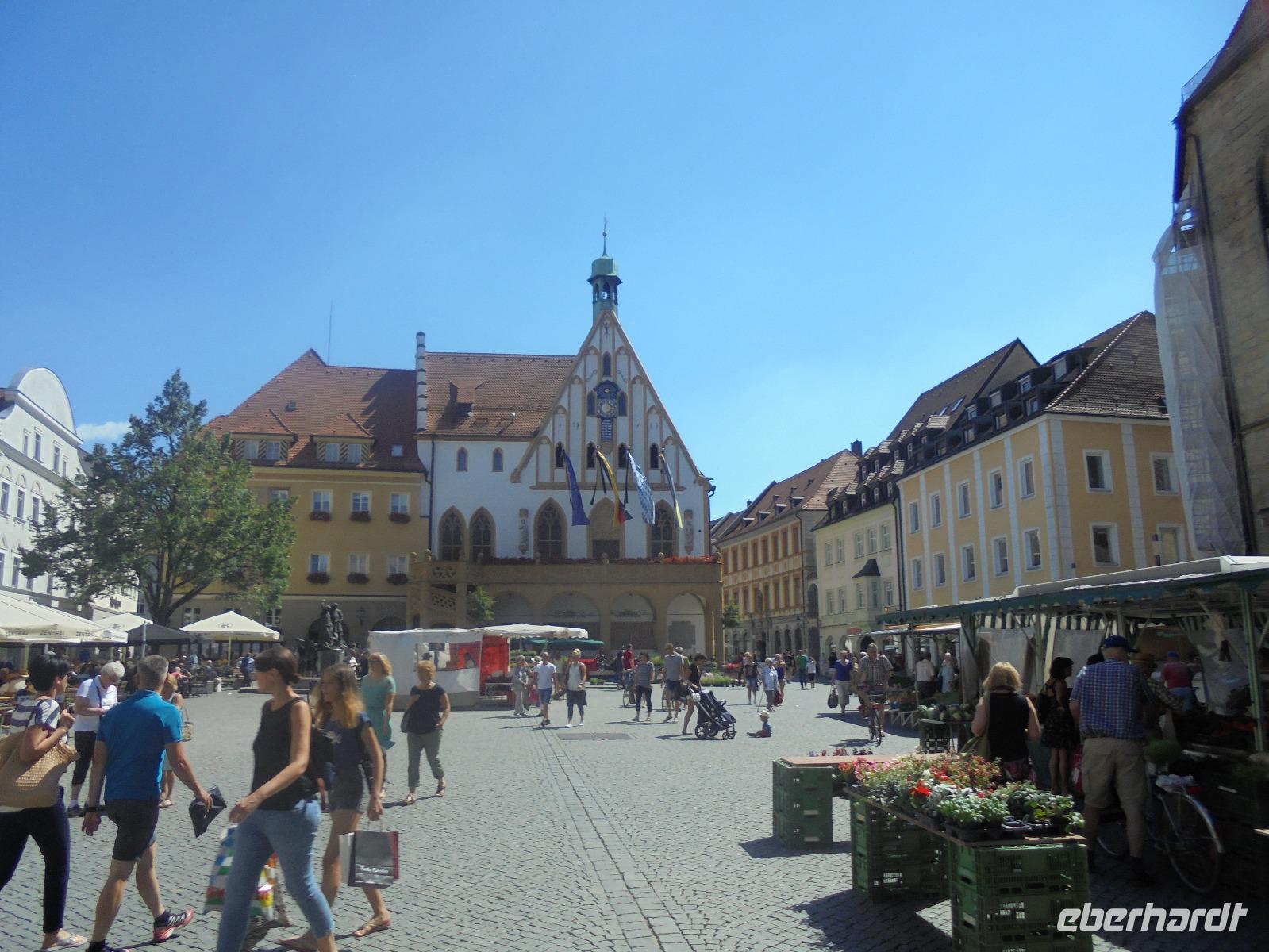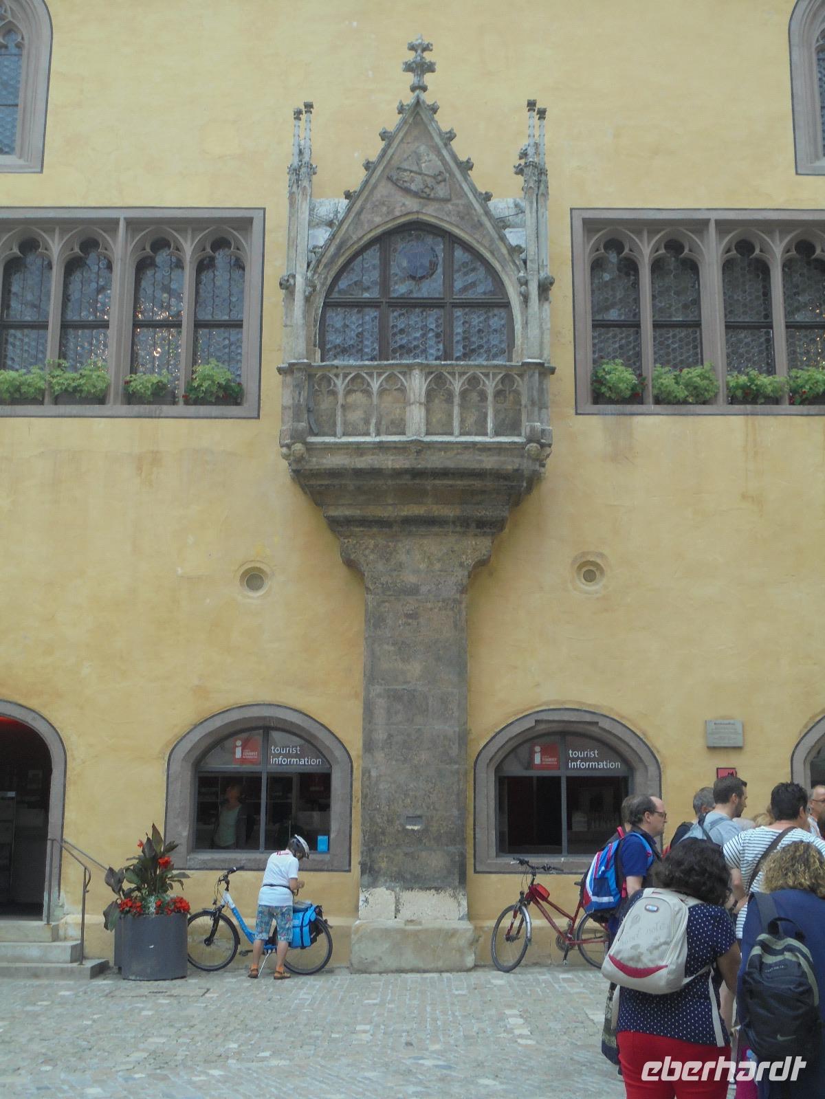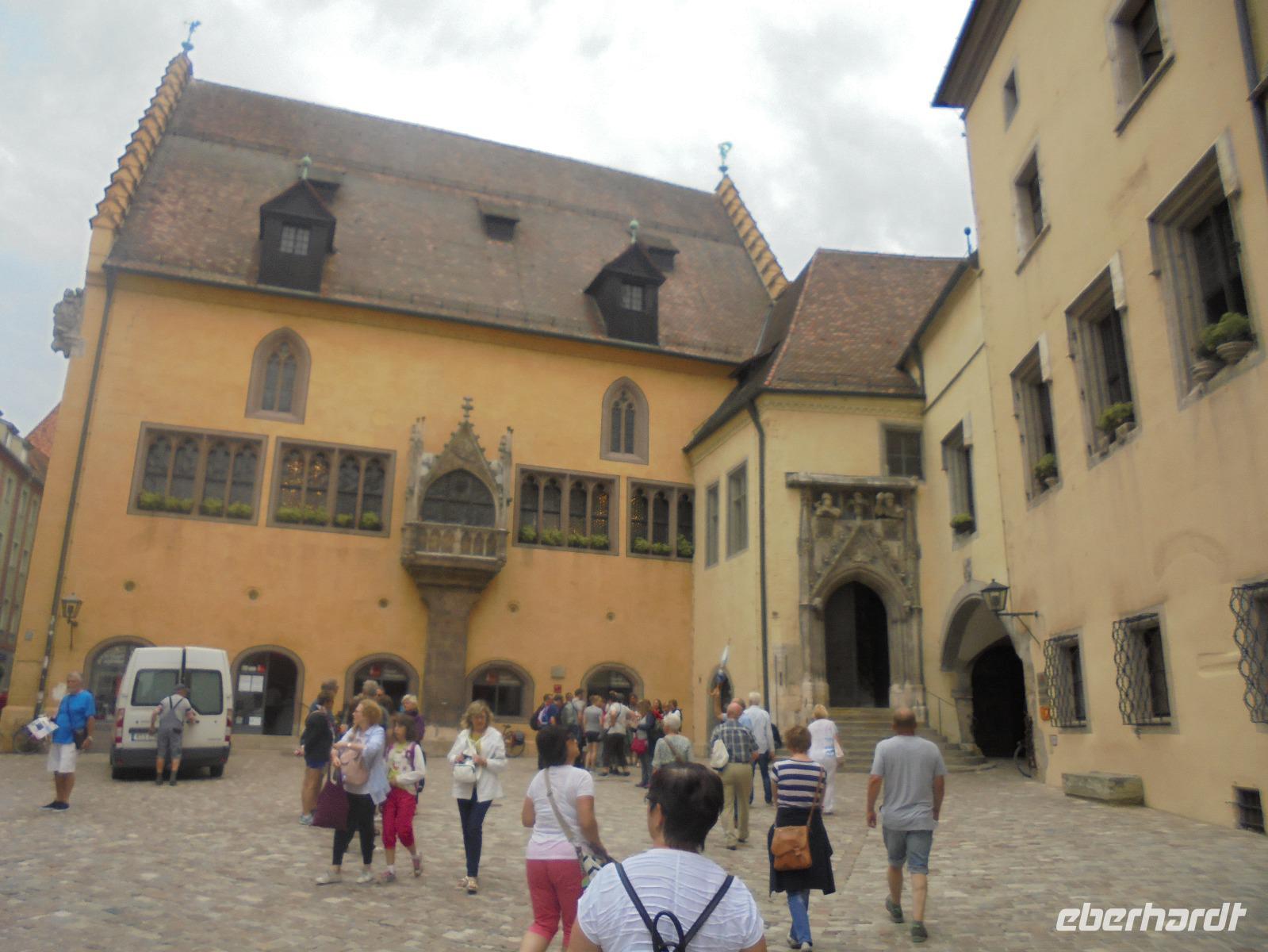 Ein weiteres - für die deutsche Geschichte besonders bedeutendes - Bauwerk sahen wir auch noch: das alte Rathaus zu Regensburg. Die ältesten Teile stammen aus dem 13. Jh., immer wieder neue Anbauten erweiterten das Regierungszentrum der Reichsstadt und mit dem im 14. Jh. eigentlich als Tanzsaal der Ratsherren errichten Reichssaalbau fanden seit 1594 alle bis dahin an unterschiedlichen Orten durchgeführten deutschen Reichstage statt, bis von 1663 bis 1806 der sogenannte „immerwährende Reichstag", die Ständevertretung im „Heiligen Römischen Reich Deutscher Nation" hier tagte.
