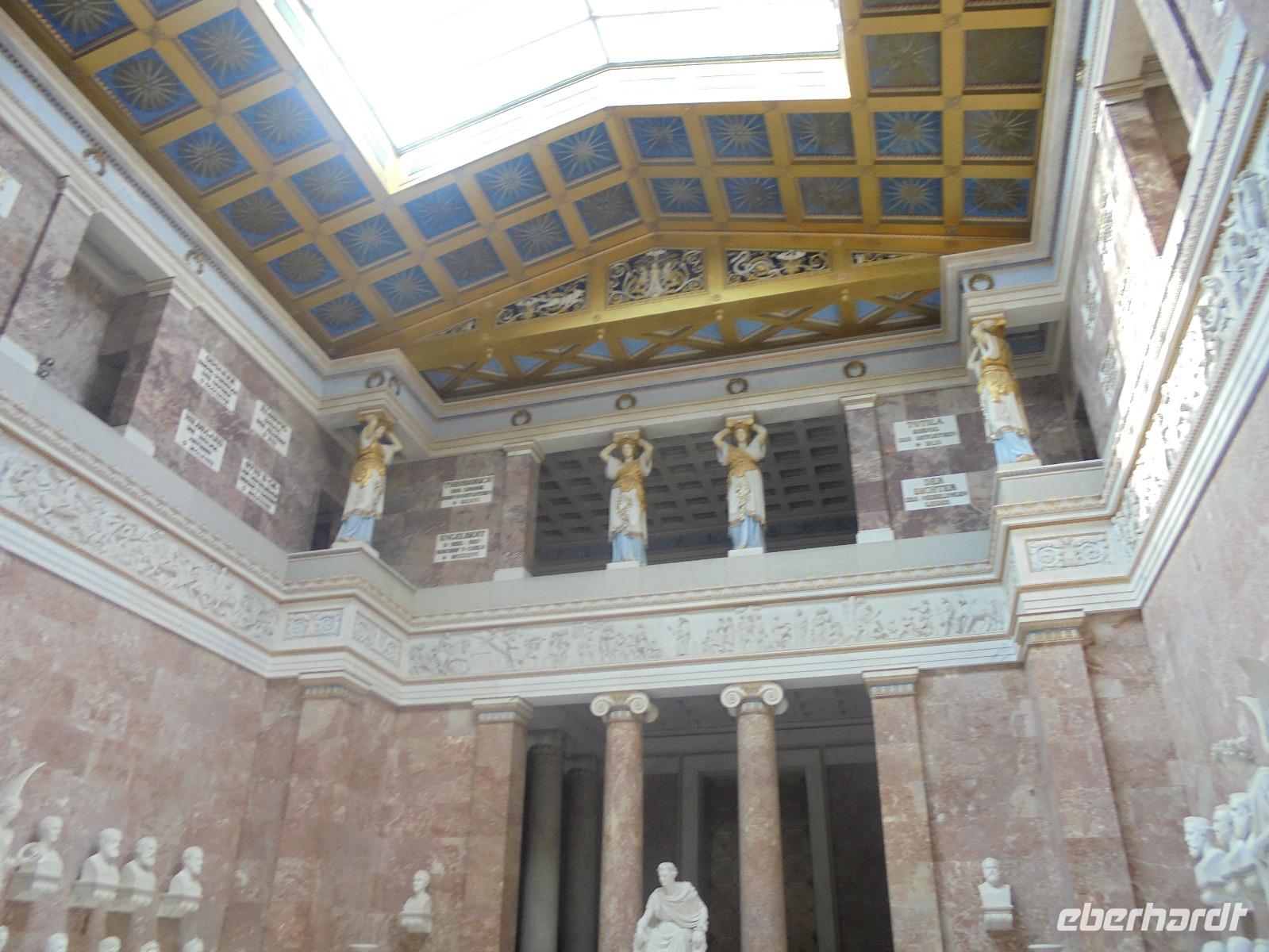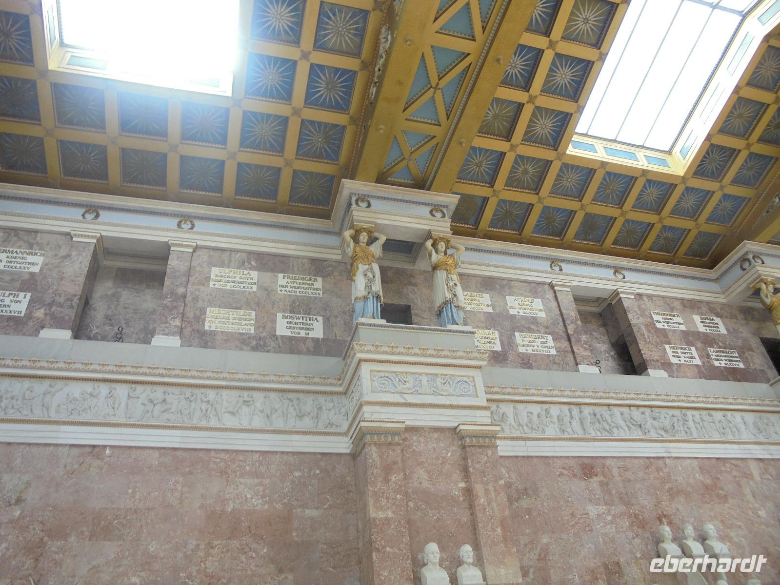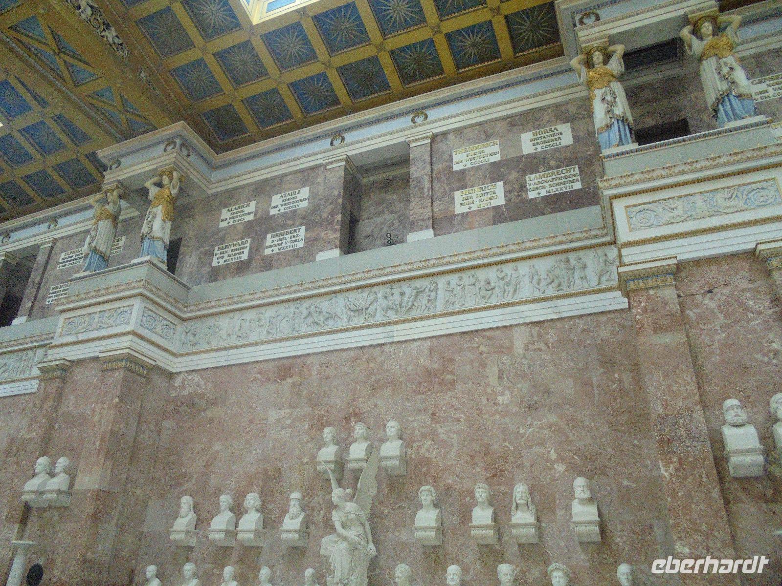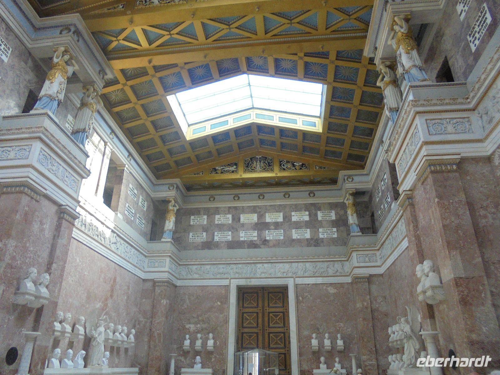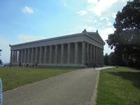Nach interessantem Aufenthalt fuhren wir dann schon in Richtung unseres Hotels in Donaustauf, das idyllisch nahe an der Donau und zu Füßen des Berges liegt, der die „Walhalla" trägt. Diese Gedenkstätte für bedeutende Deutsche - Kämpfer, Wissenschaftler oder Künstler seit „germanischen Zeiten" und der Völkerwanderung, wurde zwischen 1830 und 1842 auf Betreiben des Bayernkönigs Ludwigs I. im Stile eines griechischen Tempels errichtet. Hintergrund waren die napoleonischen Kriege, Inspiration lieferte die Verklärung germanischer Mythologie und wahren Heldentums in der Romantik. So enthält dieser „Ruhmestempel", den der Architekt Leo von Klenze mit gewaltigen Maßen von 125 m Länge und 55 m Höhe errichtete und der terrassenförmig ansteigend, einen großen Teil des abschüssigen Donautales beherrscht, nicht nur Namen und Büsten moderner Zeit, sondern es finden sich auch eher legendäre Namen wie aus den Heldensagen der Edda oder von Königen aus der Völkerwanderung wie Alarich, Geiserich, Totila oder Theoderich.