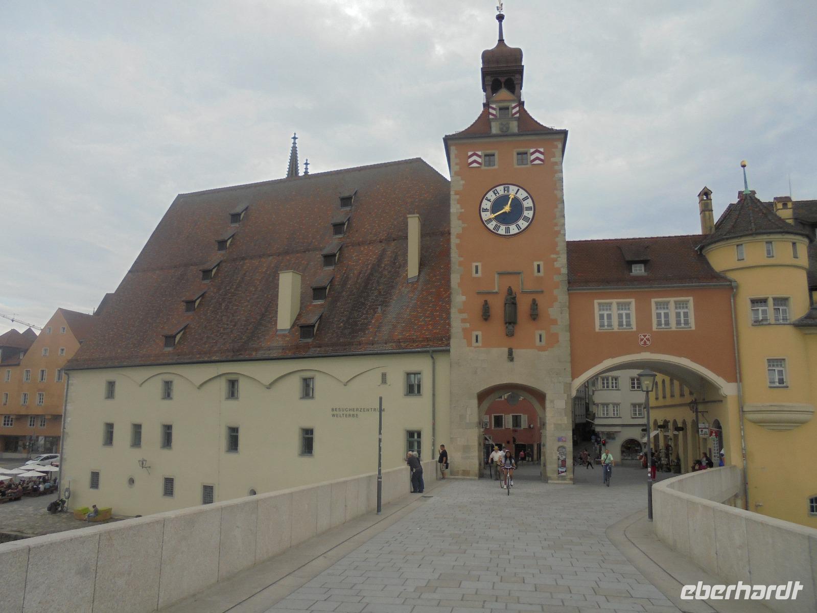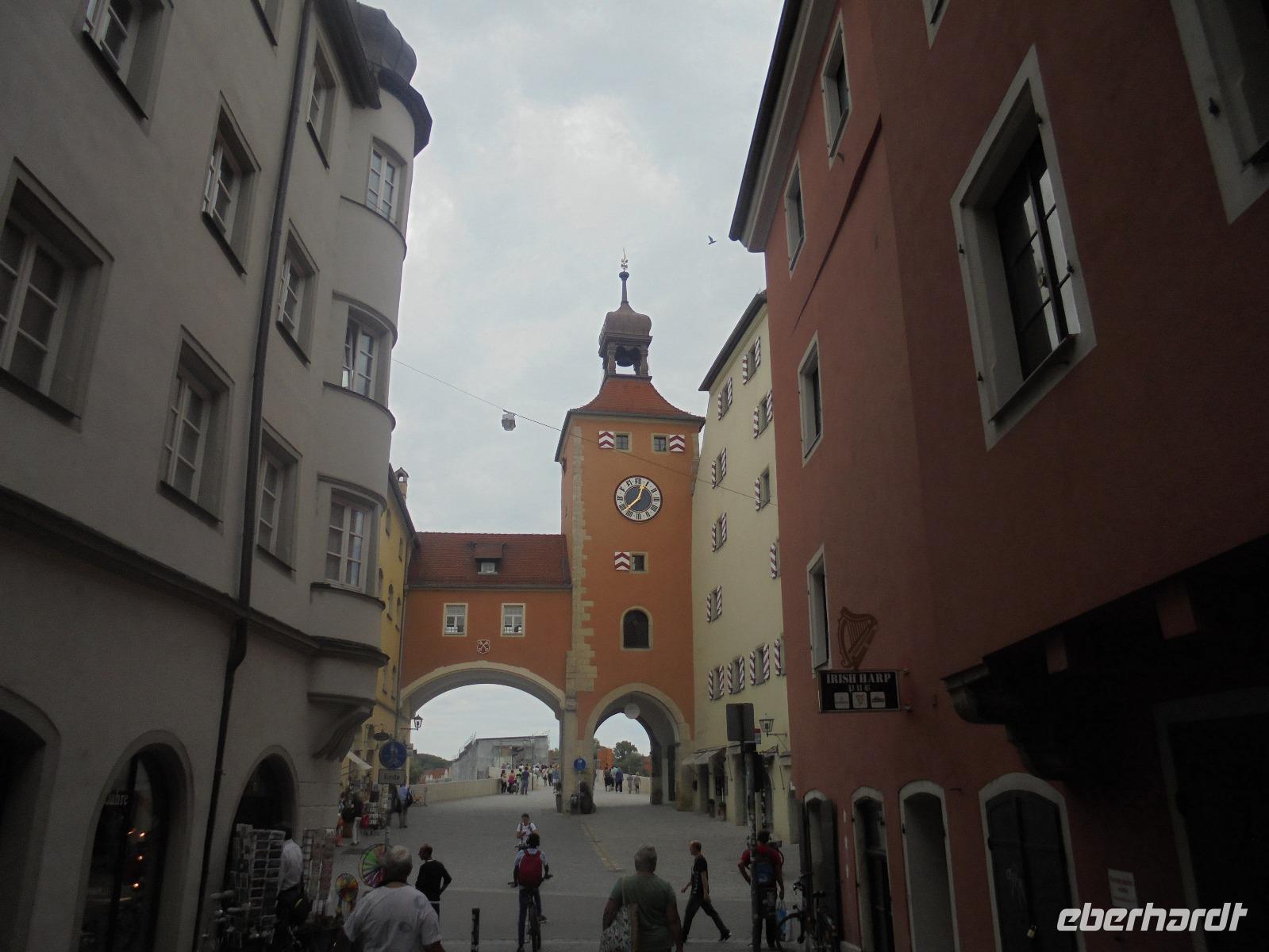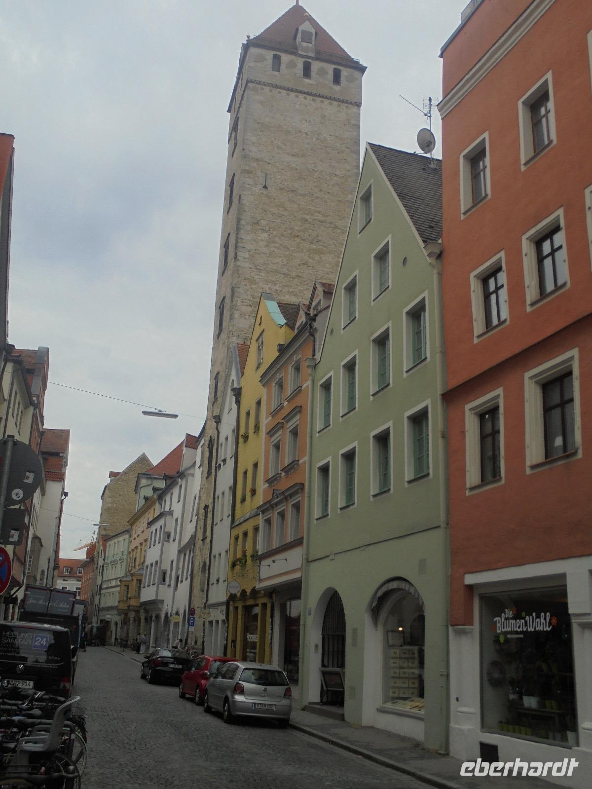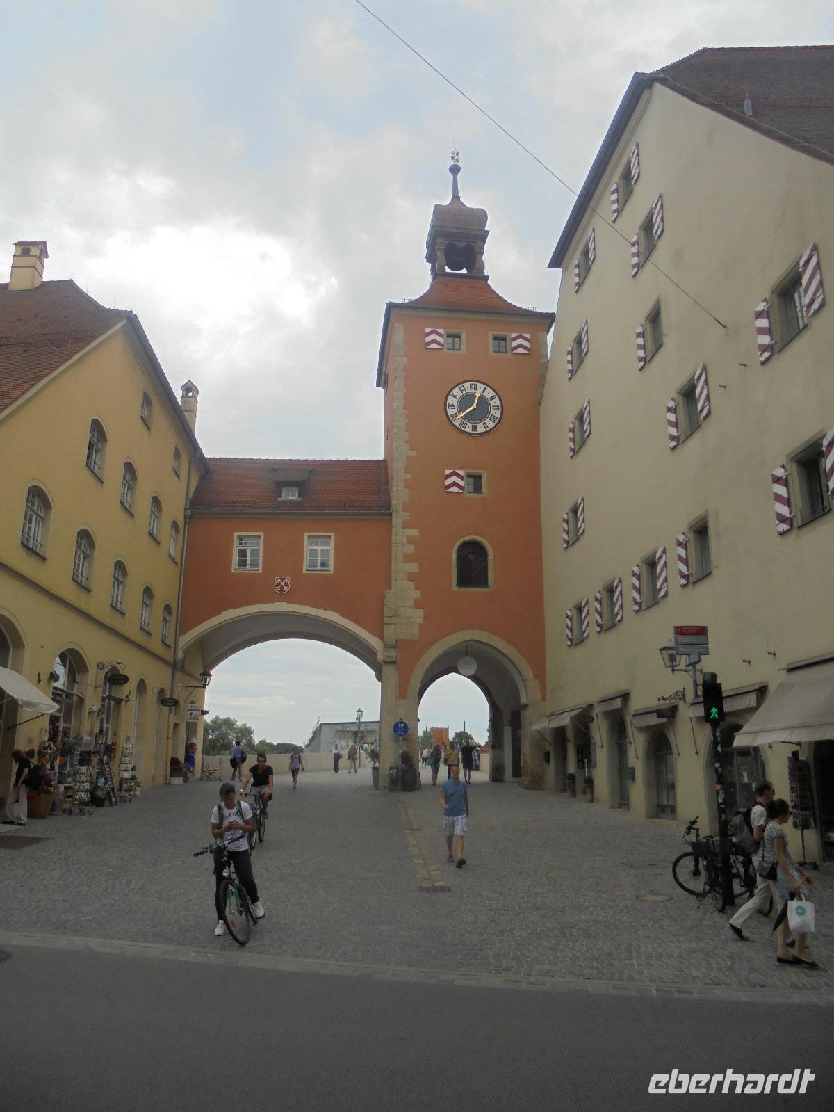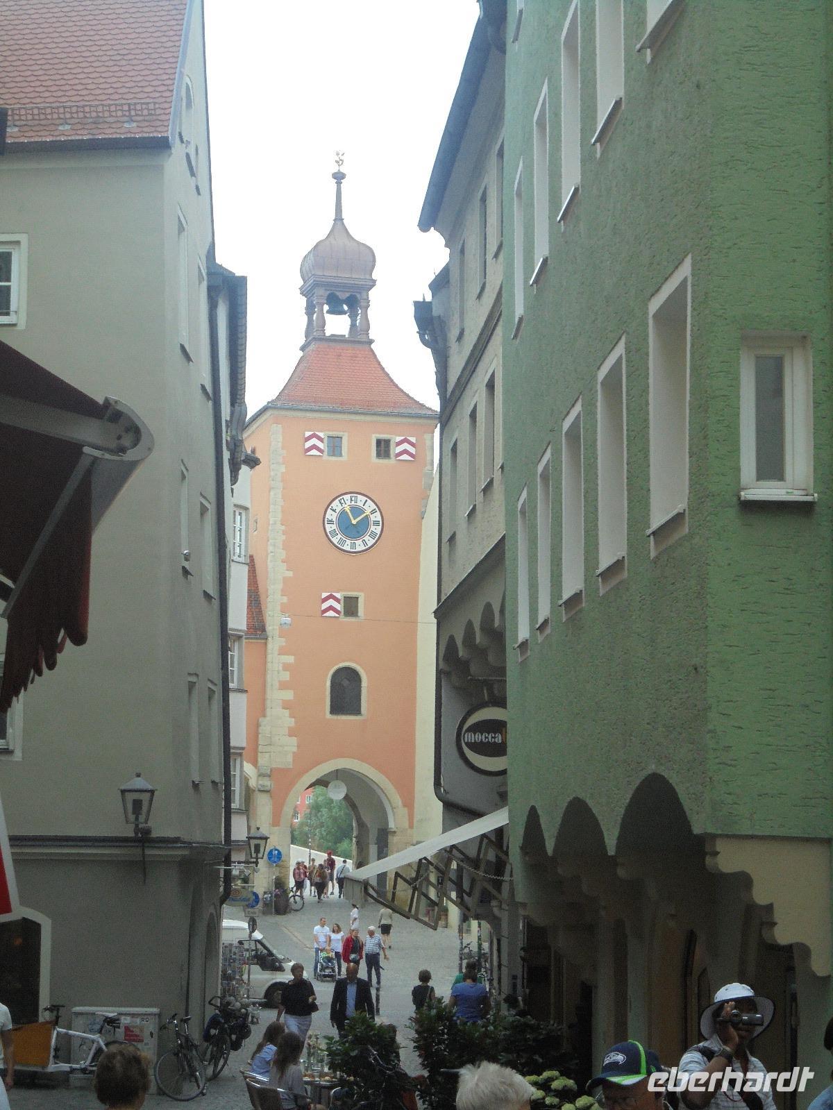 Durch den Turm des Brückentores gelangten wir dann in die Regensburger Altstadt, die auf ein im 1. Nachchristlichen Jahrhundert erbautes festes Römerkastell zurückgeht, von dem noch einige Reste, z.B. die Porta Praetoria erhalten sind - neben der Porta Nigra in Trier die einzige teilweise erhaltene römische Toranlage nördlich der Alpen. Auch der Name der Stadt geht wohl auf die Römer zurück.