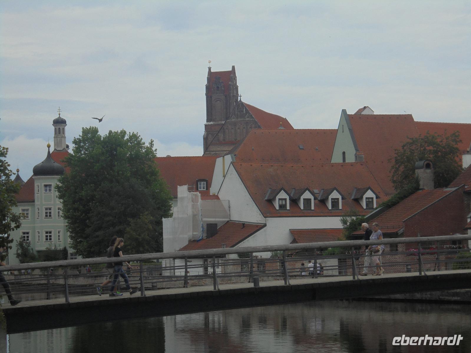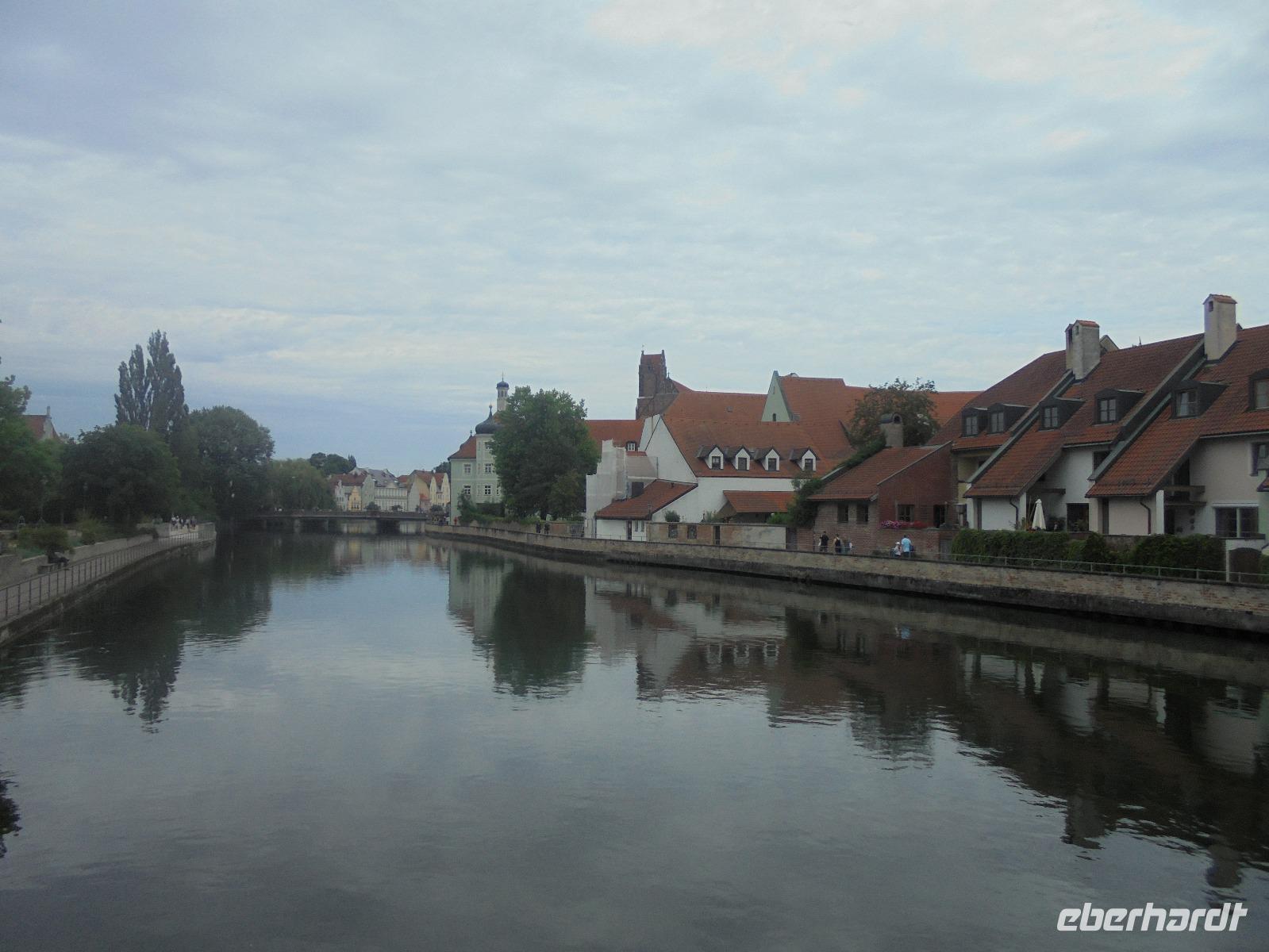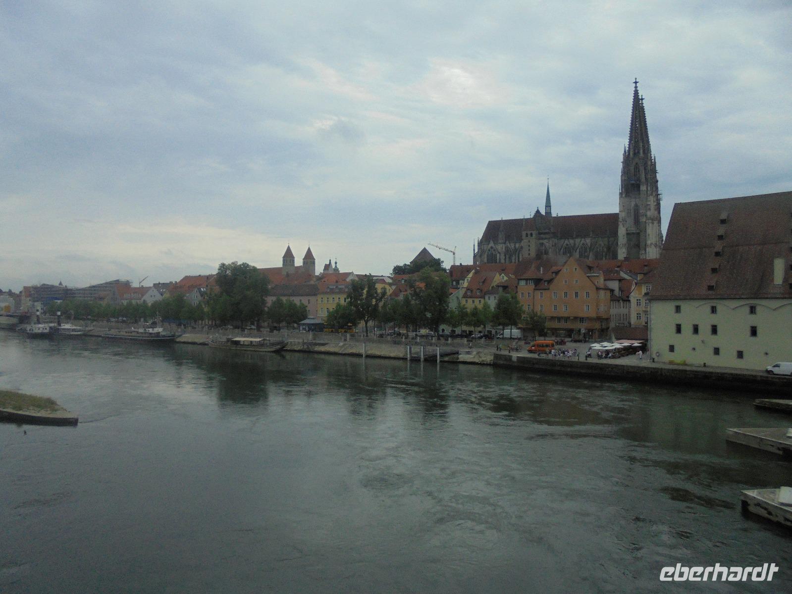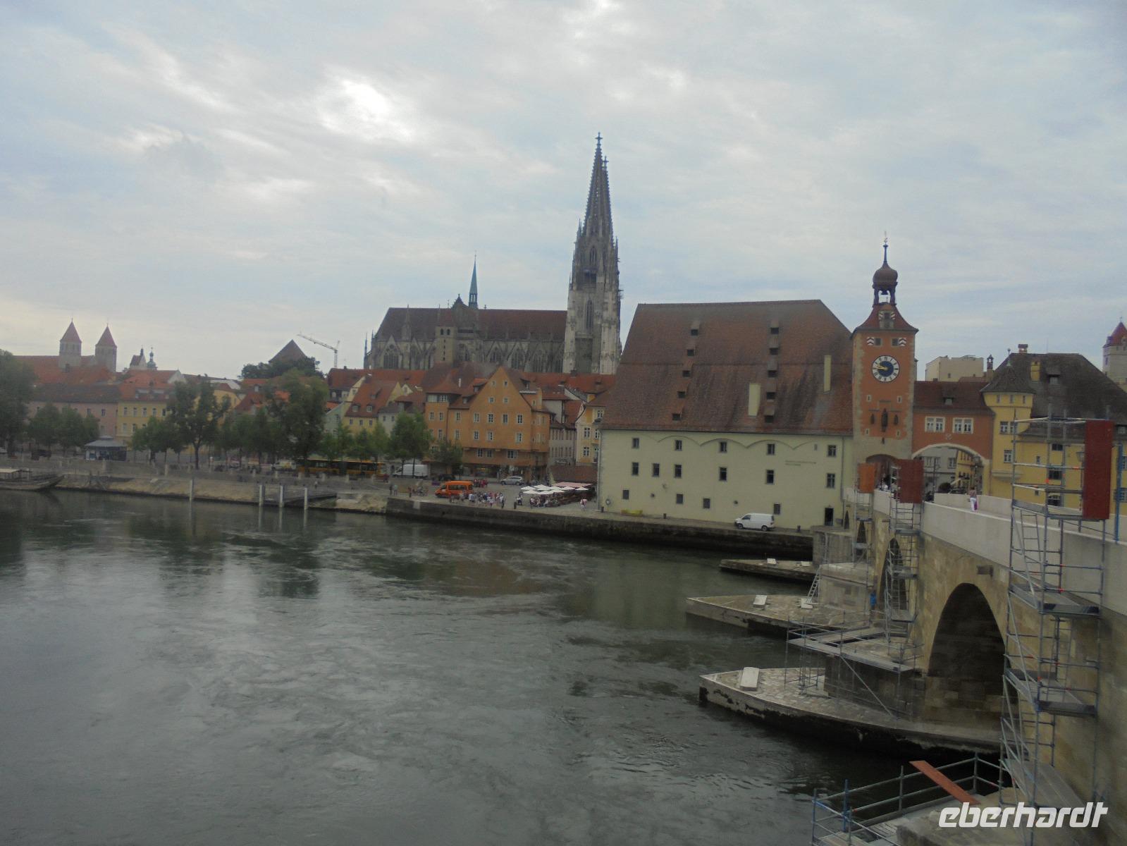 Nicht weit war es von unserem Hotel ins nahegelegene Regensburg. Mit seinen fast 1000 historischen Gebäuden direkt im Altstadtensemble wurde es 2006 als größte erhaltene mittelalterliche Stadtanlage nördlich der Alpen auf die Liste des UNESCO-Weltkulturerbes gesetzt. Zu diesem Ensemble gehört auch der kleine Ortsteil Stadtamhof, bis 1924 selbständige Kleinstadt. Hier setzte uns der Bus ab und wir trafen uns mit unserem Stadtführer, bevor wir über die Steinerne Brücke, eines der Wahrzeichen Regensburgs, direkt in die Altstadt marschierten. Zwar ist das mittelalterliche Monument gerade in Restaurierung, aber während unseres Rundganges konnten wir dennoch einen beeindruckenden Teil dieser ältesten Steinbrücke Deutschlands in Augenschein nehmen. Sie wurde im 12. Jh. erbaut und war damals die einzige befahrbare Donaubrücke zwischen Ulm und Wien - für mehrere hundert Jahre auch die einzige Donaubrücke in Regensburg.