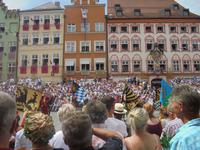 Und so kamen wir denn auch tatsächlich zu einem durchaus mittelalterlichen Anblick, als das nachgespielte historische Ereignis als machtvoller, bunter und malerischer Zug durch die lange Altstadtstraße und die etwas kürzere Neustadt flutete, alles zünftig in den pittoresken Kulissen der bunten alten Bürgerhäuser, erbaut von der Gotik bis zum Klassizismus. Zugegeben, eigentlich etwas unwirklich erschien es vor den Zehntausenden von - im Stile UNSERER Zeit gekleideten Zuschauern, die auf vorbereiteten Tribünen, aber auch jeder anderen nur denkbaren Art von Sitzgelegenheiten oder in den dichten Reihen von Stehplätzen dem bunten Treiben und dem historisch teilweise sehr authentisch nachgestellten Treiben folgten und den aufwendig bunt und phantasievoll historisch Gekleideten zujubelten...