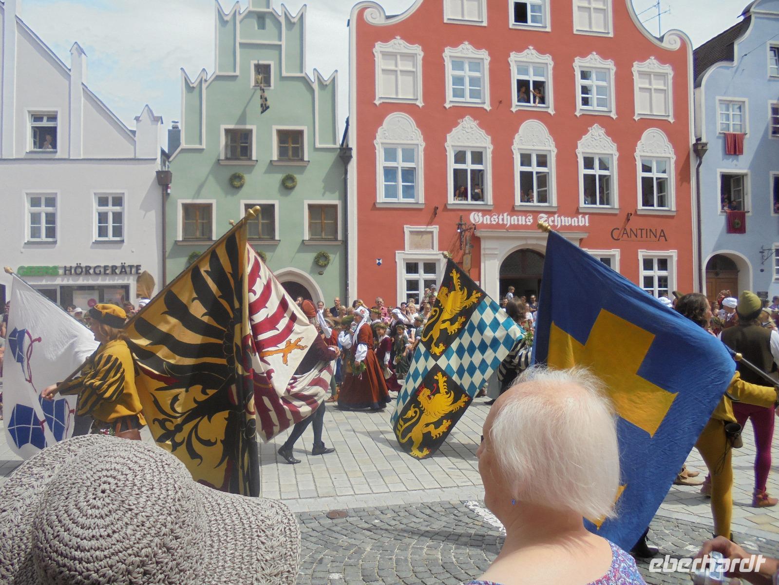 In einem mehreren Wochen währenden Prunkzug war Hedwig die Braut nach Landshut geleitet worden und genau die Ereignisse ihres Empfangs in der Fürstenresidenz, der opulente Hochzeitszug und die vielschichtigen Stände als Teilnehmer am einem Triumphzug gleichenden Einmarsch zogen heute, am Sonntag dem 9. Juli, in Darstellung der einstigen Ereignisse, wieder einmal durch die Stadt Landshut. Ergänzt durch mittelalterliches „Festtags-Feeling", verbunden mit dem Auftreten von Gauklern, aufgeführte Festspiele, Musik mit Spielleuten und Sängern und natürlich auch die Vorführung von Rittern hoch zu Ross ergänzten die Feierlichkeiten rund um den Festzug - als bedeutendes Mittelalter-Schauspiel bestens organisiert durch einen Förderverein, der schon vor langer Zeit gegründet worden war. Heute nehmen viele hundert Landshuter Bürger, die sich und uns als Besucher mittels originalgetreuer historischer Gewänder ins späte Mittelalter versetzten, oft genug mit mittelalterlichem Haarschnitt versehen und voll in ihrer Rolle aufgehend, am Festzug teil.