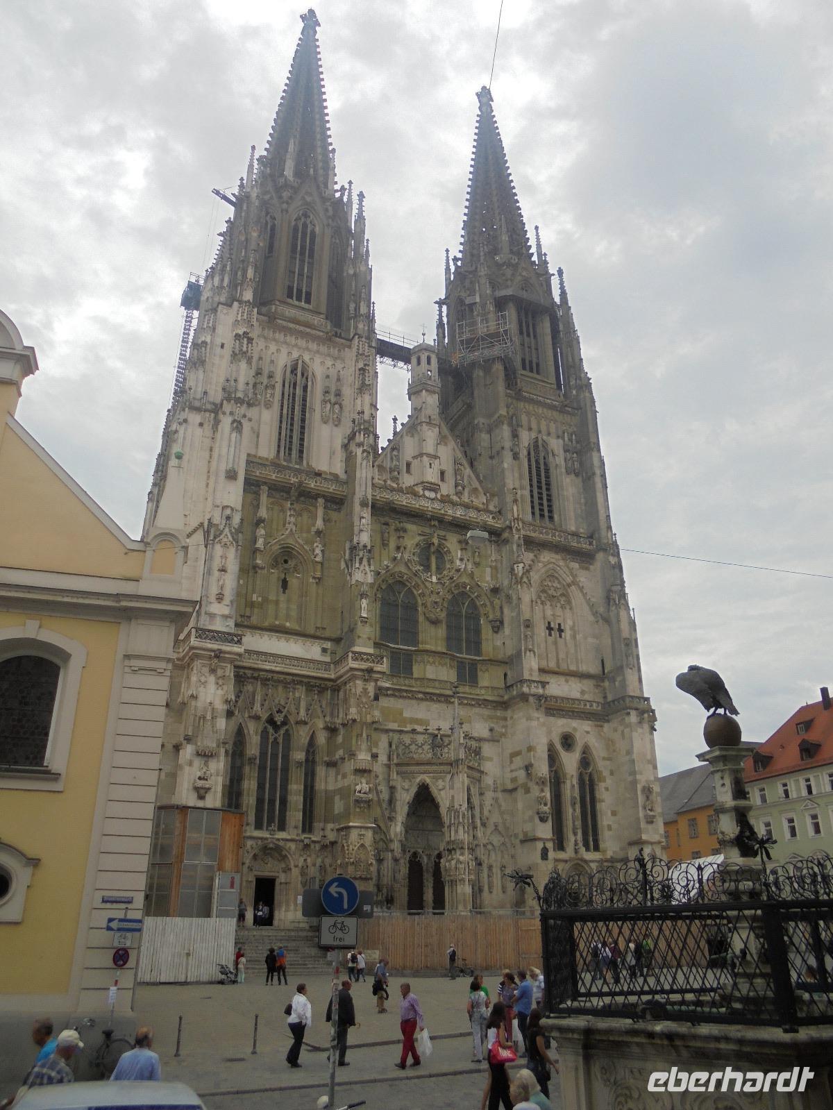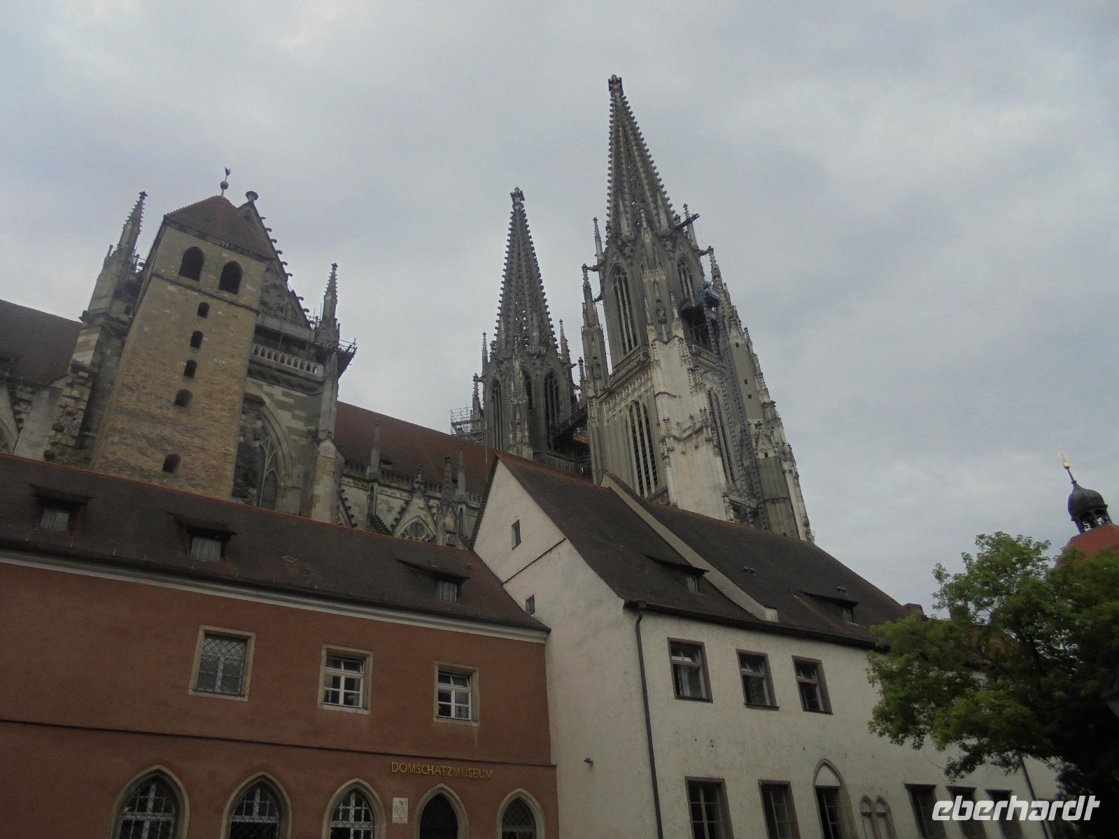 Ein weiteres Regensburger Wahrzeichen ist der Dom St. Peter, der als Hauptwerk der Gotik in Bayern gilt. Von seinem romanischen Vorgängerbaut steht noch ein Turm, der sogenannte Eselsturm, in dem sich während des Baues seines gotischen Nachfolgers wohl die Hebevorrichtungen für die Steine befunden haben. Nach 1260 setzt man den Baubeginn des Domes an, der - nach langer Unterbrechung, als um 1520 das Geld ausging, erst Ende des 19. Jh. wirklich vollendet wurde. Weit überregional bekannt sind auch die Regensburger Domspatzen, der aus Knaben und jungen Männern bestehende Domchor. Den haben wir zwar nicht gehört, während des Rundganges aber zu unserer Überraschung erfahren, dass unser Ortsführer ein früherer „Domspatz" war.
