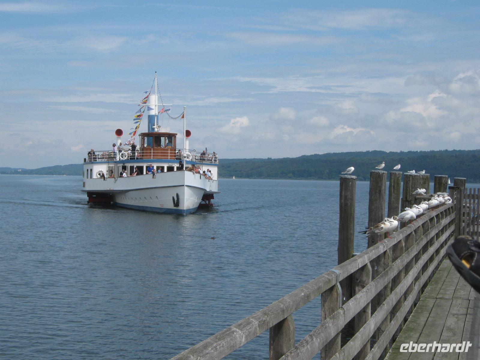 Gestärkt und gut gelaunt liefen wir zurück zum Bus. Wie erwartet hatte die Sonne wieder die Oberhand gewonnen und aus diesem Grund entschlossen wir und zu einer kleinen Überraschung! Die Busfahrt durch das Fünf-Seen-Land verfeinerten wir mit einer kleinen Schifffahrt auf dem Ammersee - von Dießen nach Riederau. Schön war`s und allen hat es gut gefallen. Im Bus ging es dann weiter nach Landsberg am Lech. Diesmal erschien die Stadführerin im historischen Gewand - einfach herrlich. Wie alles hier in diesem wunderschönen Ort war auch dies ein bleibender Eindruck.