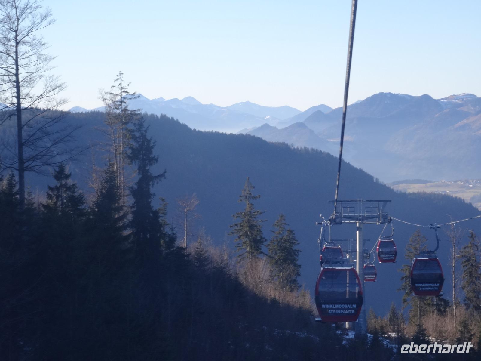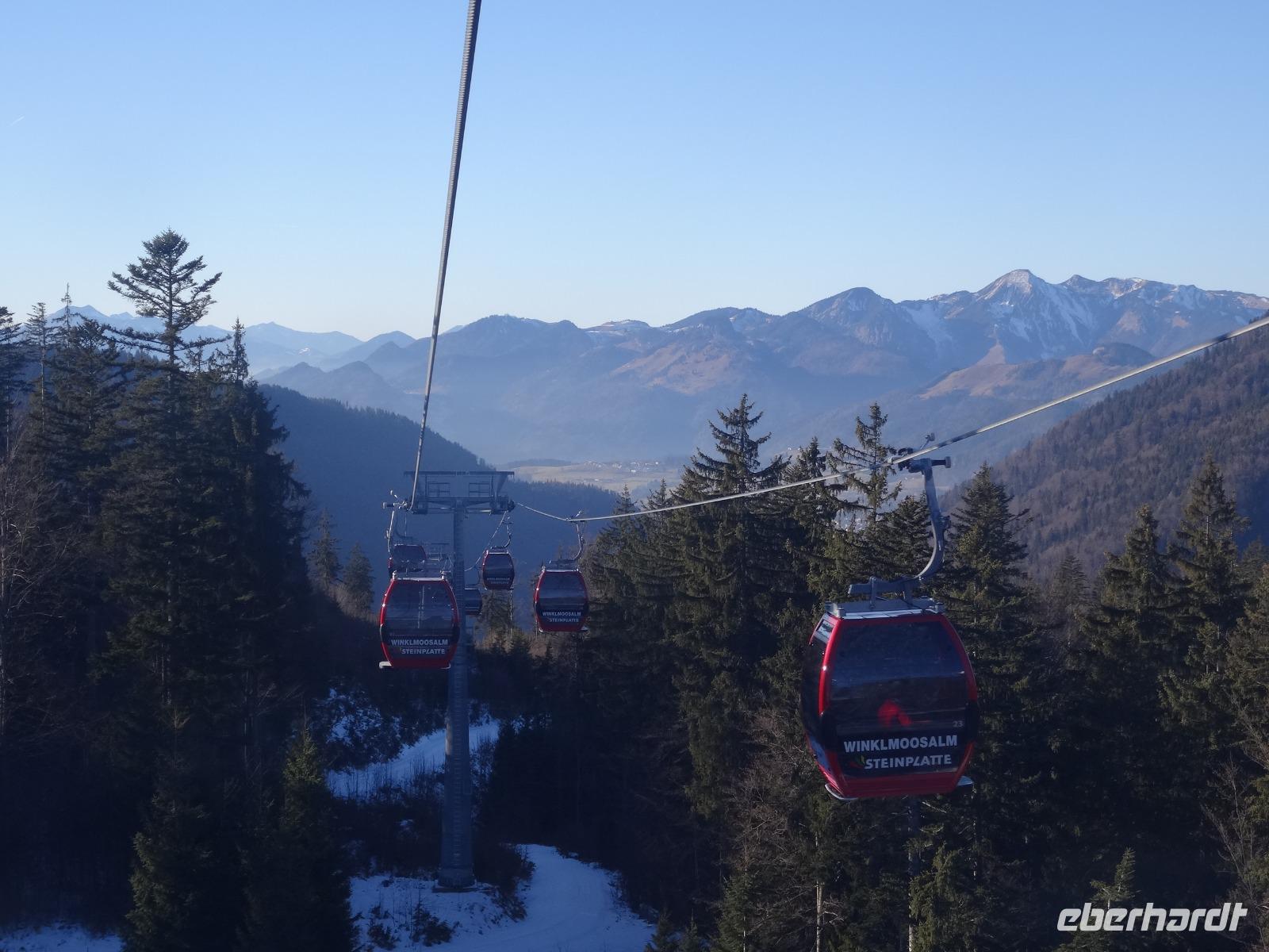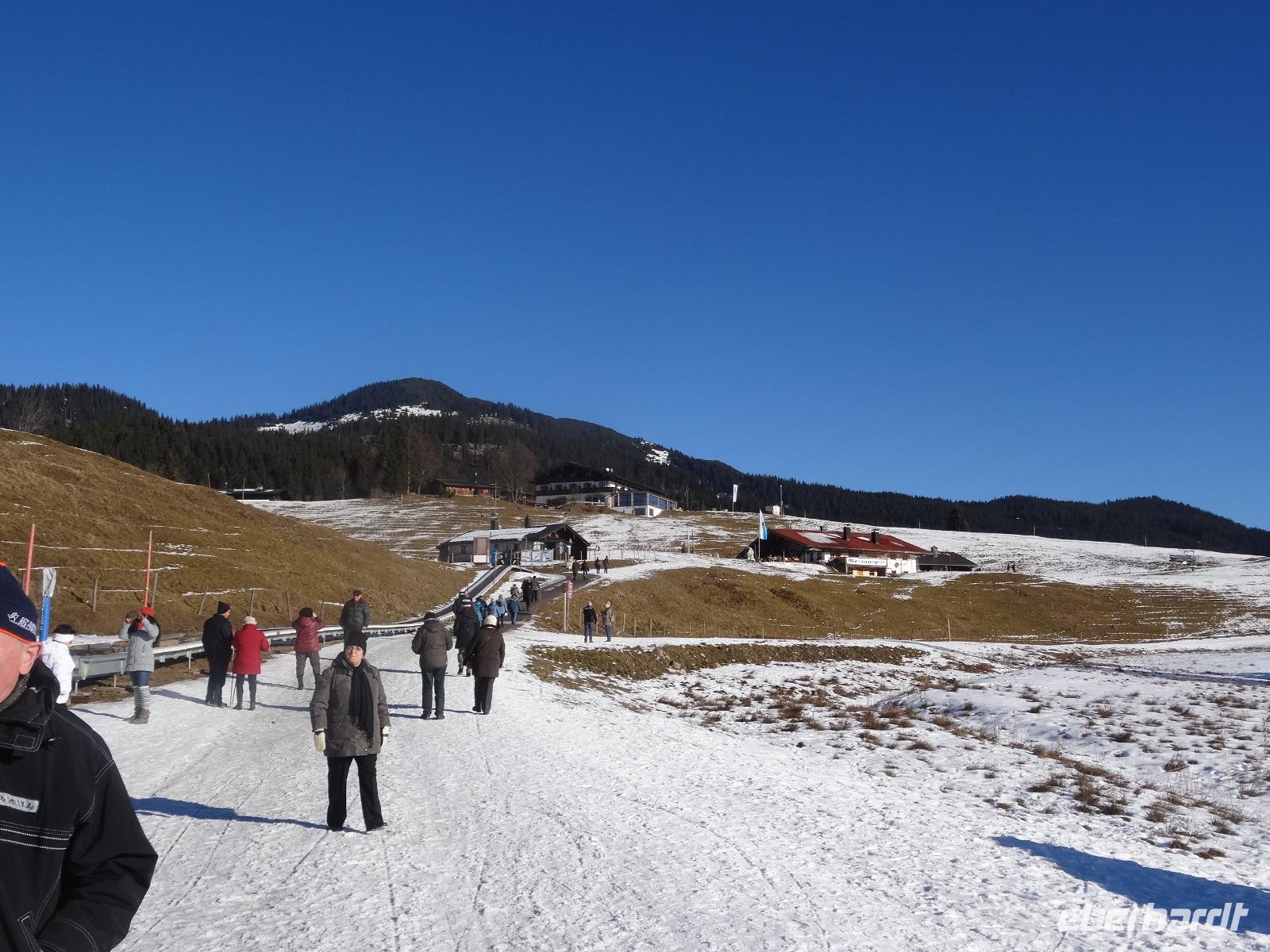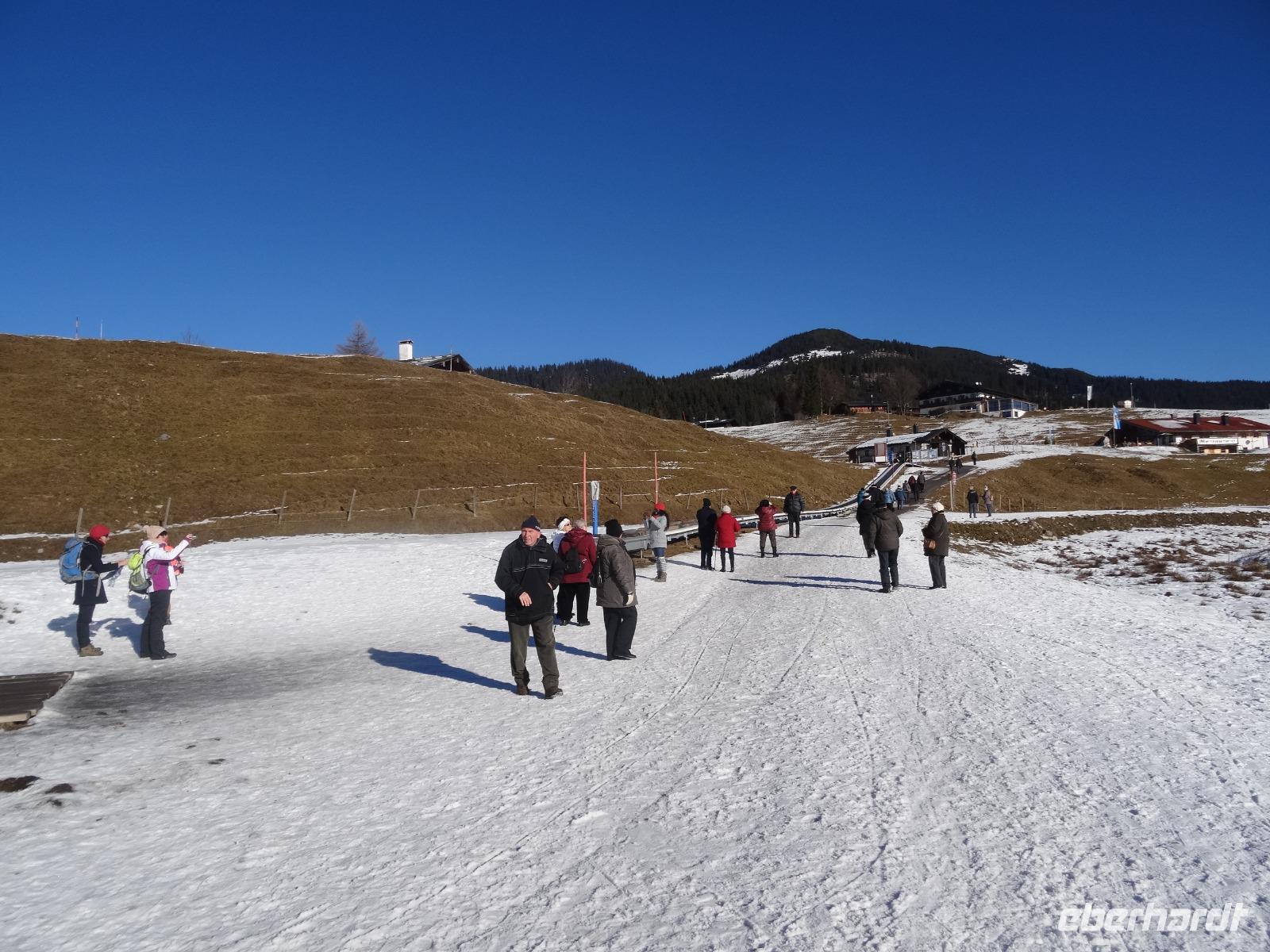 Nach einem Katerfrühstück starteten Sie mit dem Reisebus nach Traunstein, bereits auf der Reise war aller bestes Winter-Wetter, Raureif und leichter Schneegriesel, die Berge des Chiemgaus, des Berchtesgadener Landes oder weit nach Österreich zu den Loferer Steinbergen zeigten sich am Horizont. Über Siegsdorf und Ruhpolding, vorbei am Biathlontrainingszentrum und den Skischanzen erreichten Sie das Schwarzlofertal mit dem Parkplatz am Seegatterl zur Auffahrt mit der Kabinenbahn zur Winkelmoosalm.
