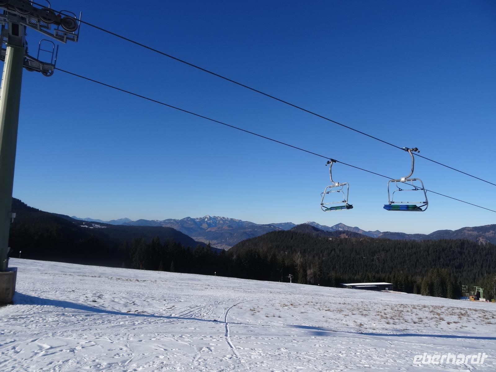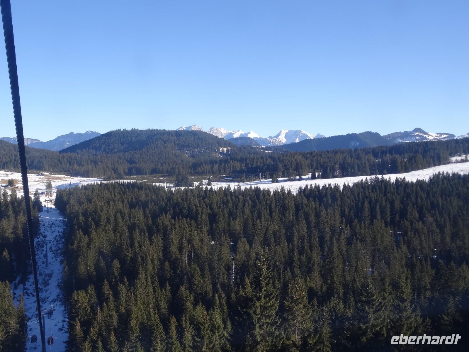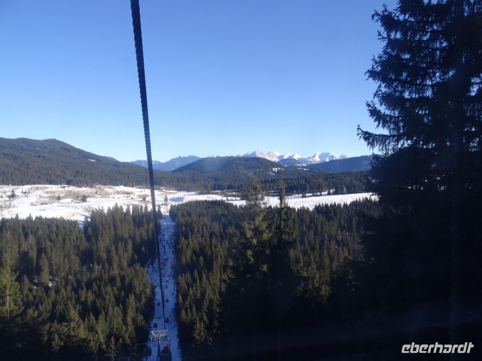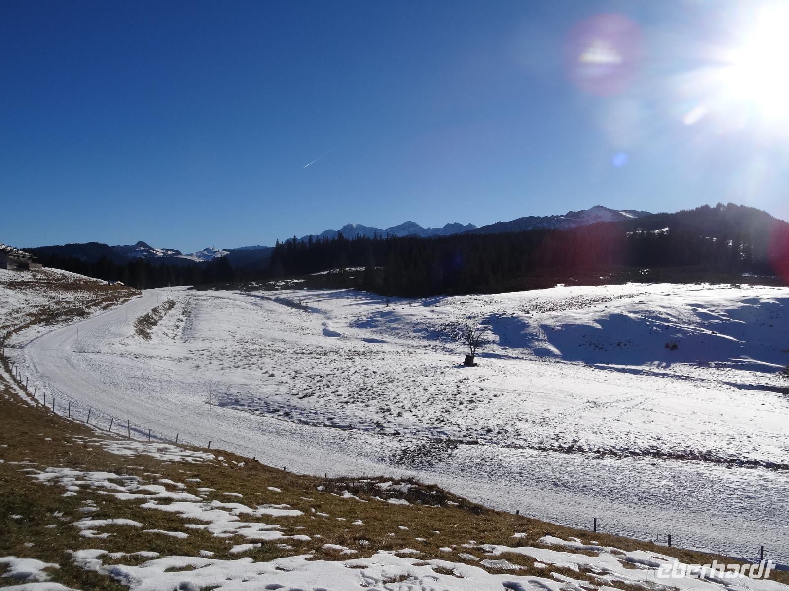 Nach einem Katerfrühstück starteten Sie mit dem Reisebus nach Traunstein, bereits auf der Reise war aller bestes Winter-Wetter, Raureif und leichter Schneegriesel, die Berge des Chiemgaus, des Berchtesgadener Landes oder weit nach Österreich zu den Loferer Steinbergen zeigten sich am Horizont. Über Siegsdorf und Ruhpolding, vorbei am Biathlontrainingszentrum und den Skischanzen erreichten Sie das Schwarzlofertal mit dem Parkplatz am Seegatterl zur Auffahrt mit der Kabinenbahn zur Winkelmoosalm.